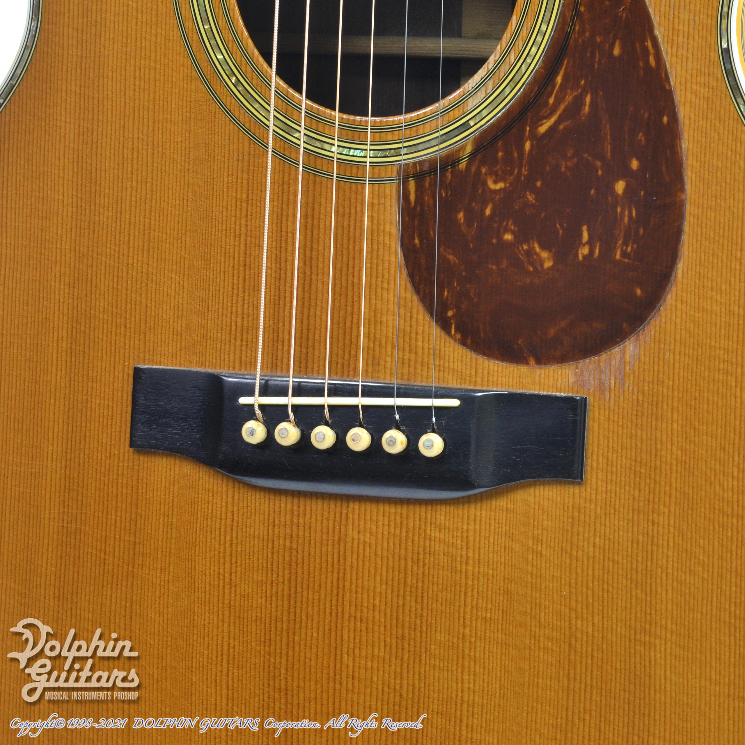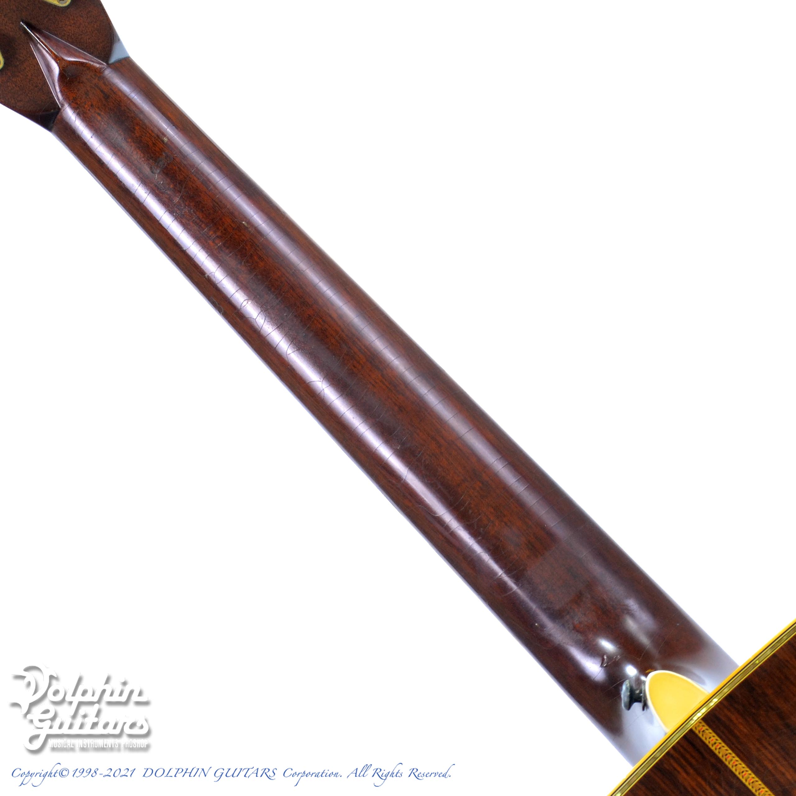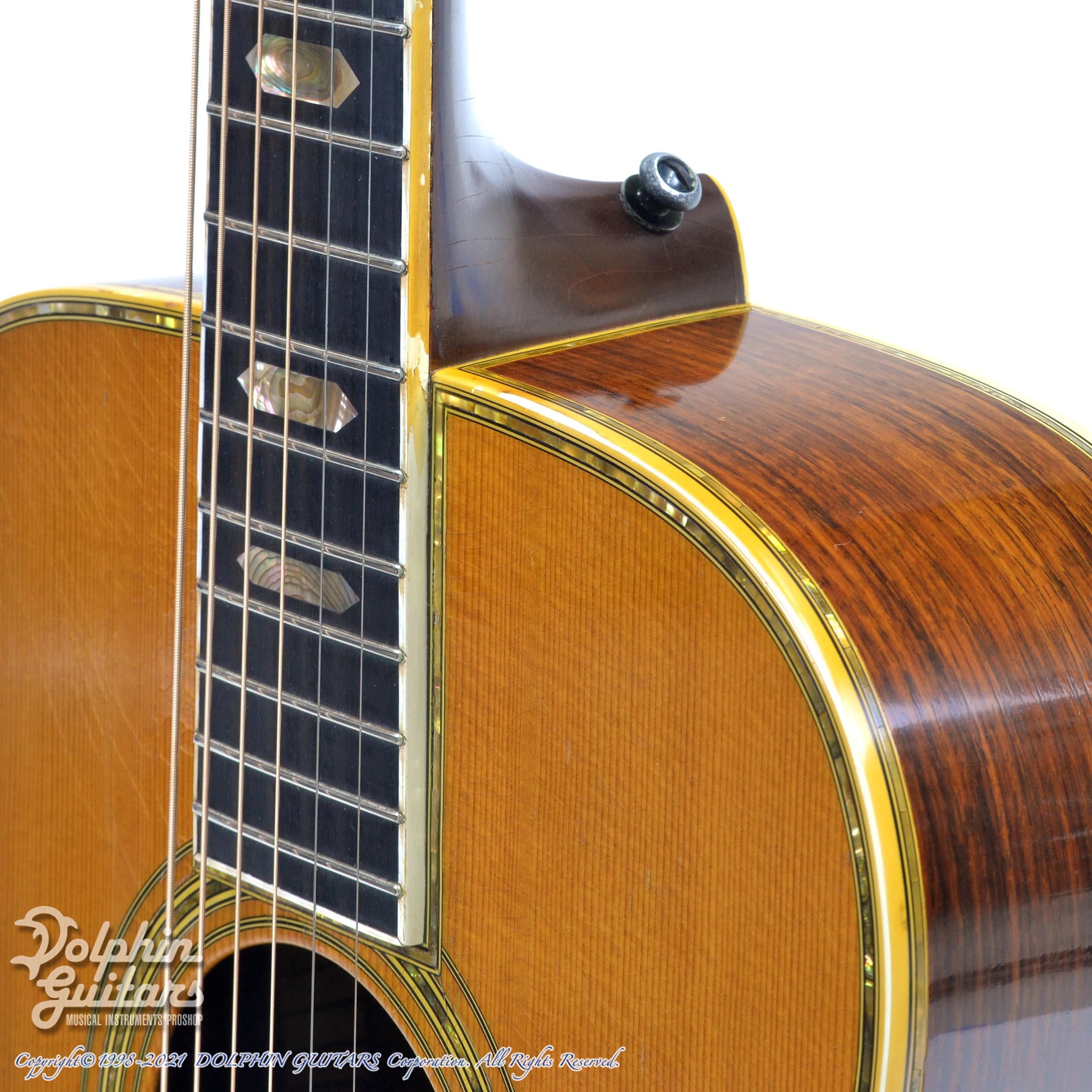 赤茶色のピックガード、無垢材のアバロン細工、渋く仕上がったボディが醸し出す大変良い雰囲気です。ボディはノークラックで、ナット&サドル などの消耗パーツ以外はオリジナルを保っており、今まで大切に弾かれてきたであろうことが伝わってきます。