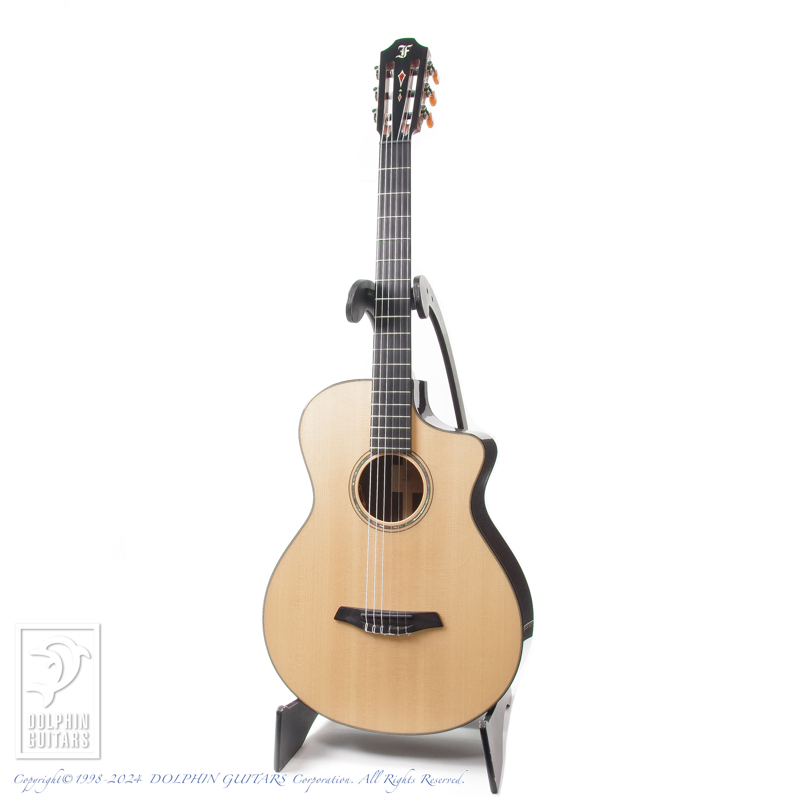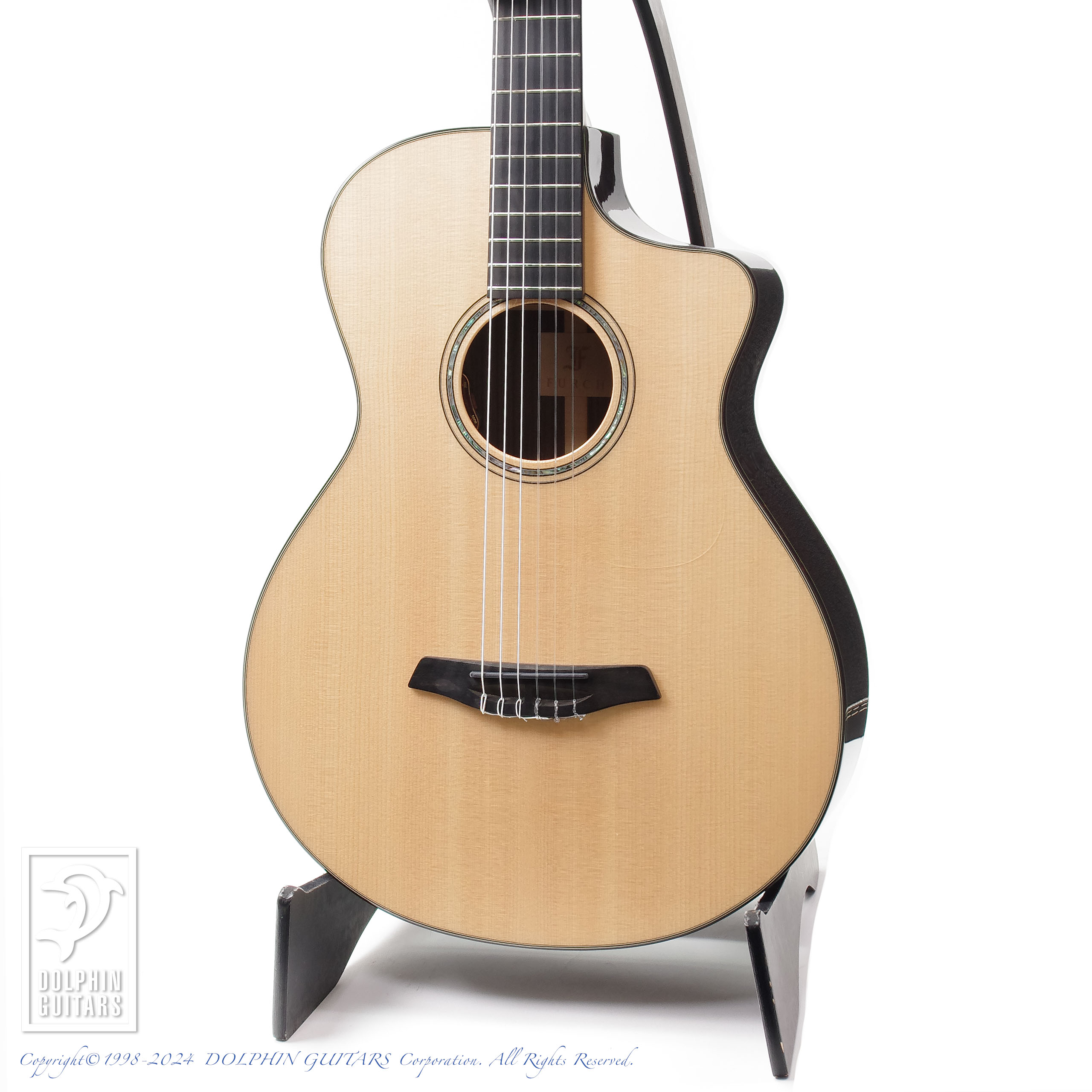 エレガットは伝統的なクラシックギター〜モダンスペックとの間のどこに位置するかがポイントとなってきますが、こちらのモデルはとことんモダン寄り。フォルヒの流れるような美しいシェイプのカッタウェイボディに、ネックはスティールストリングスと同設計の45mm幅、抱え心地、弾き心地は鉄弦モデルのそれと何ら違和感ございません。12フレットジョイントのナイロン弦らしいふくよかな響きはちゃんと表現できており、非常に好バランスです。