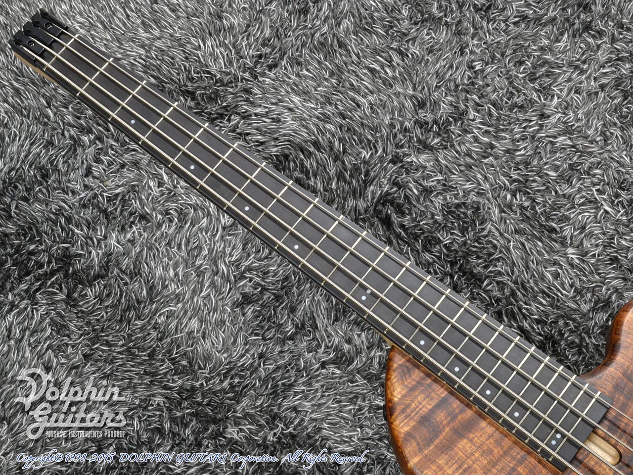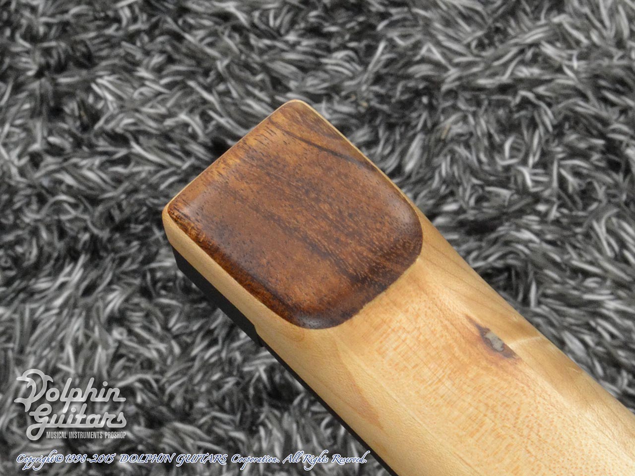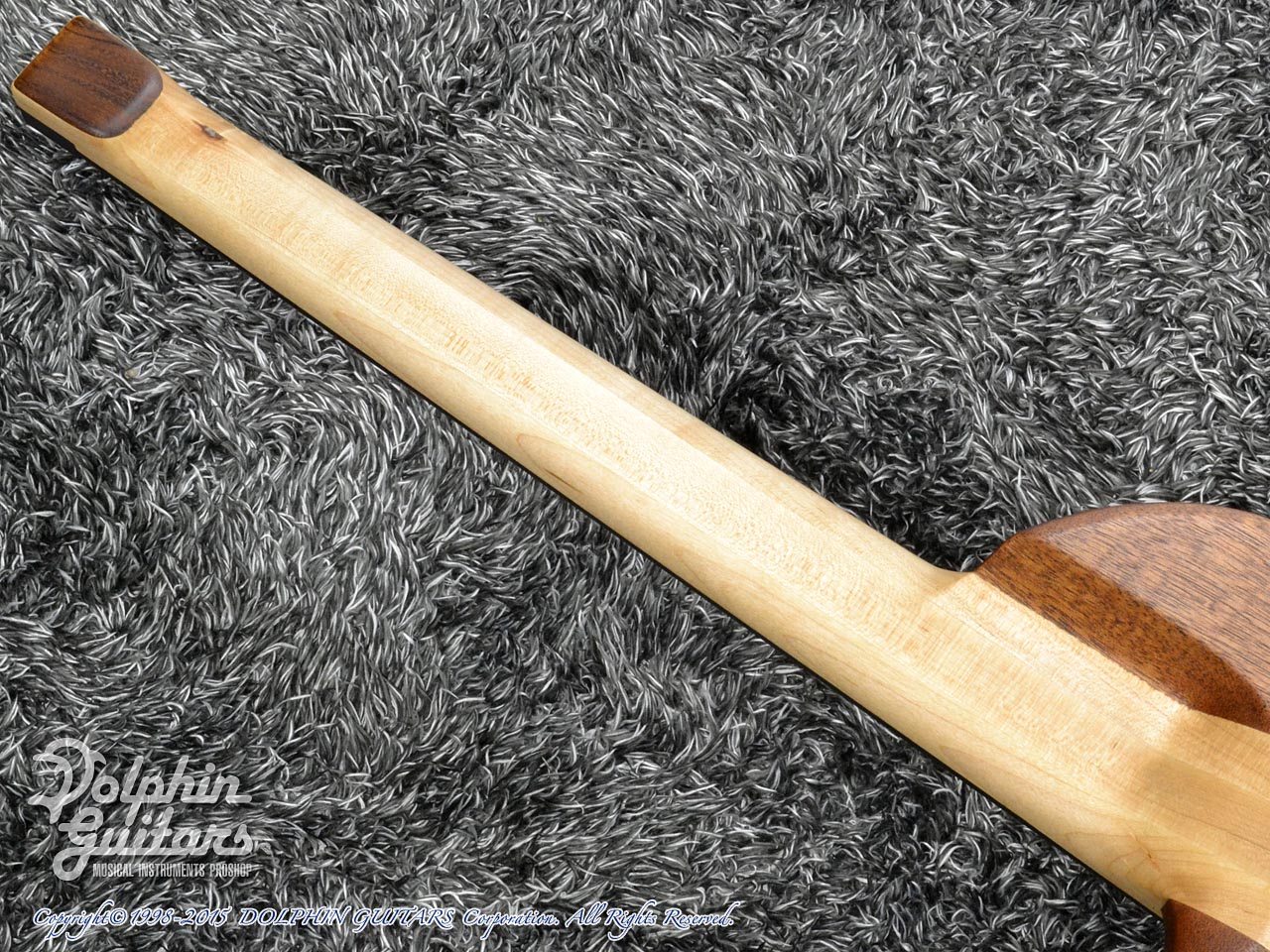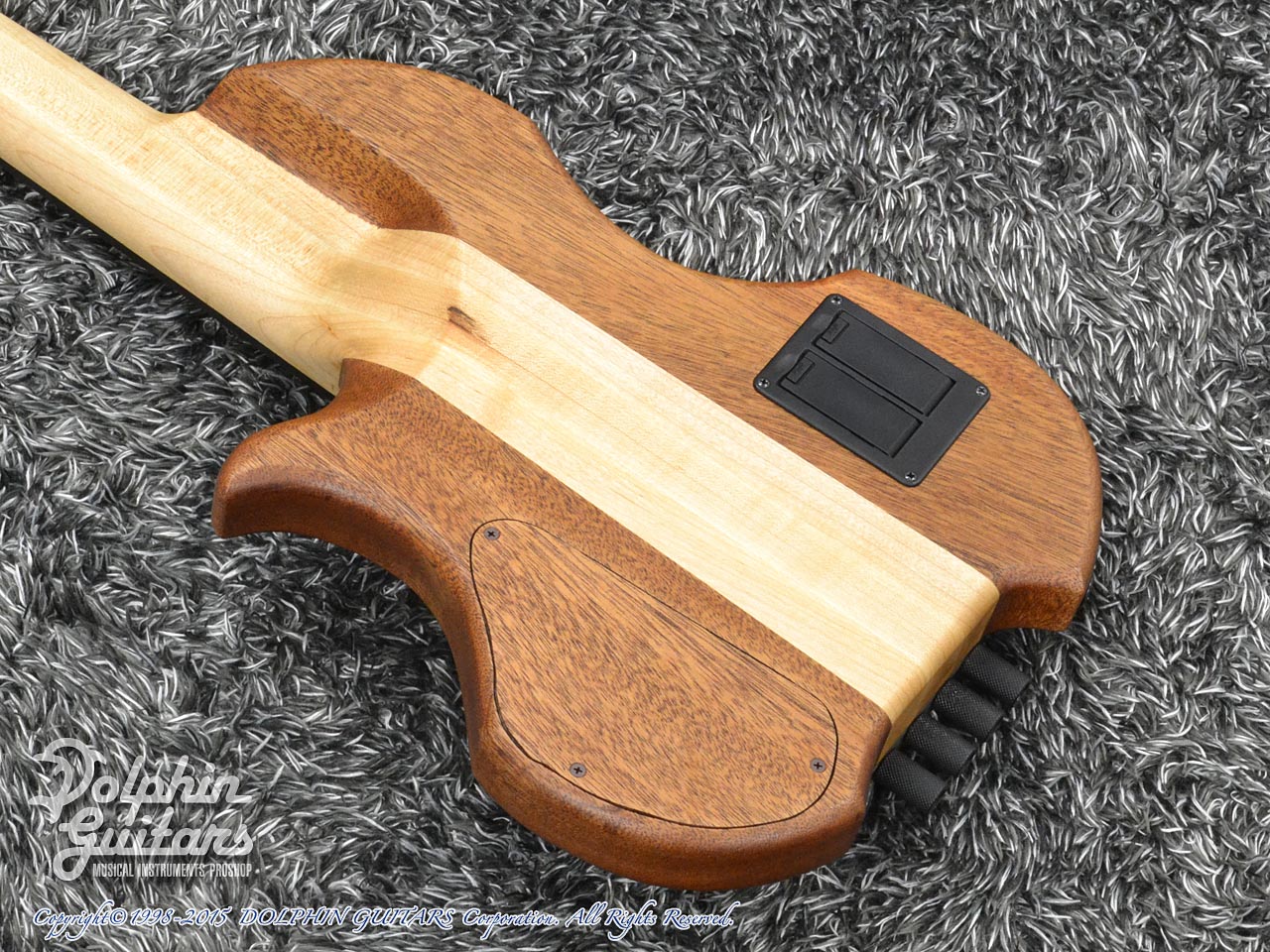 カーリーコア・トップ、マホガニー・バック、ハード・メイプル・ネック(ネックスルー)、エボニー指板、USA HIPSHOT製ヘッドレスユニット、EMG 35TW搭載。