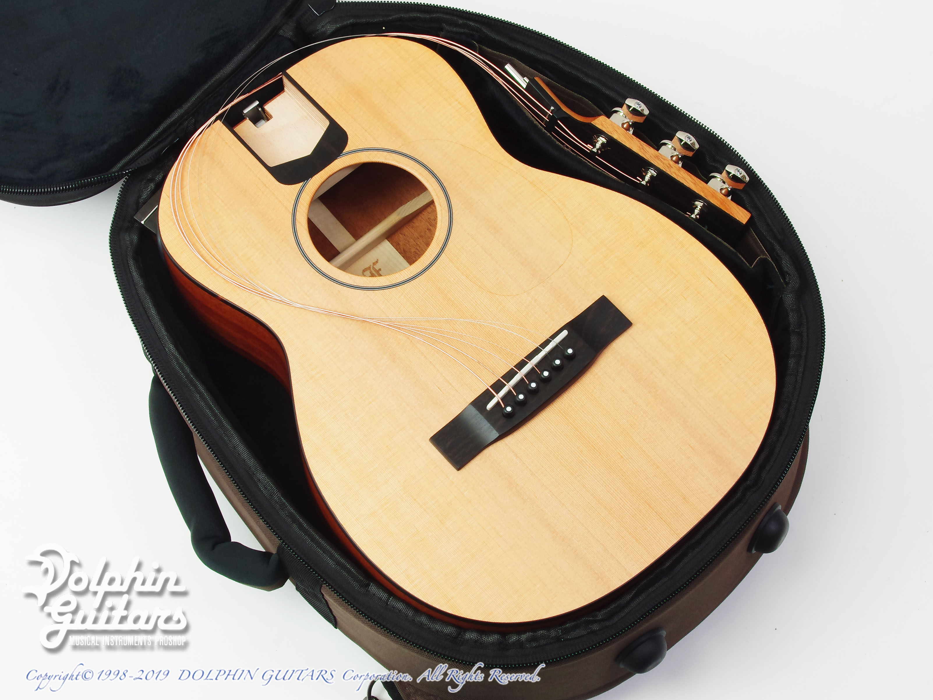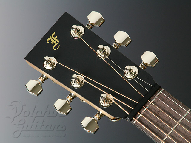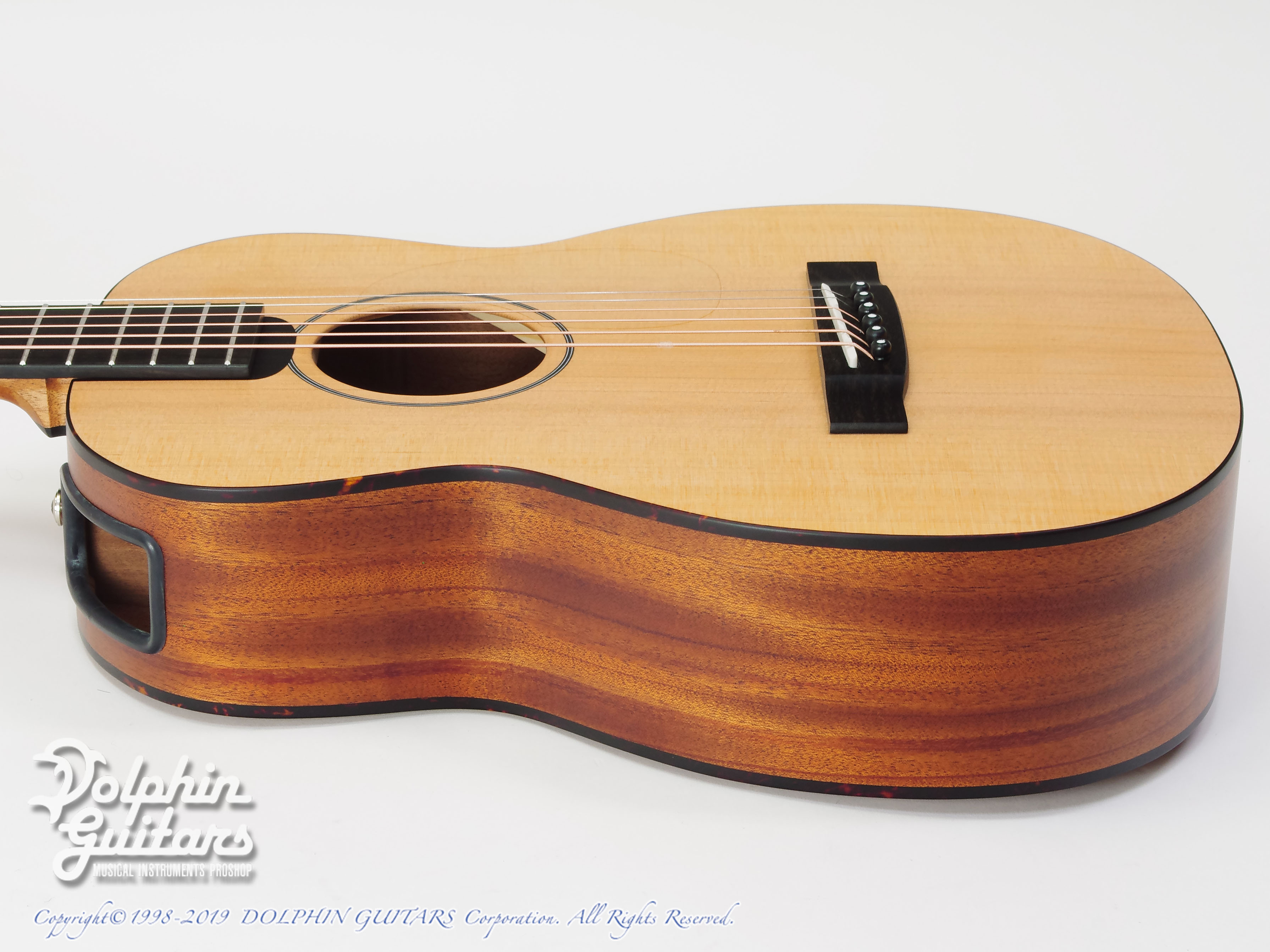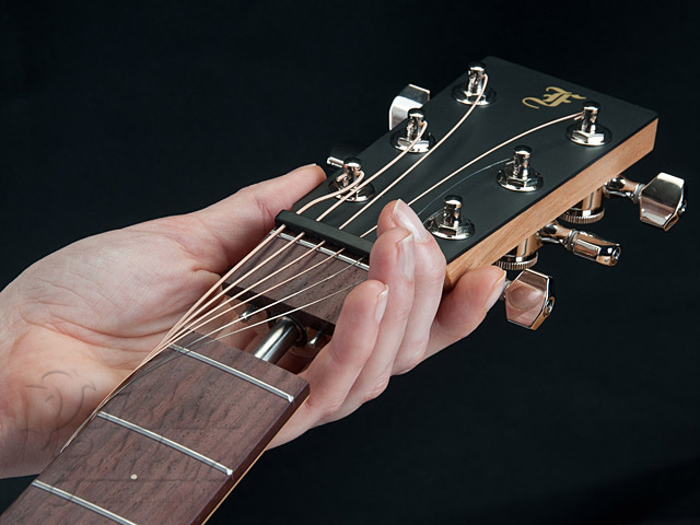 シダートップ、マホガニーS&B、マホガニーネック、ローズウッド指板&ブリッジ、44,5mmナット、615mmスケール、ロック式ペグ。