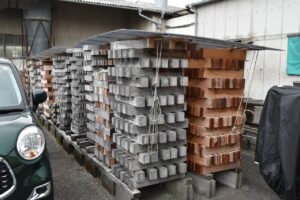 それでは工場見学・・・の前に一際目につく井桁状に積まれた大量の木材たちは、なんとネック用のマホガニー材たち。