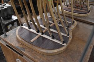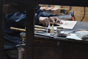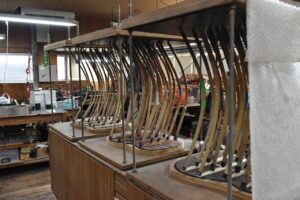 こちらは、バックのブレーシングの貼り付け作業をしている様子です。様々なサイズのノミを使いこなし、ブレーシングをはめていきます。