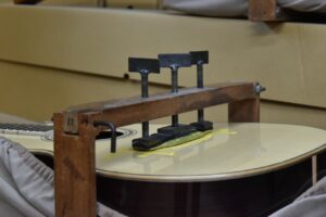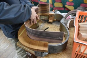 この後、サイド&バックの接着、そしてトップが貼り付けられ、アコースティックギターのボディとなっていきます。
