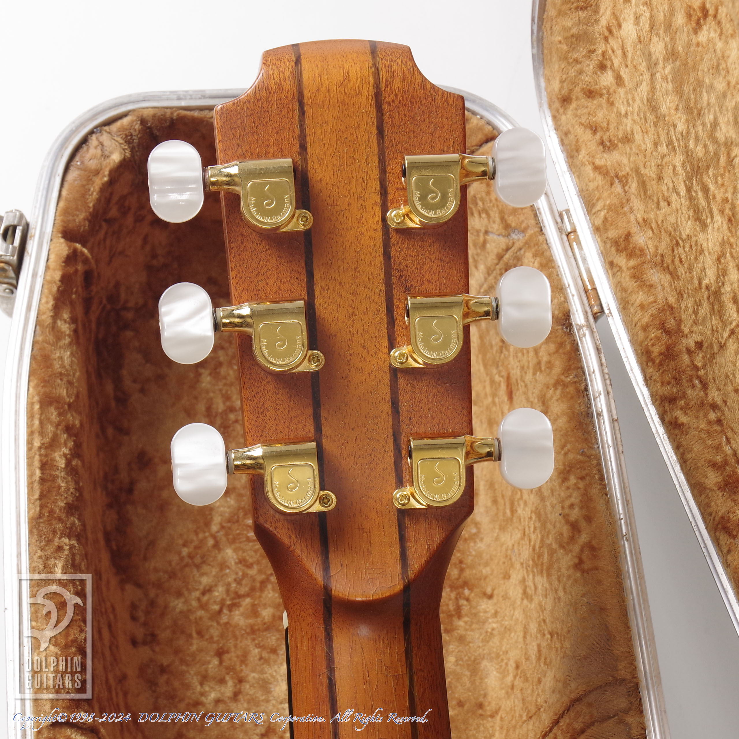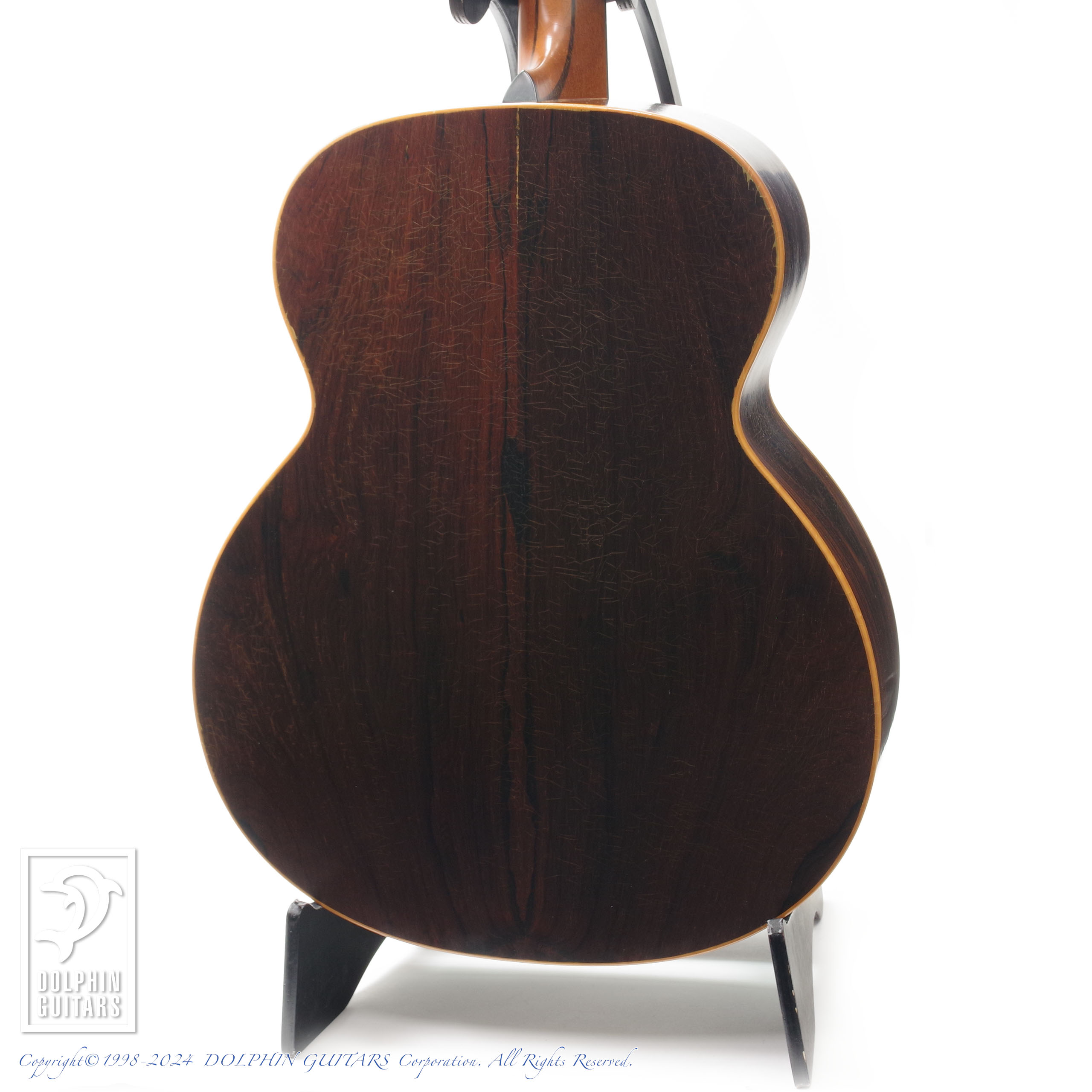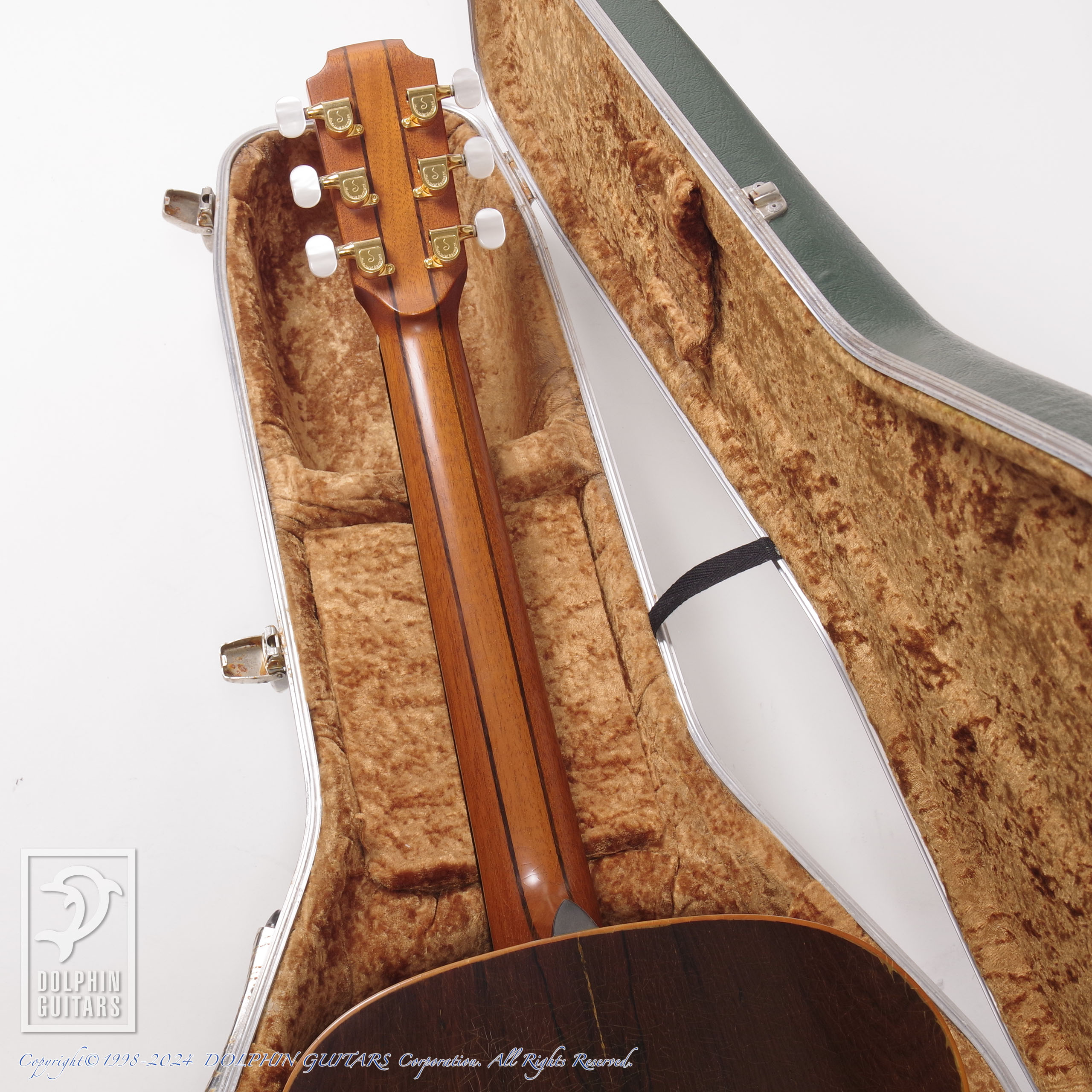 画像でも確認できるように塗装面のラッカーチェックがボディやネック全体的に見られ、貫禄あるルックスです。過去にフレット交換が施されており、フレット高さも十分で、出音の発音の良さやコードの分離の良さを感じさせます。ネックの反りも見られず、トラスロッドの効きもよく、左右に十分余裕を残してます。ボディトップ・ブリッジ周りの前傾するような変形も見られませんので、強度面でも安心してお使いいただけます。