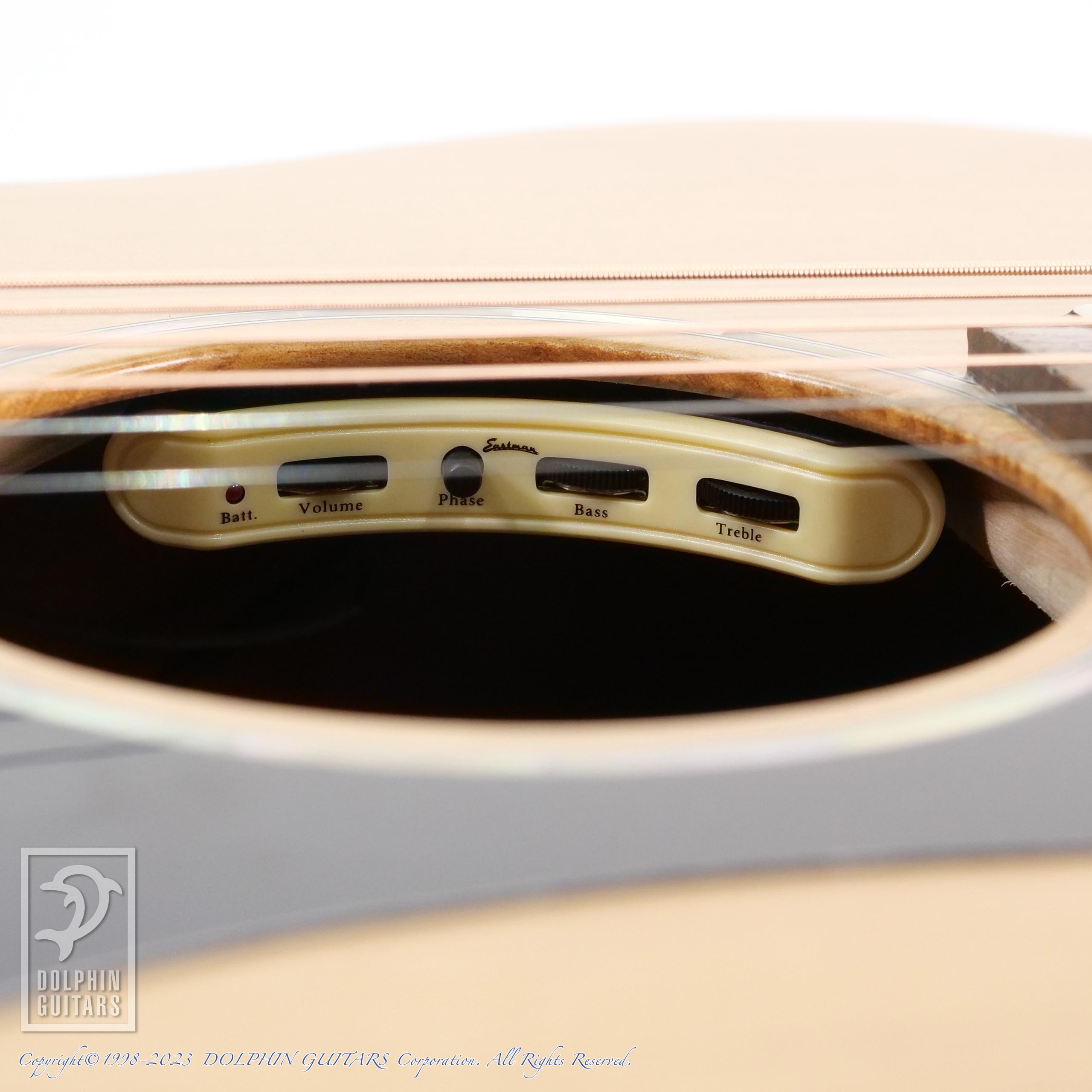 イーストマンのフラットトップシリーズの中でも特にコストを抑えたモデルでありながら、妥協のないクオリティに驚かされます。窯の中で木材を低温で焼くことで湿気を取り除き、新品でありながらヴィンテージ品のような経年変化を感じさせる、独自のサーモキュア処理を施した単板のスプルースを採用しています。また、当社が傘下に収めるハイエンドブランドであるボジョアギターズのメゾットによる、独自のフィニッシュ「トゥルートーンフィニッシュ」はギターの音色を損ねることのないように構成されています。