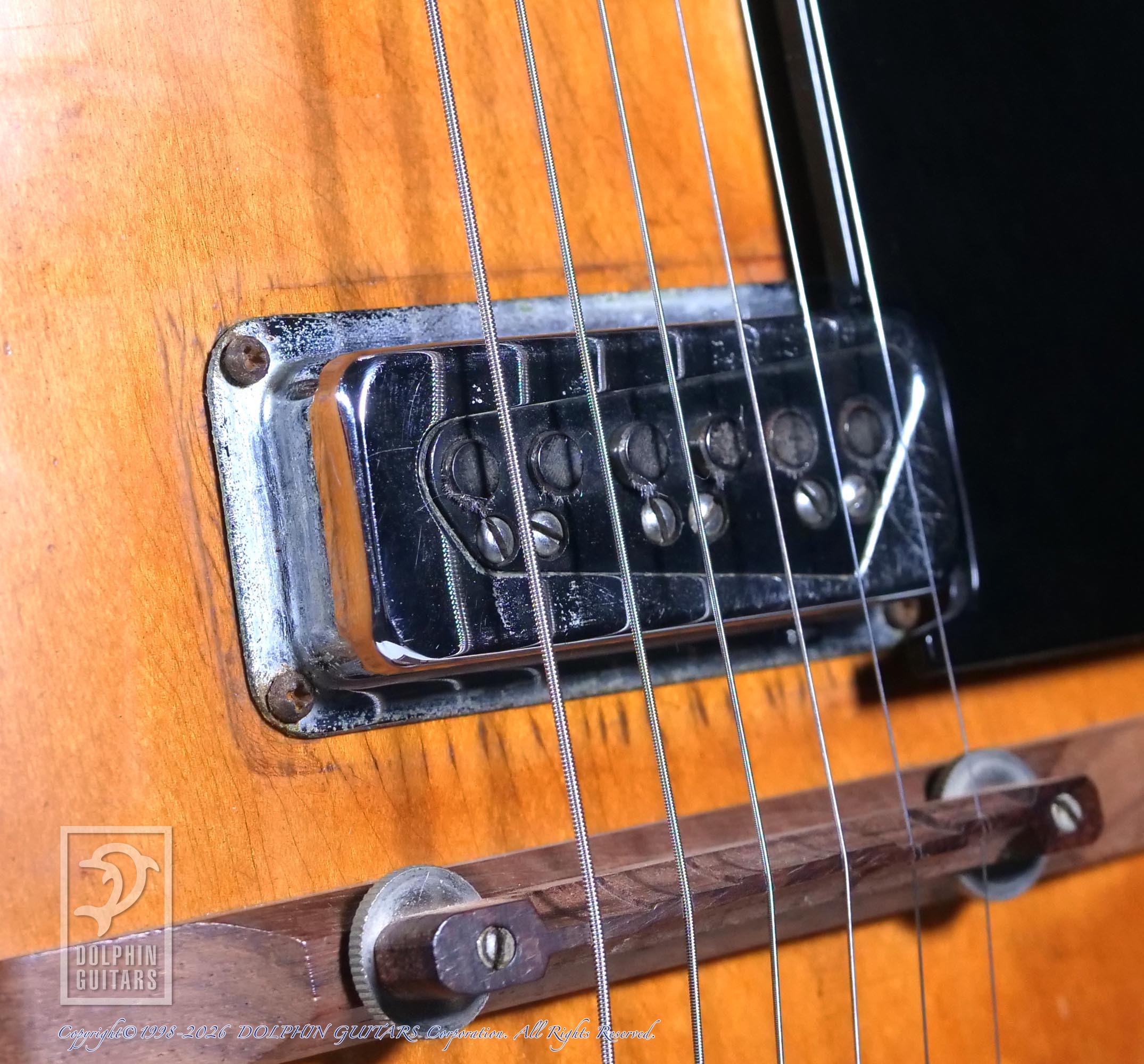 両ピックアップのエスカッションの欠品、全体的に小さな傷や塗装の曇りや剥げなどが年代相応に確認できますが、ビンテージギターならではの風合いや味わいとして十分に魅力的な状態です。