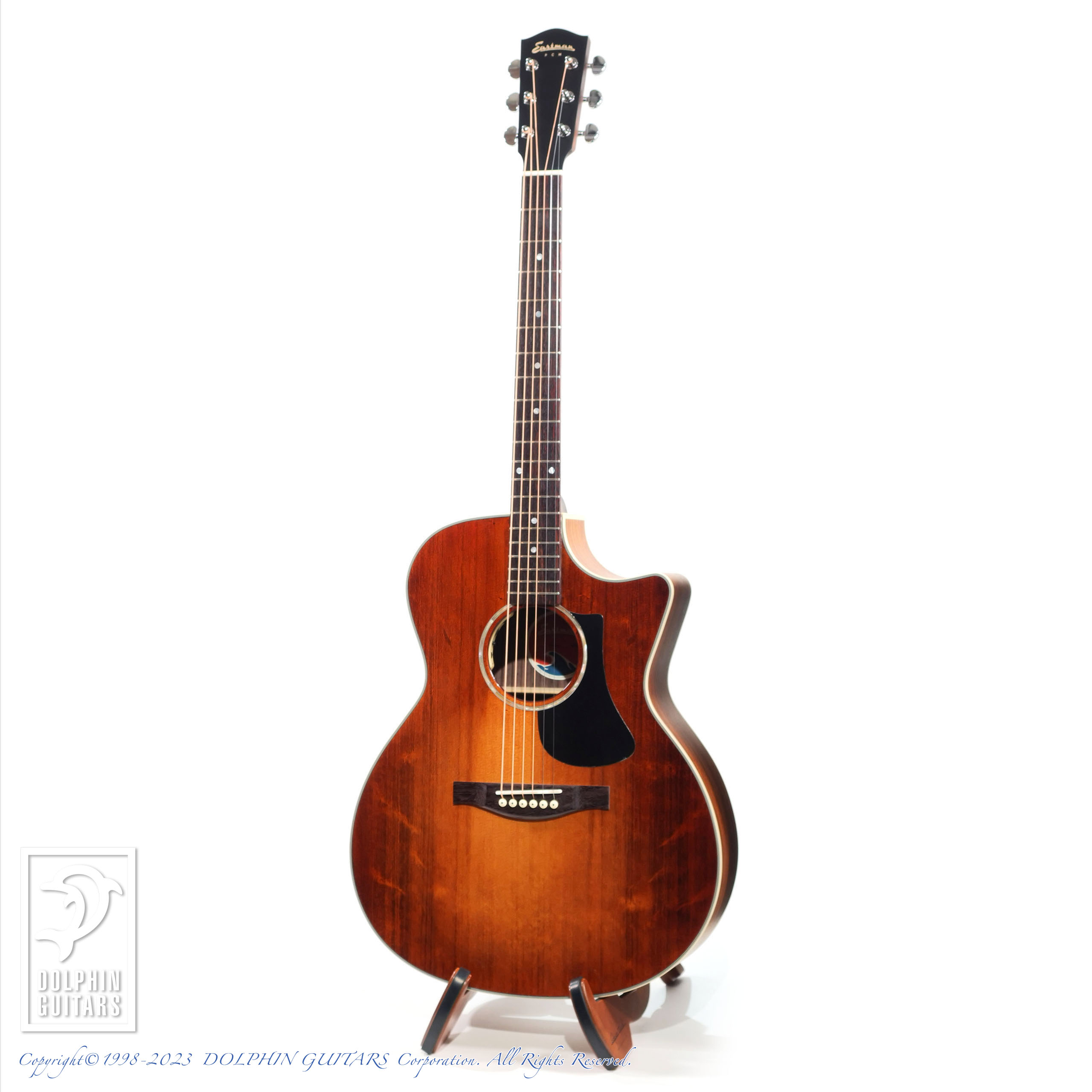 イーストマンのフラットトップシリーズの中でも特にコストを抑えたモデルでありながら、妥協のないクオリティに驚かされます。窯の中で木材を低温で焼くことで湿気を取り除き、新品でありながらヴィンテージ品のような経年変化を感じさせる、独自のサーモキュア処理を施した単板のスプルースを採用しています。また、当社が傘下に収めるハイエンドブランドであるボジョアギターズのメゾットによる、独自のフィニッシュ「トゥルートーンフィニッシュ」はギターの音色を損ねることのないように構成されています。