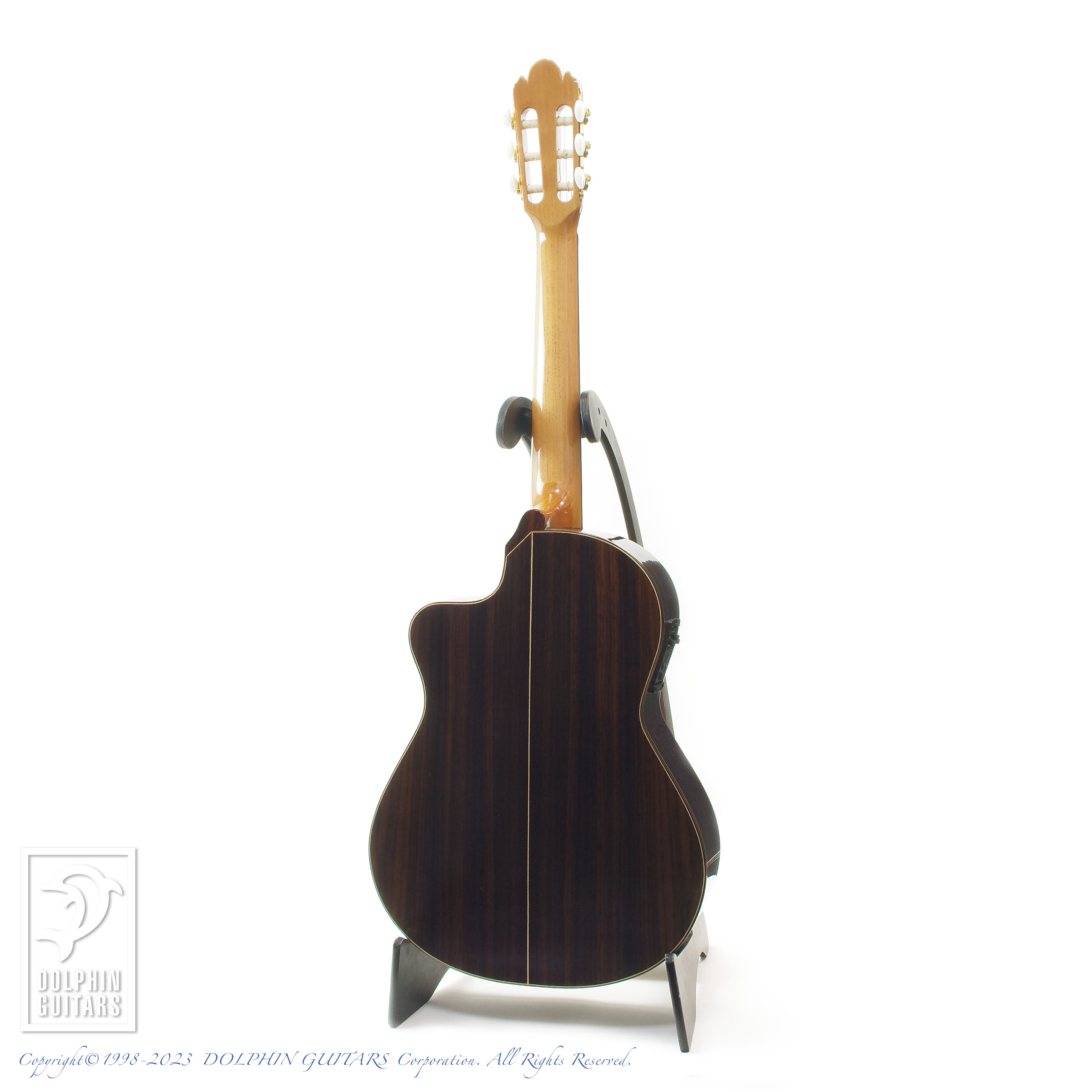現代のナイロン弦モデルの人気が高まるのに伴い、各社 新たなスペックを導入してますが、本モデルは48mmナット幅のスリムネックを採用し、アジャスタブルロッドを仕込み、指板サイドにて3F / 5F / 7Fにポジションマークを配置し、PUシステムにはアンダーサドルPUとコンデンサーMICをMixするFISHMAN Pro Blendシステムを搭載。手元のコントロールで3バンドEQやPUとMICのバランサー、フリーケンシー、ノッチフィルターを装備しております。ライヴのメイン機としてはもちろん、生音のみでも十分にお楽しみいただける個体です。