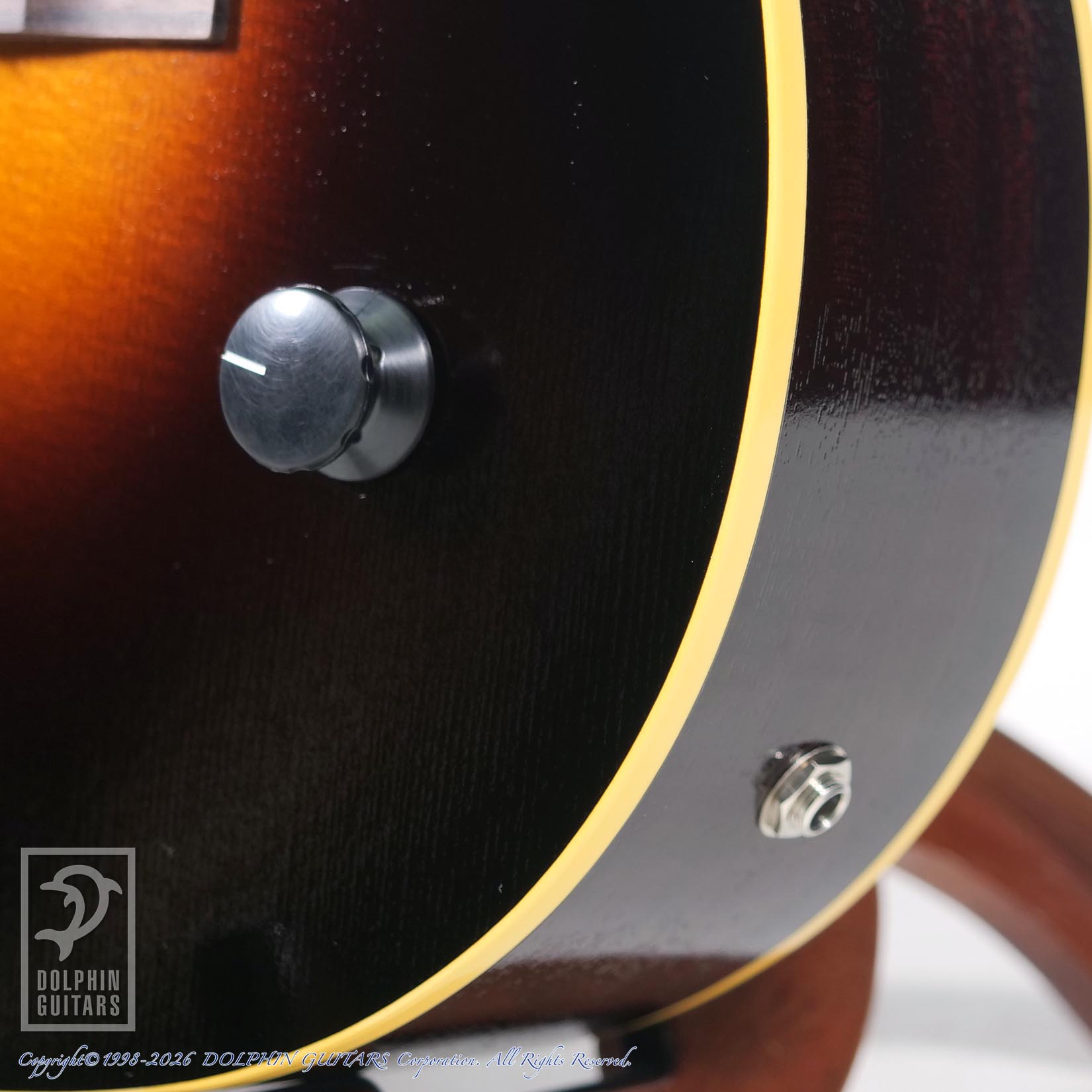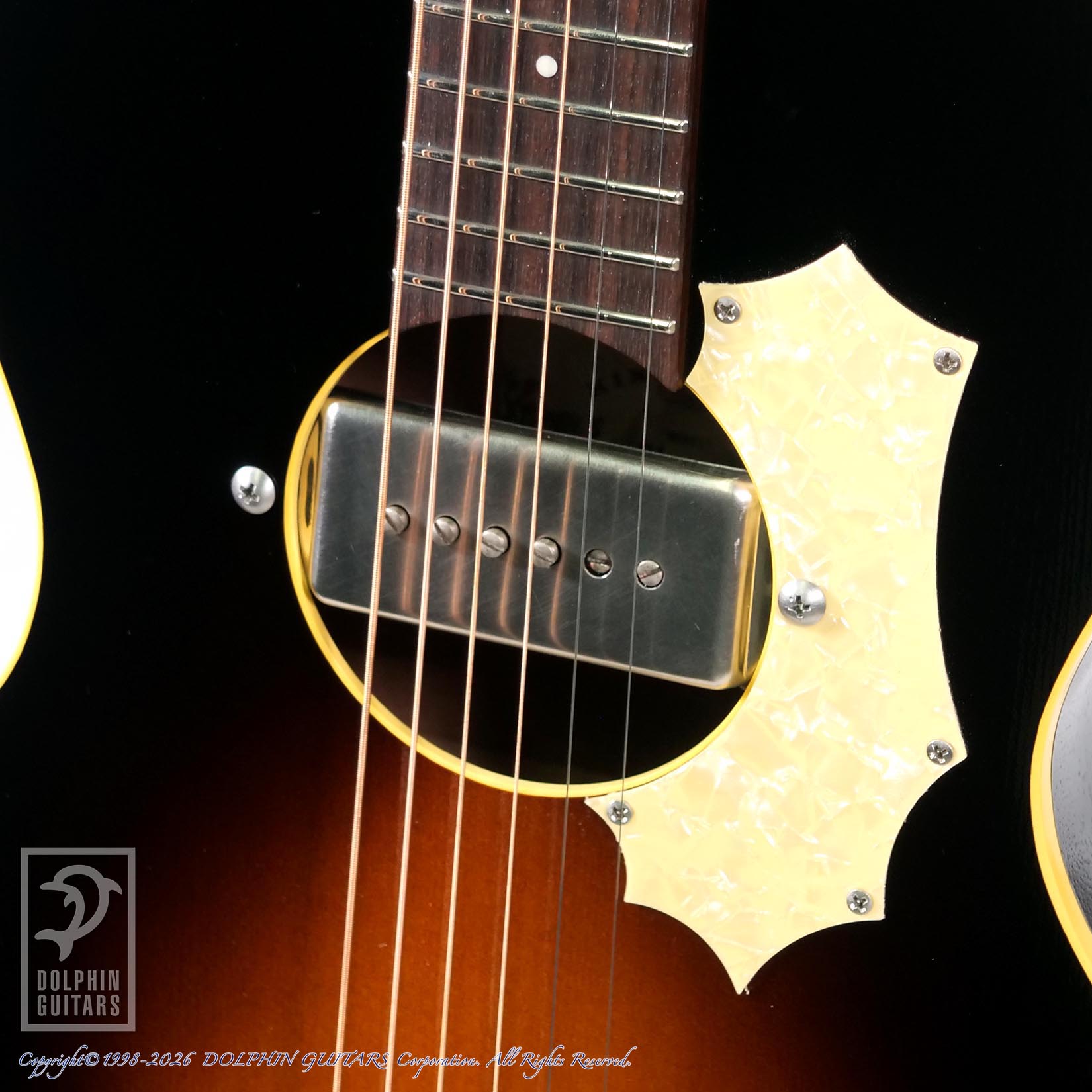 男らしく勇ましいピックアップが搭載された本モデル。ギラついたピックアップカバーに身を纏ったP-90スタイルのオリジナルピックアップ(アコースティックギター用に開発)をサウンドホールにネジ止め、そしてピックガードもネジ止め、1ボリュームのみ、おそらく令和8年に於いてカッコ良い意味で、もっとも時代遅れなスペックを持ちます。