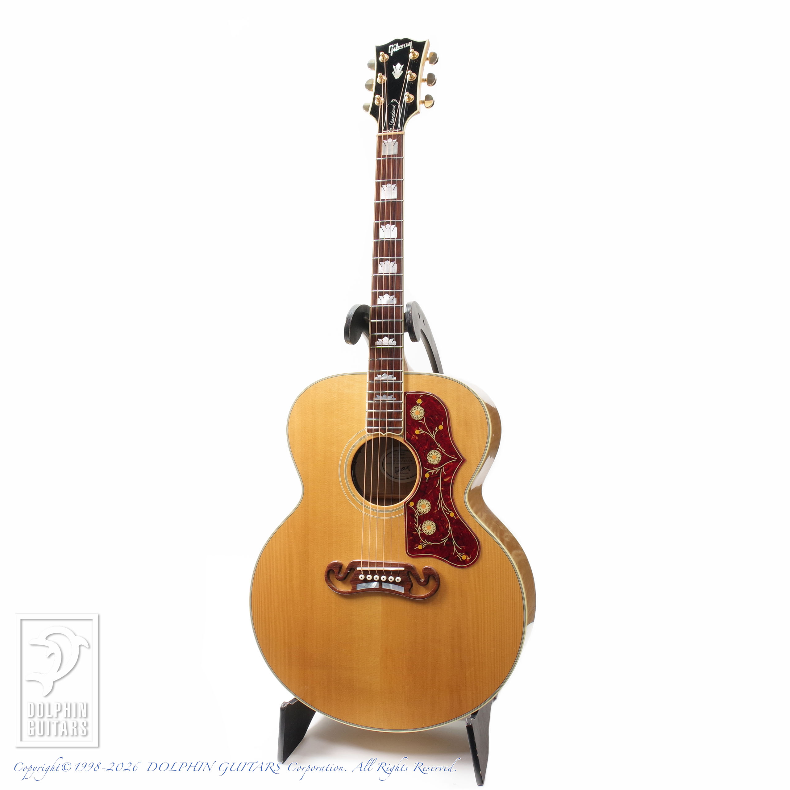 大型ボディ、花柄ピックガード、ムスタッシュ(ひげ)ブリッジが特徴的な『フラットトップの王様』という異名を持つスーパージャンボの現行機種 SJ-200 Standard 2010年製のUSED品。