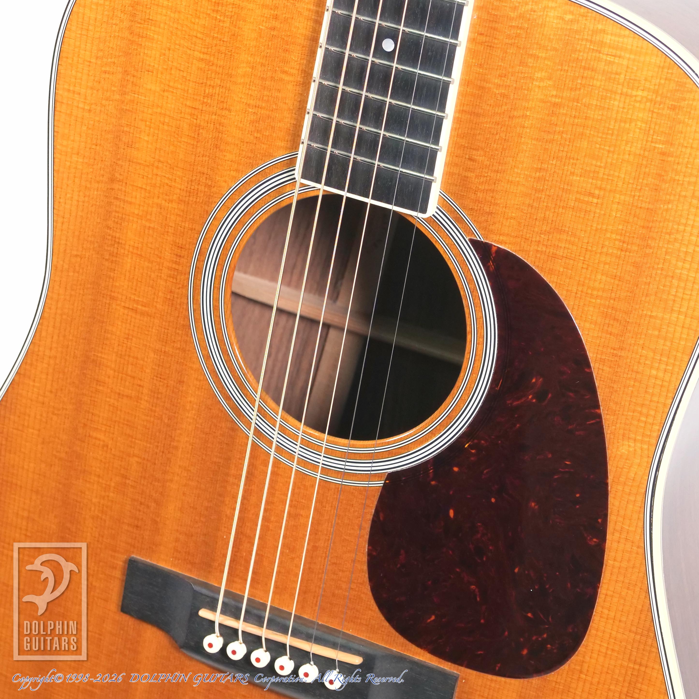 D-28との決定的な違いは、D-35のトップバックのブレイシングに00や000に用いられる細いものが採用されている点。それにより生み出される繊細で甘いサウンドは、3フィンガーでのきらびやかな高音域、特にそのバランスの良さと優しい音色は「歌もの」の伴奏に於いてはピカイチでしょう。