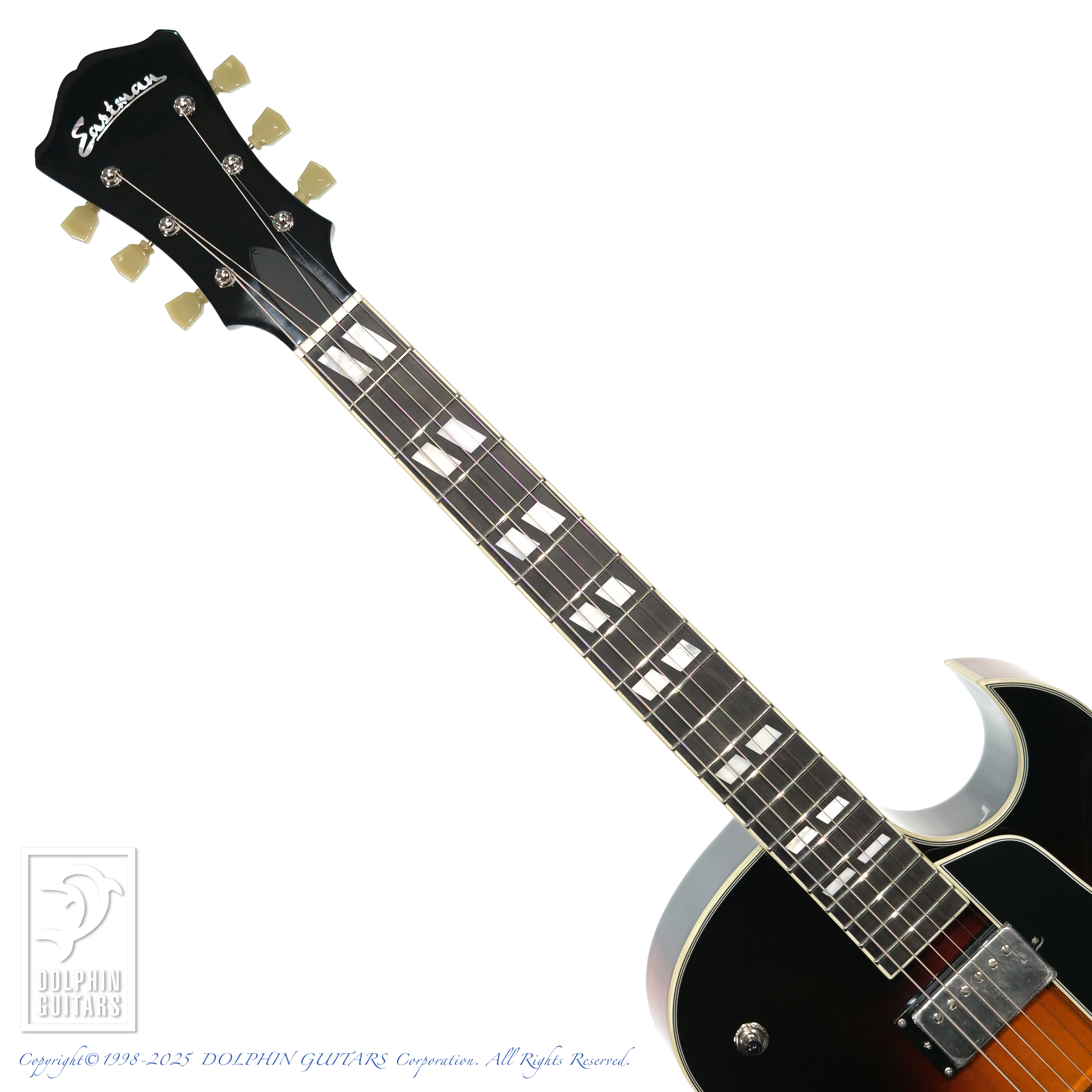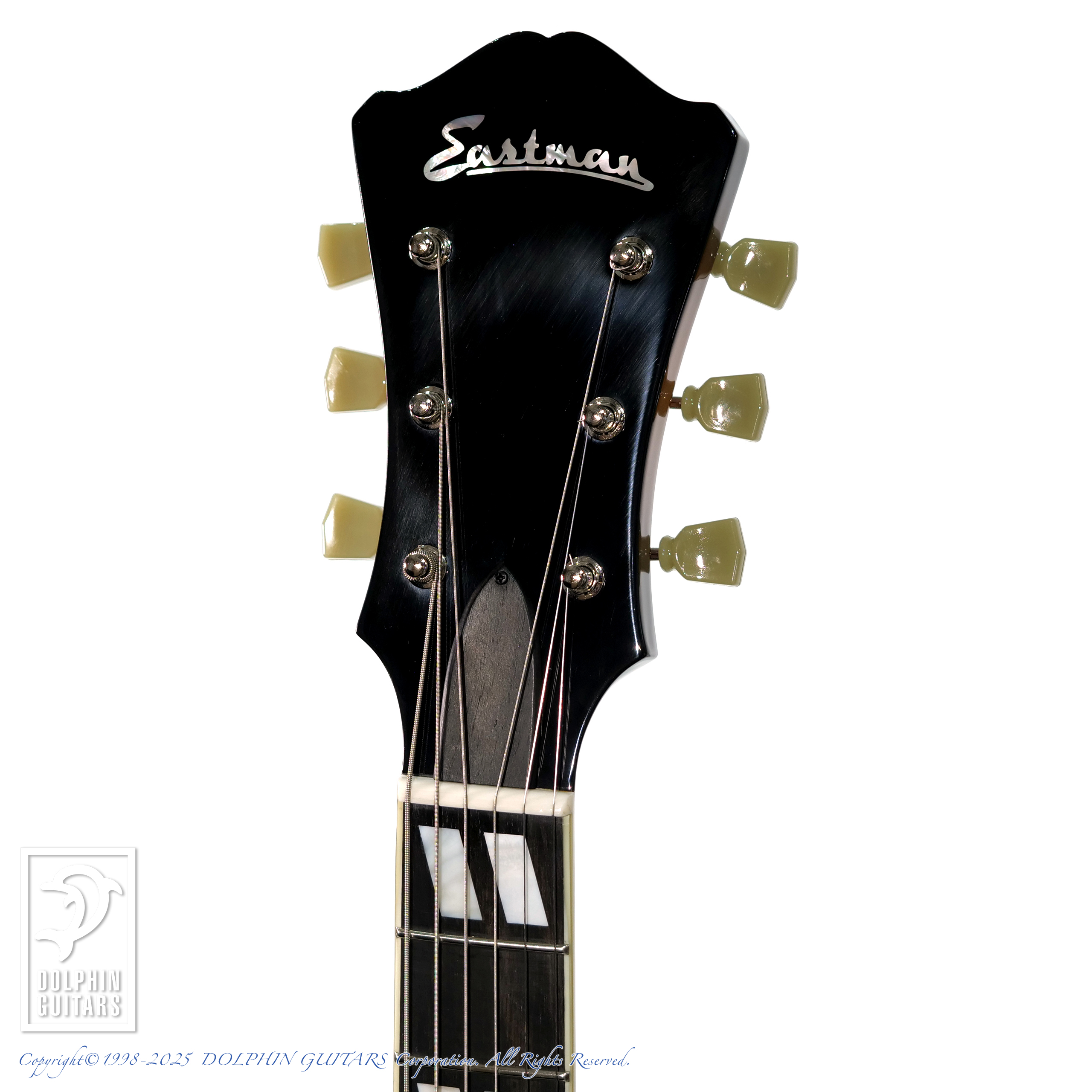 トップ単板削り出しボディを得意とするイーストマンならではの、程よい空気感のあるラミネイトボディから生み出される響きは、王道ながらもふくよかさを感じさせる良質な響き。フラットピックでタイトなジャズをキメるのも良し、フィンガーピッキングでの味わうのも良しなサウンドです。