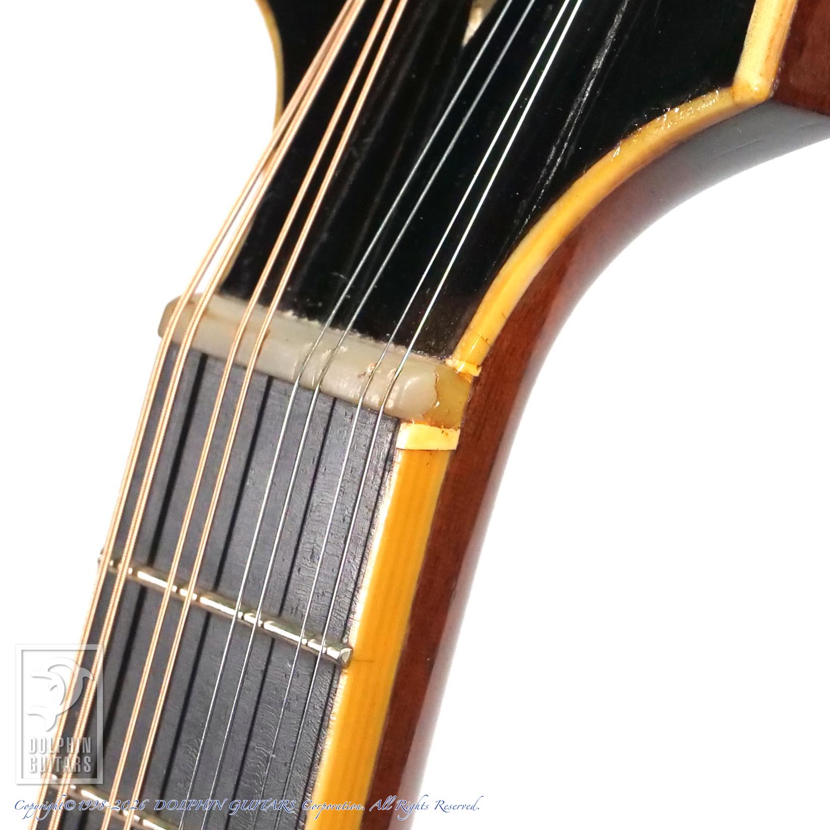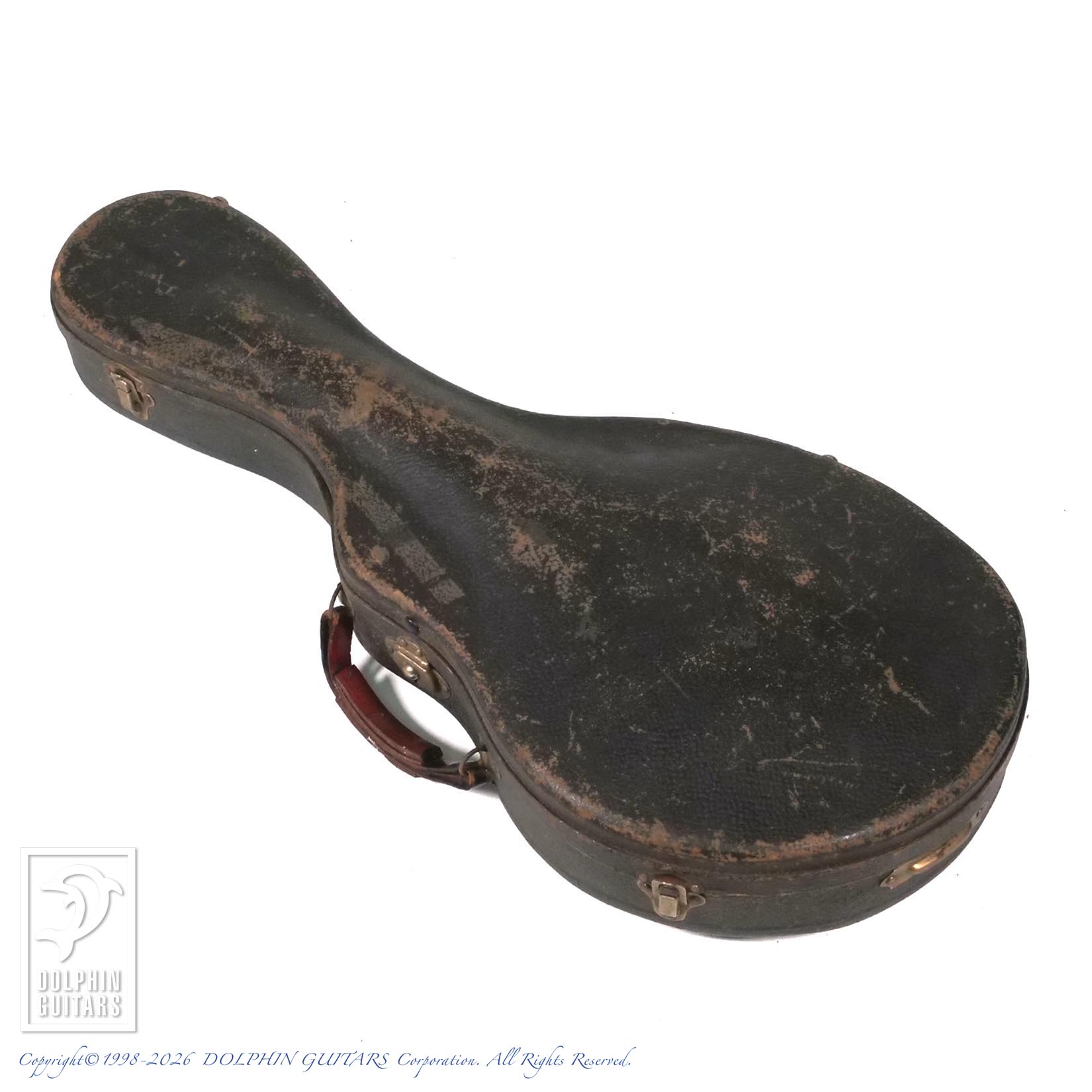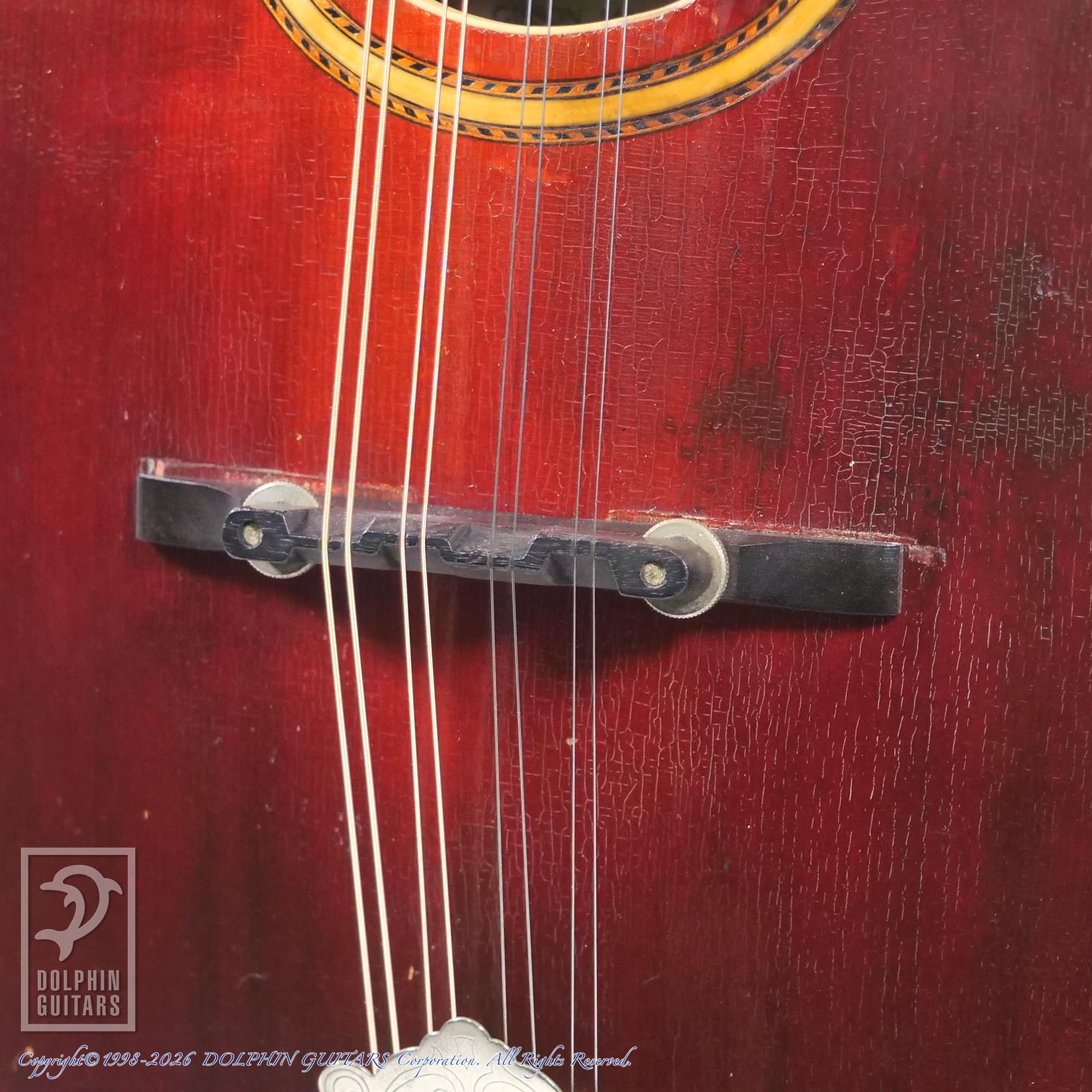 トップに二箇所薄らとしたクラックがございますが、リペア済みで使用上は問題ございません。おそらくネックは過去にオーバーラッカー(シェラック?)がされていると思われ、少し塗装のツヤが出ているため、左手の操作性は向上しているように感じます。またネックバインディングの数ミリの継ぎ足しも確認できますが、あまり目立ちません。当店入荷後、弦高調整済みで、ヴィンテージマンドリンに有りがちな弾きにくさは皆無、ネックコンディションも素晴らしく、ハイポジションまでスイスイと演奏可能です。