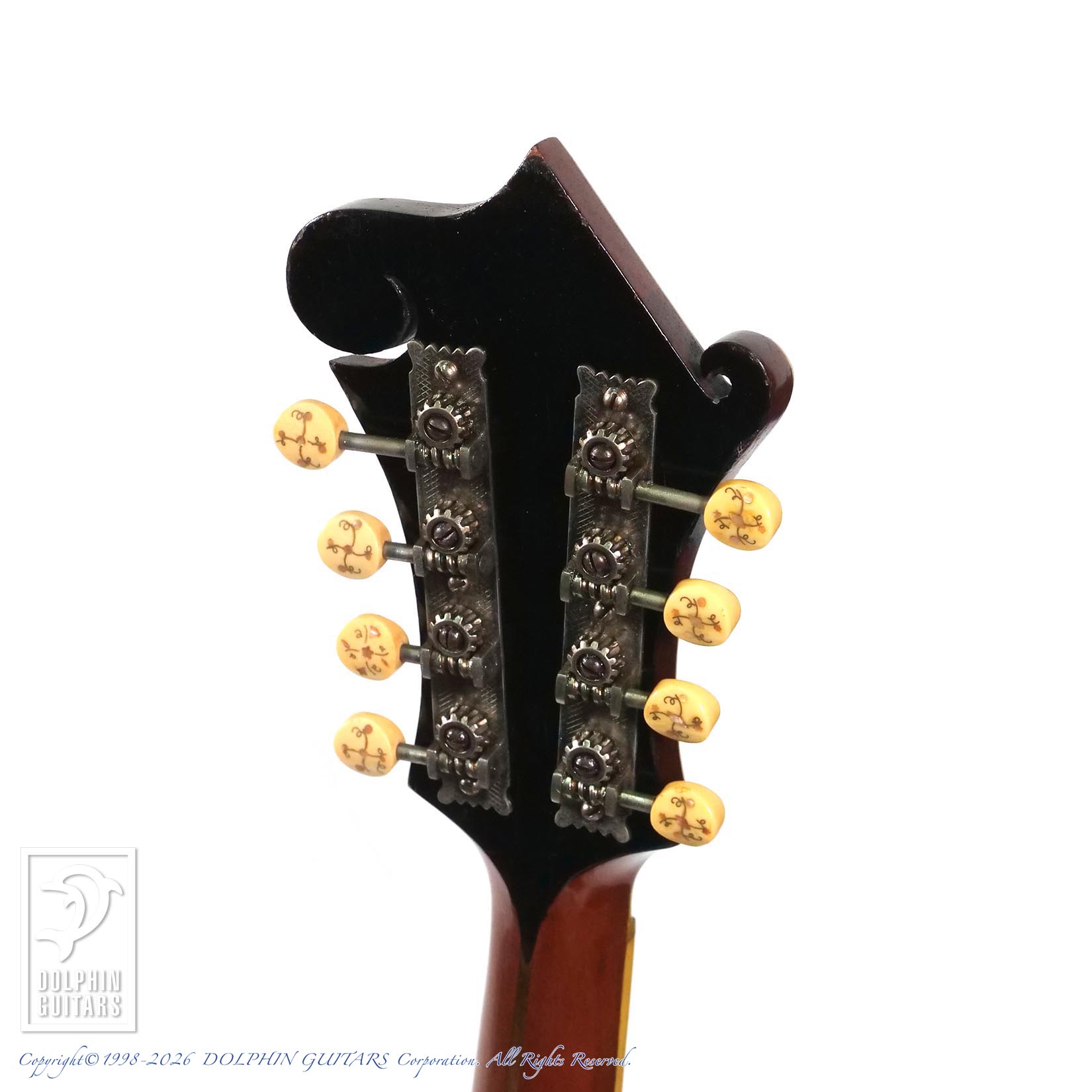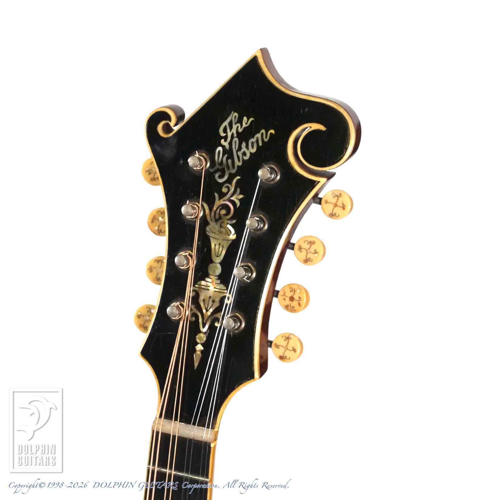 1902年より生産が始まったF-4は、1922年にF-5が発表されるまで、フラッグシップモデルとしてマンドリンシリーズのトップに君臨していました。ヘッドプレートには優美なトーチインレイが入れられており、トラスロッド・カバーが無い為に、やや長めのデザインで存在感抜群です。またオリジナルペグは、少々固さは感じますが(人によっては気にしないレベルです)つまみに装飾の入ったスペシャルな仕様となっており、トップモデルに相応しいデティールと言えます。