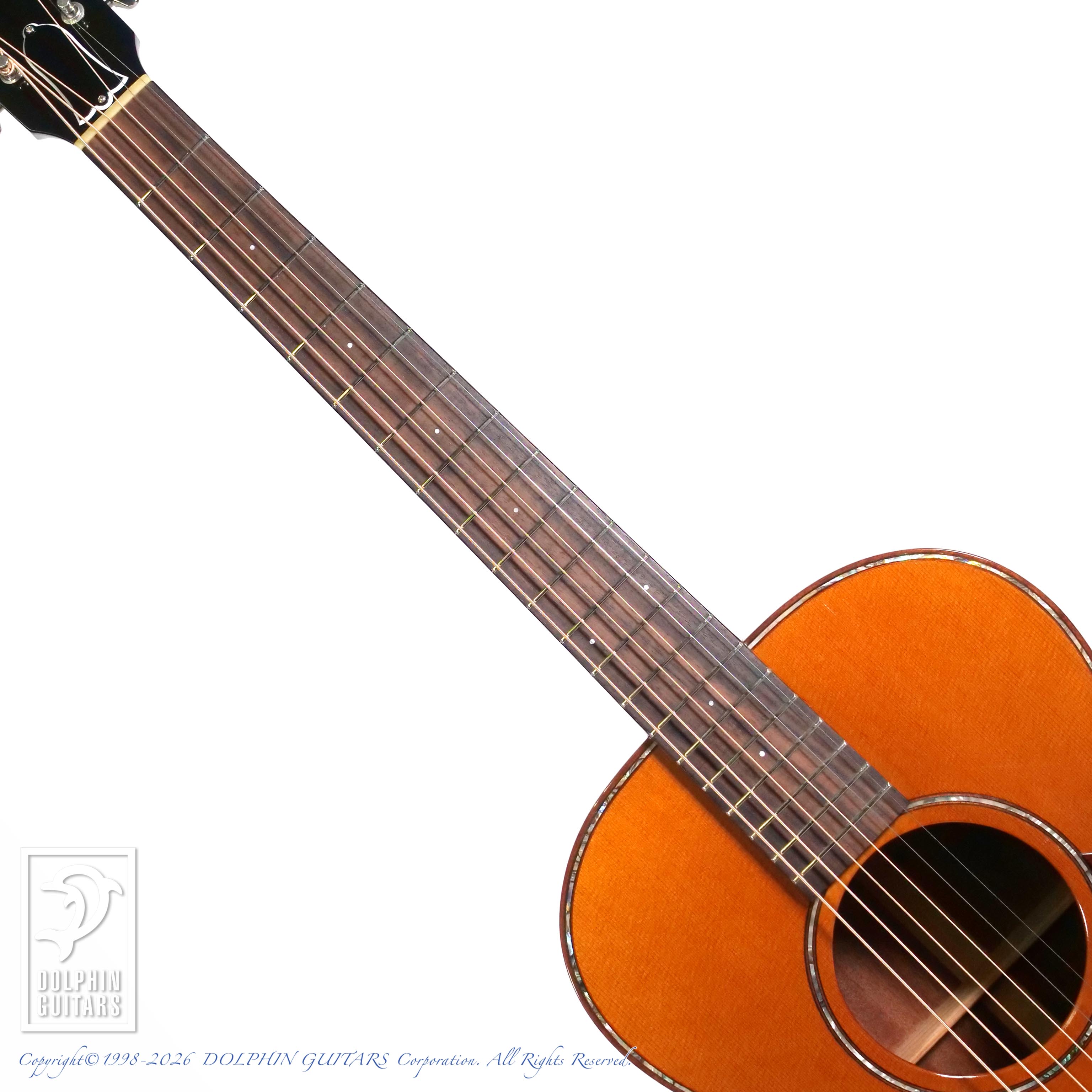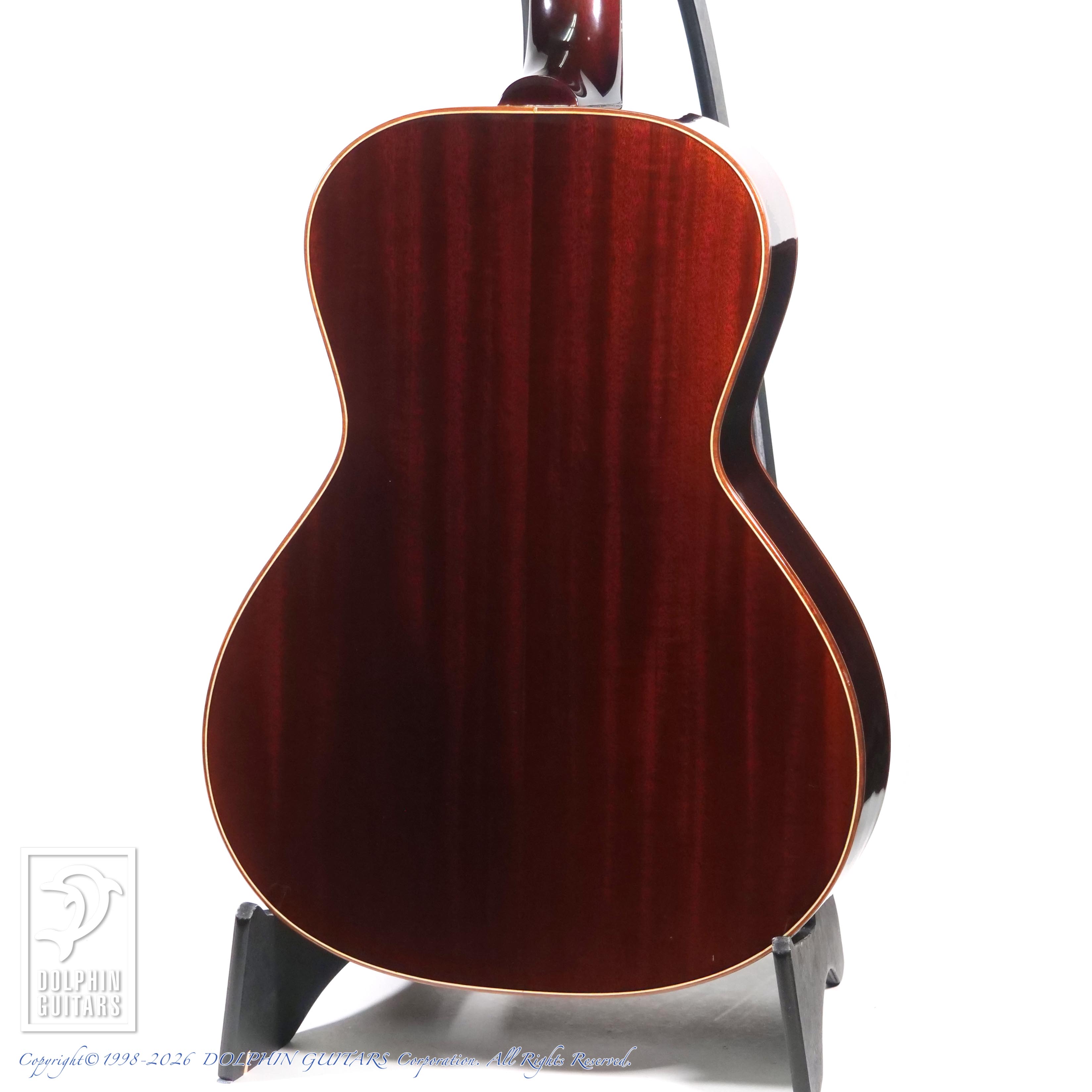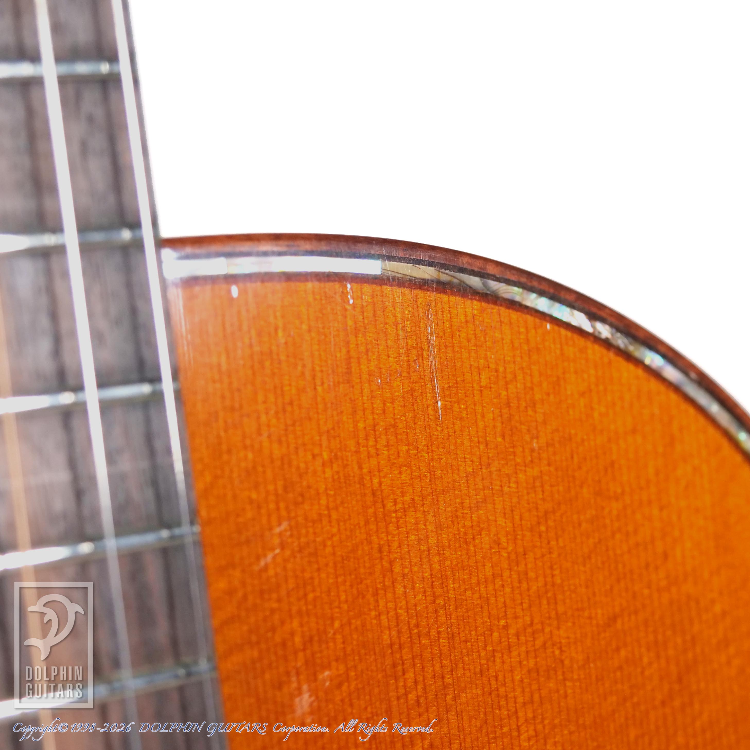 ギブソンスタイルの作品が多く、本器はL-00タイプのシェイプをアバロンで綺麗に飾ったユニークなモデル。アンバーフィニッシュにコントラストが効いた白木のパーフリングも小洒落ております。