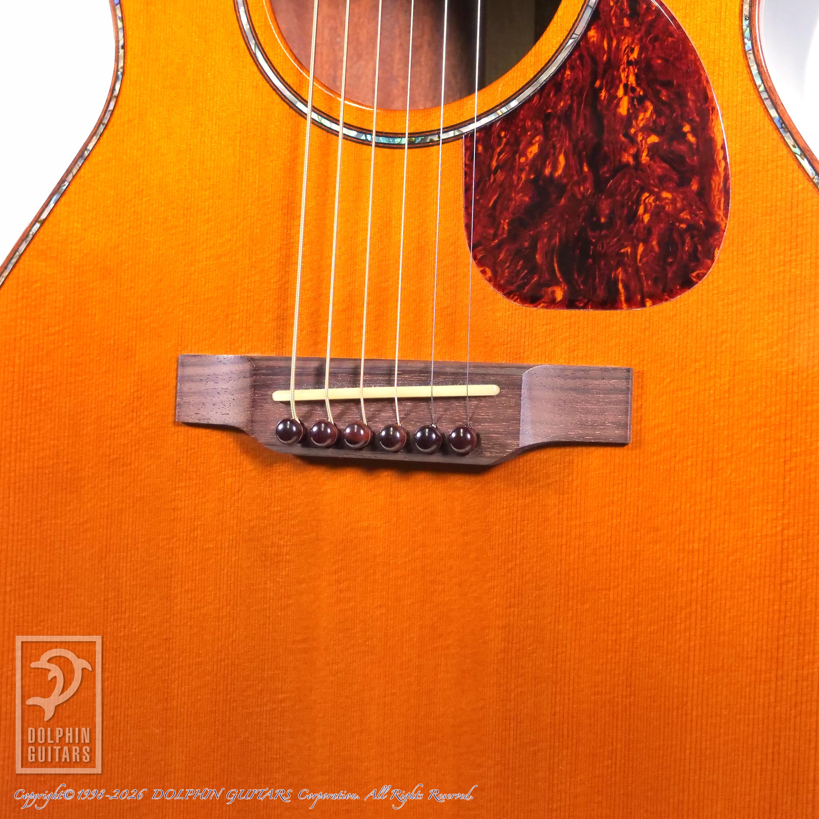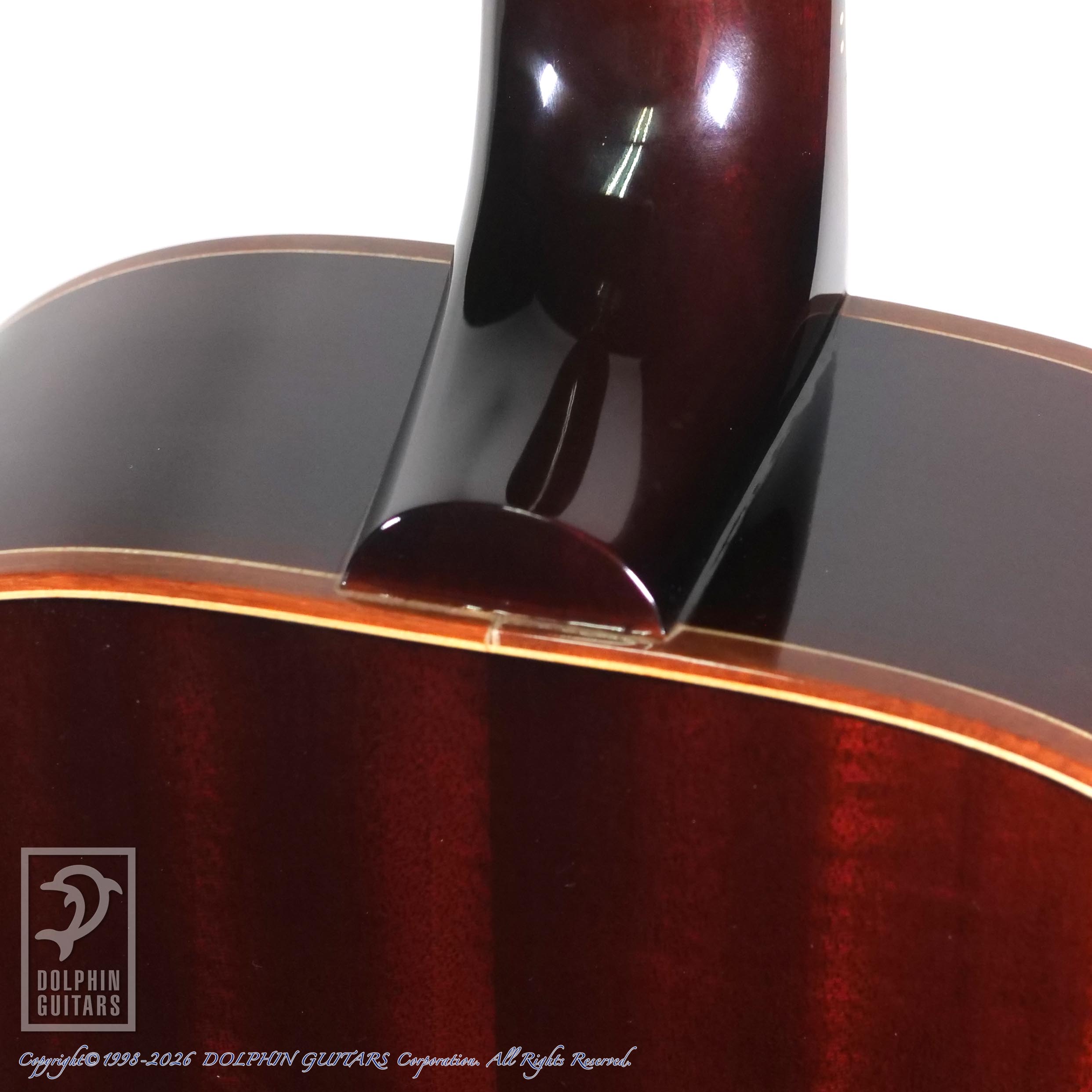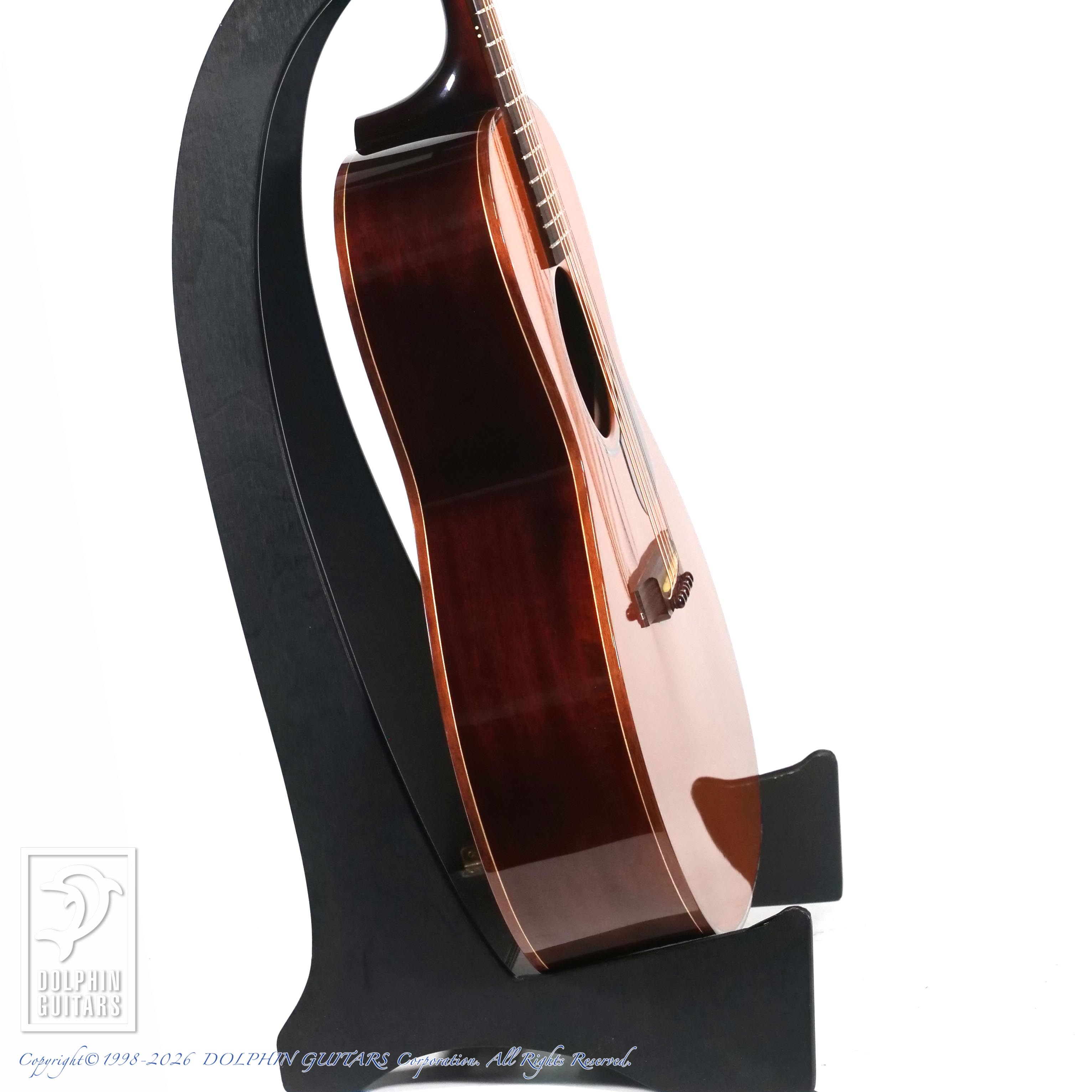 ギブソンスタイルの作品が多く、本器はL-00タイプのシェイプをアバロンで綺麗に飾ったユニークなモデル。アンバーフィニッシュにコントラストが効いた白木のパーフリングも小洒落ております。