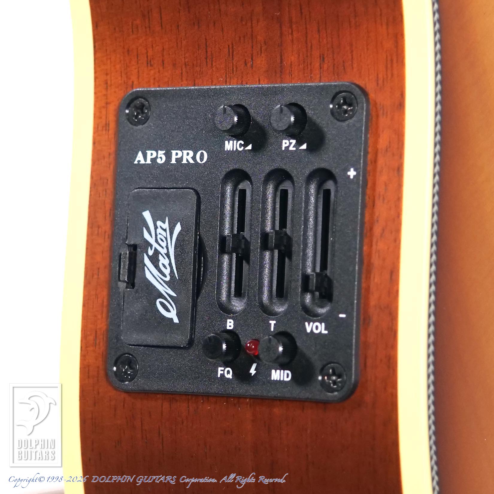 メイトンの魅力の一つでもあるピックアップシステムはメイトン社オリジナルのAP5-Proは特殊構造のアンダーサドルPUとコンデンサーMicをMixし、リアルなアコースティックサウンドをアウトプットできます。サイズはミニであってもラージボディにも引けをとらないこの大迫力のサウンドに、初めて弾かれる方は驚きを隠せないでしょう。