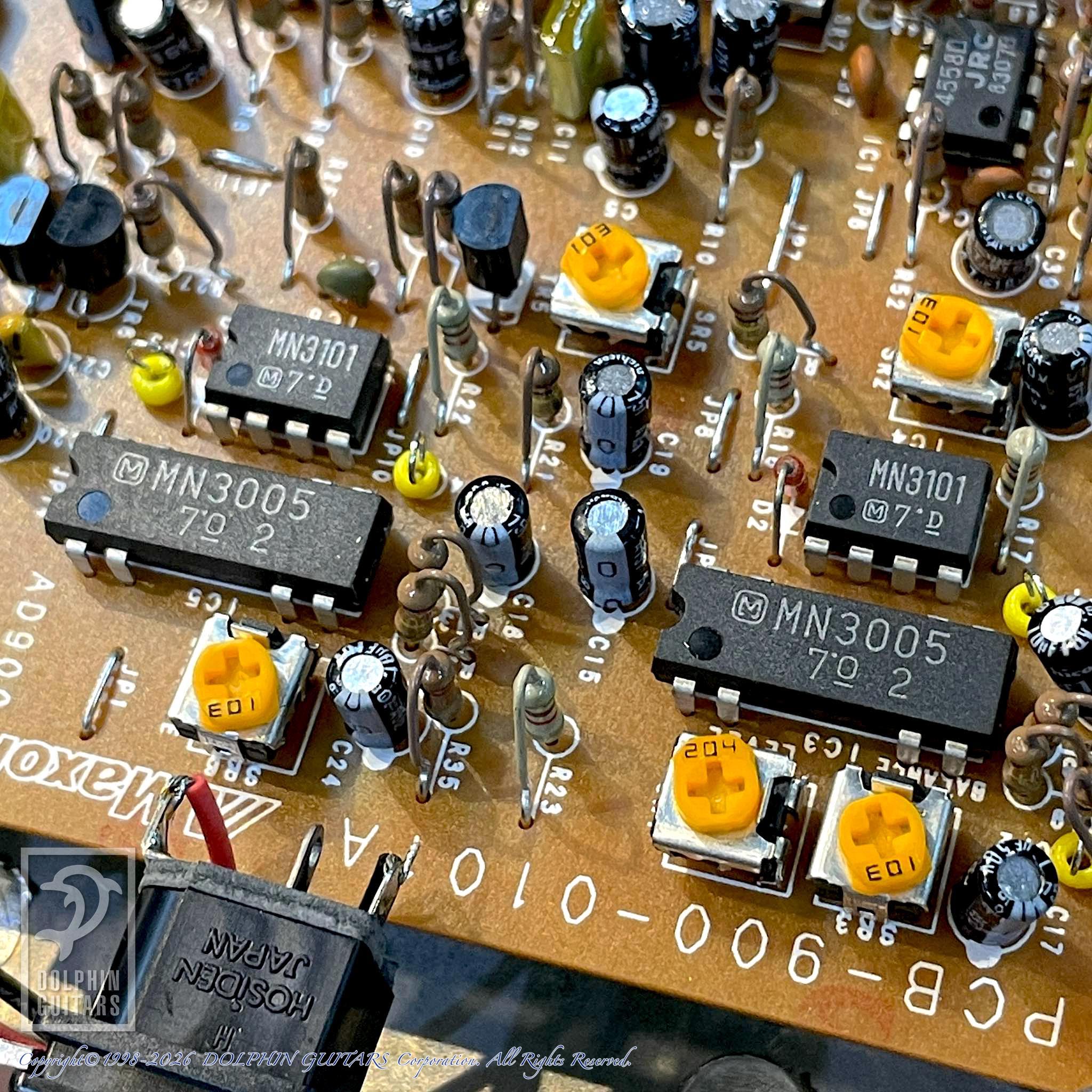 アナログディレイサウンドの心臓部であるBBD=Bucket Brigade Device(通称バケツリレー素子)、は前期型であるMN3005が2つ搭載しております。本機は製造ロット番号や新品時の購入日記録から、おそらく1998年頃の生産と推測できます。