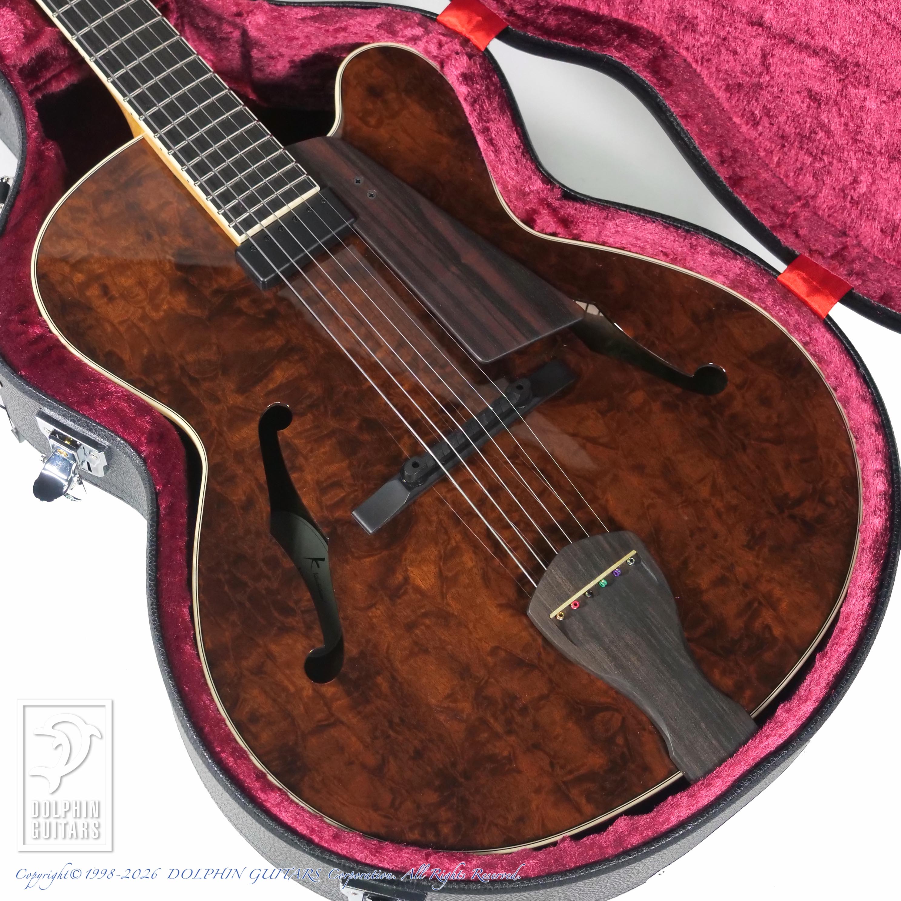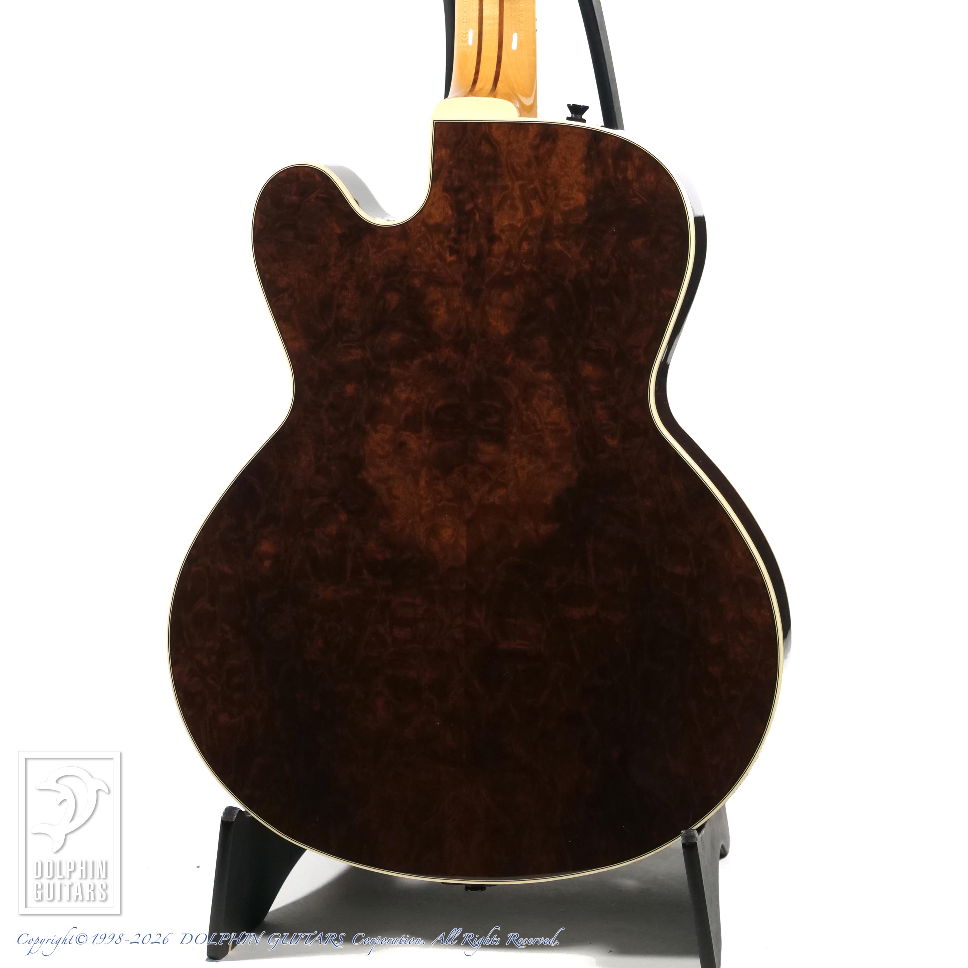本器は15.5インチボディのKikuchi Guitars流ニューヨーカスタイル、NY155 Imbuia Burl。