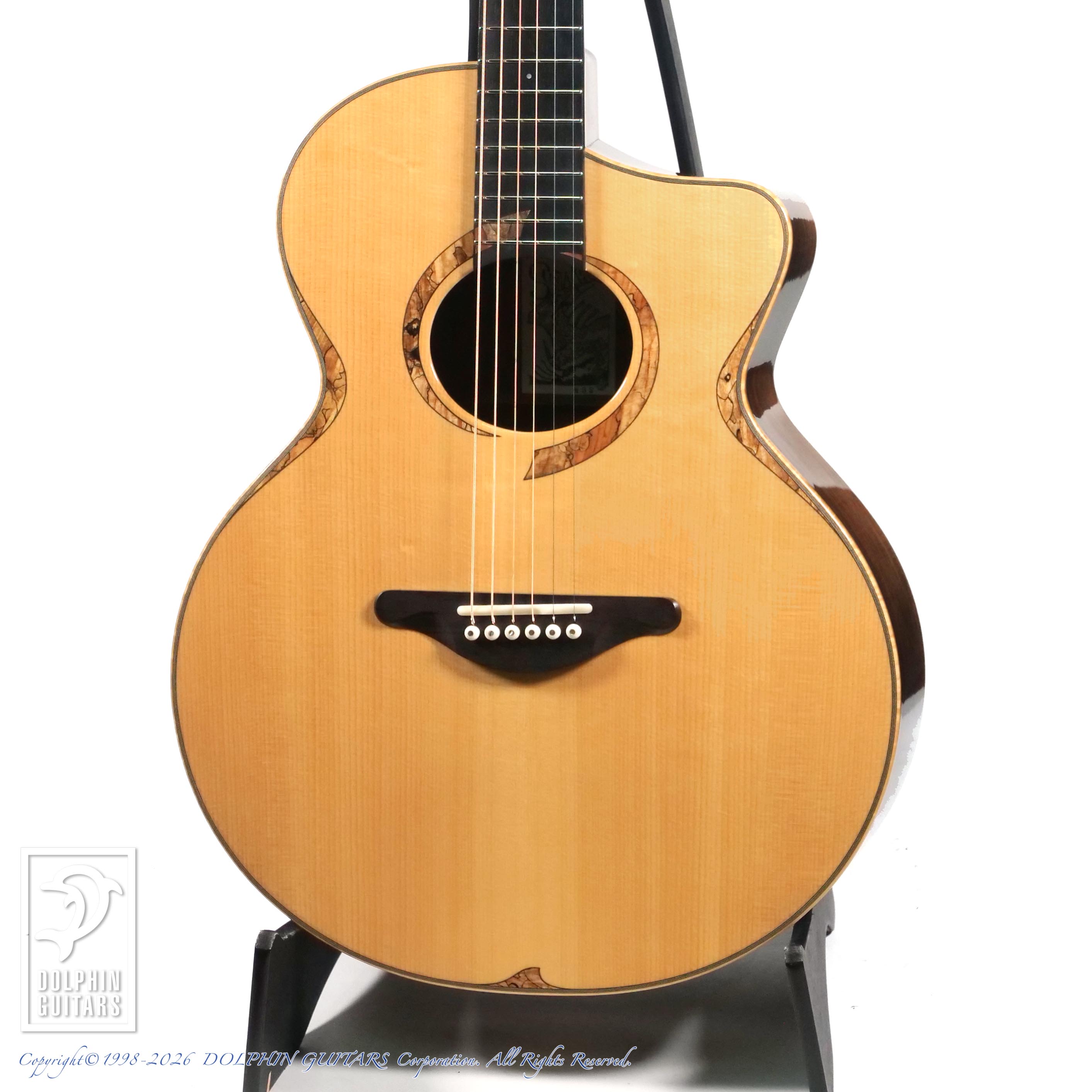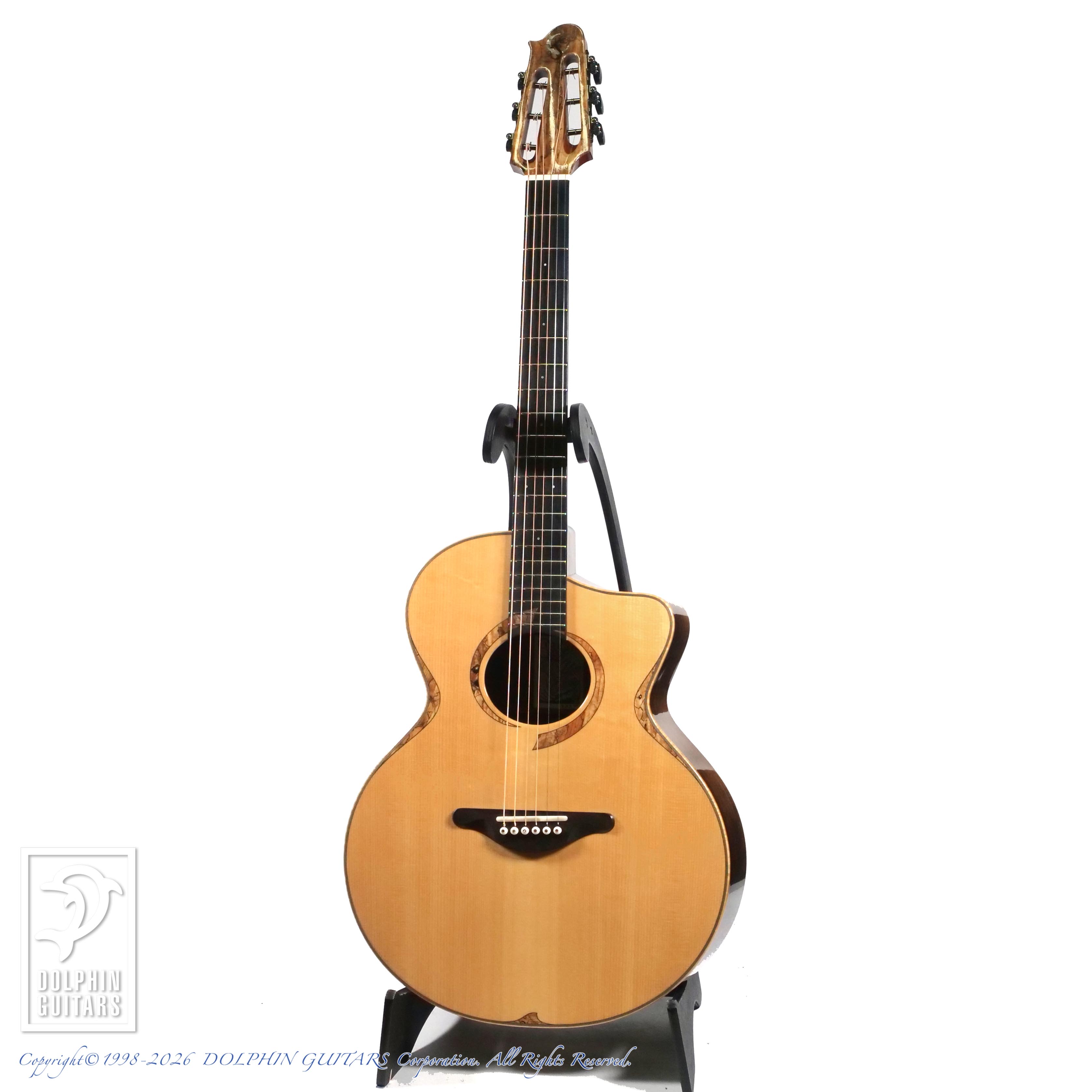 オーバルホールやダイナミックなヘッドの造形、スポルテッドメイプルによる能動的なロゼッタやパフリングなど、発売当時としては大胆なデザインで愛好家を湧き立たせました。