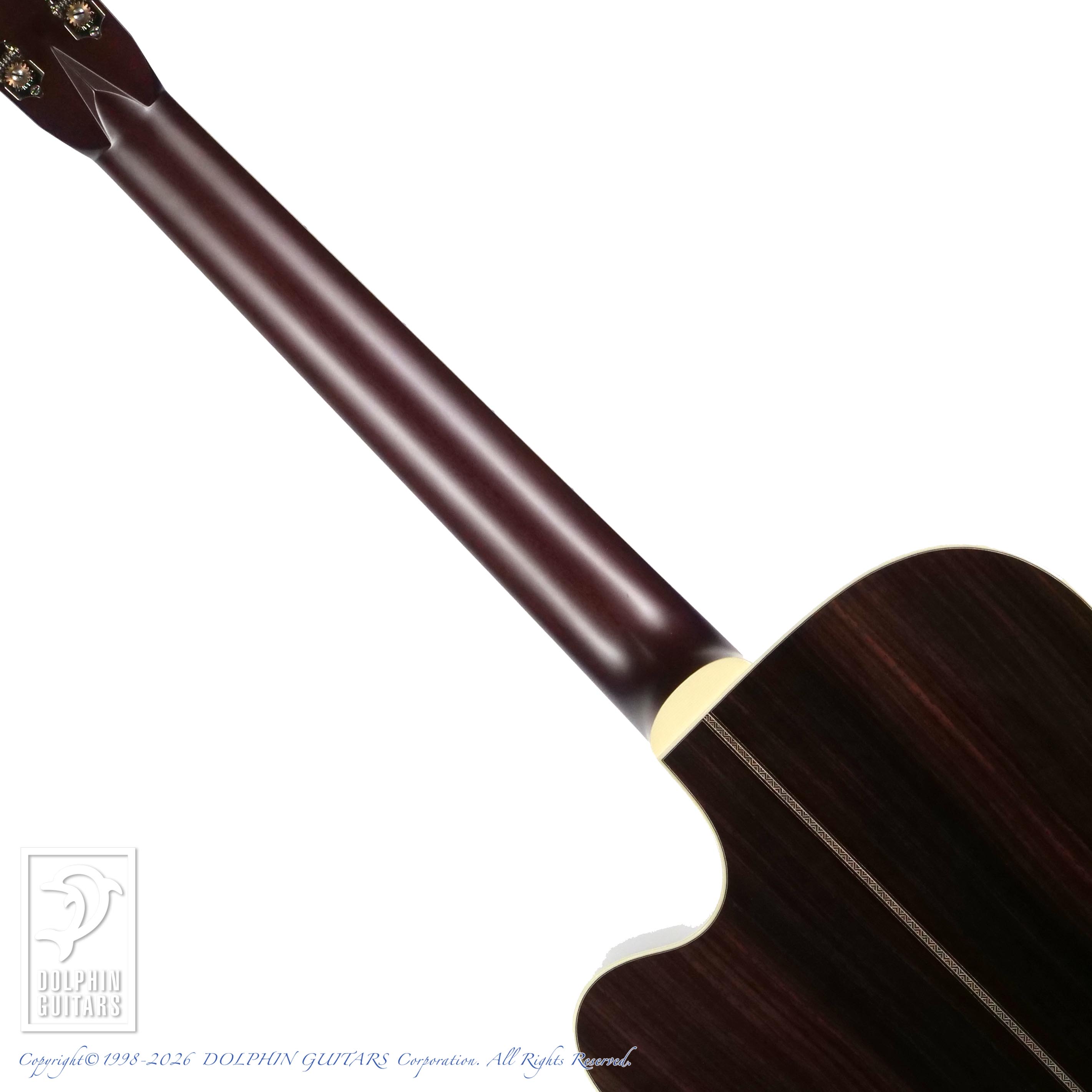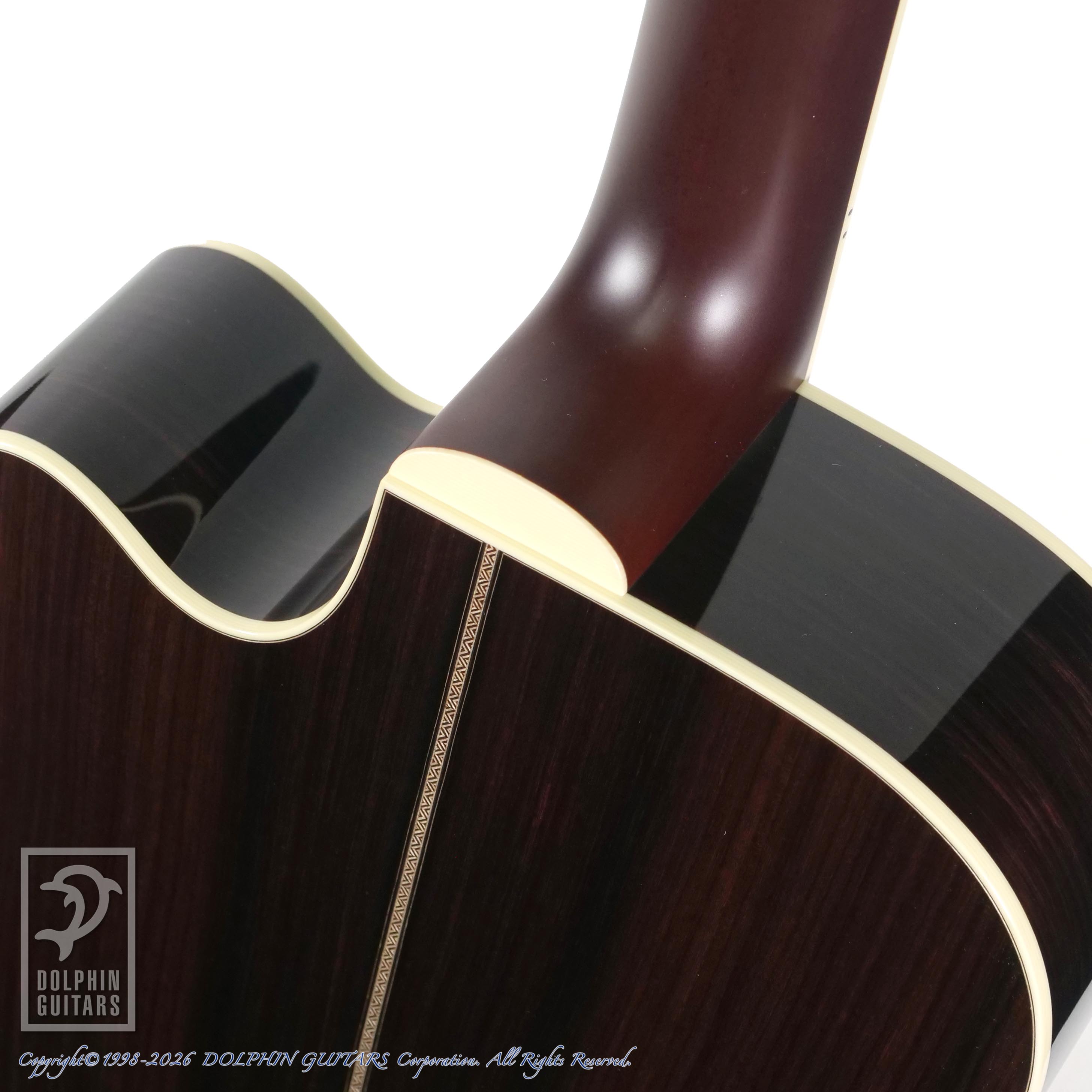 装飾面では、ロゼッタ、パーフリング共に木象嵌によるカウボーイロープパターン、さりげないダイヤモンドポジションインレイ、ヘッドロゴはキラリと輝くパールのスクリプトタイプを選択し、落ち着きと品のある仕上がりとなりました。ロープデザインはシンプルながら存在感があります。