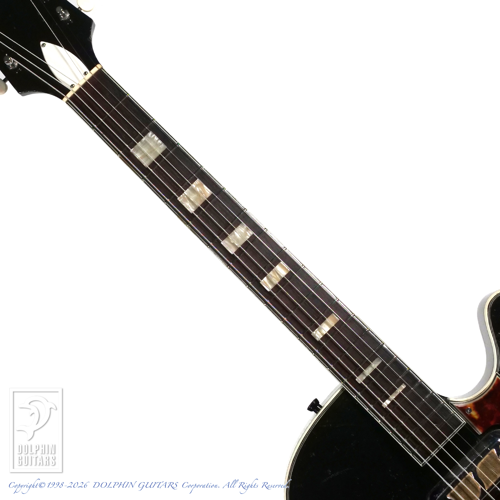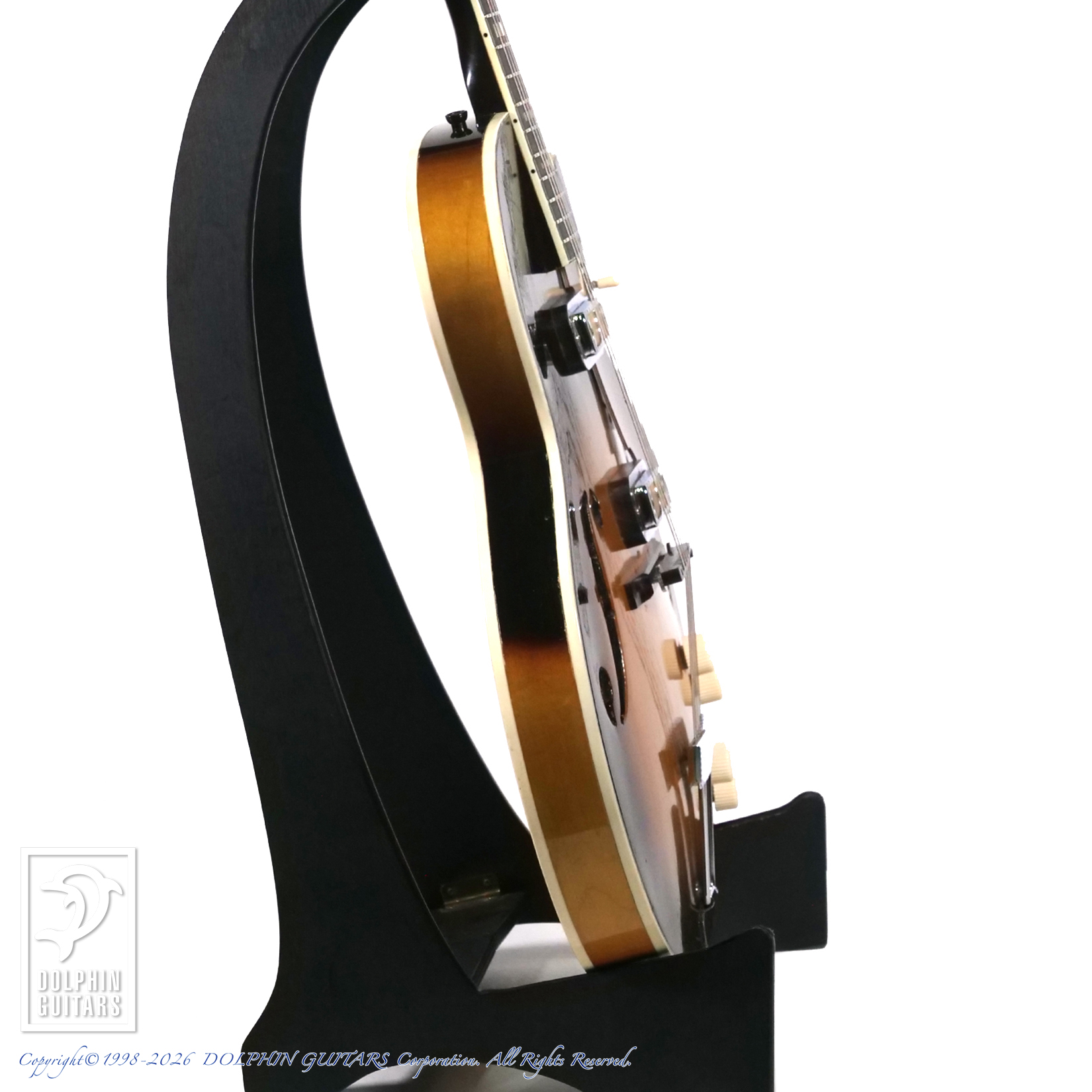 スプルーストップにメイプルサイド&バックを合わせた薄胴ホロウボディは、軽快なレスポンスと乾いた空気感が魅力。サンバーストの渋い佇まいに、ブロックポジション、バインディング、そしてDeArmondゴールドフォイルの存在感が加わり、いかにも60年代アメリカらしいムードを濃厚に漂わせます。丸みのあるシングルカッタウェイもこのモデルならではの愛嬌です。このスタイルでデタッチャブルネックという点もビザール愛好家にはたまらない仕様です。