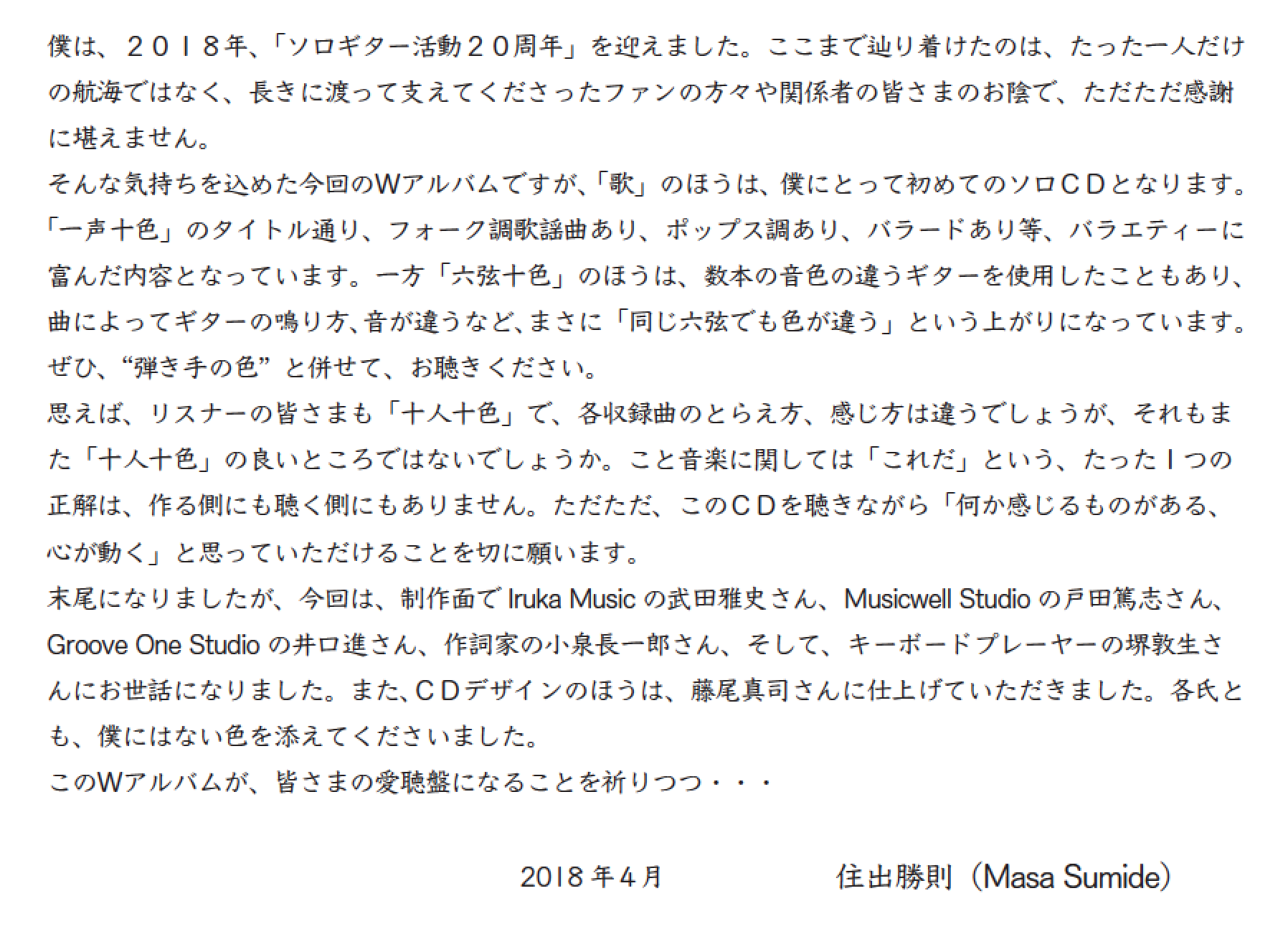 「シグナル」デビューから43年、ソロギター活動20年の住出勝則が今回新たに発表するのは、ボーカルアルバムとギターインストアルバムが2枚組になった、超豪華版アルバム【一声十色・六弦十色】です。