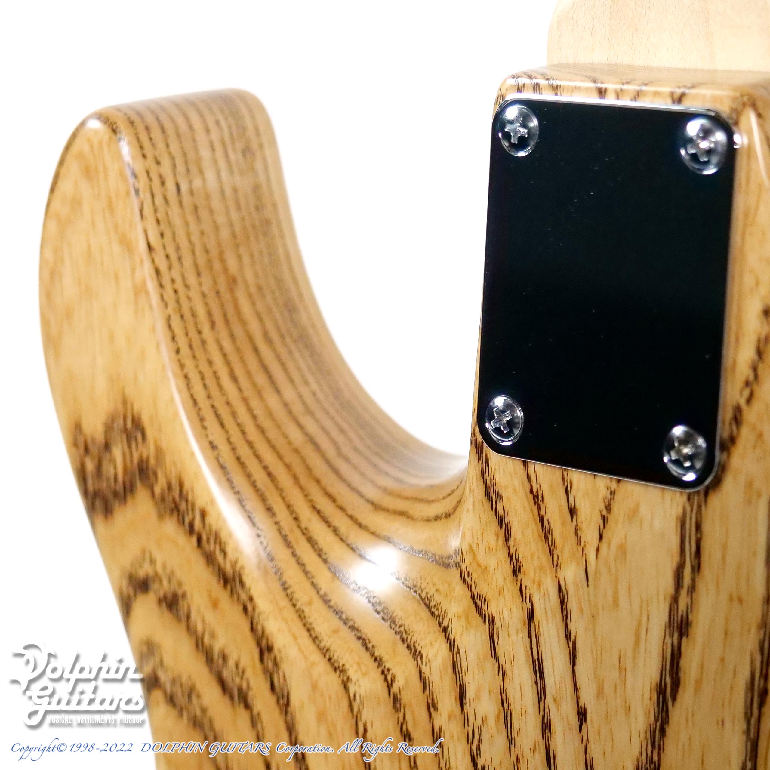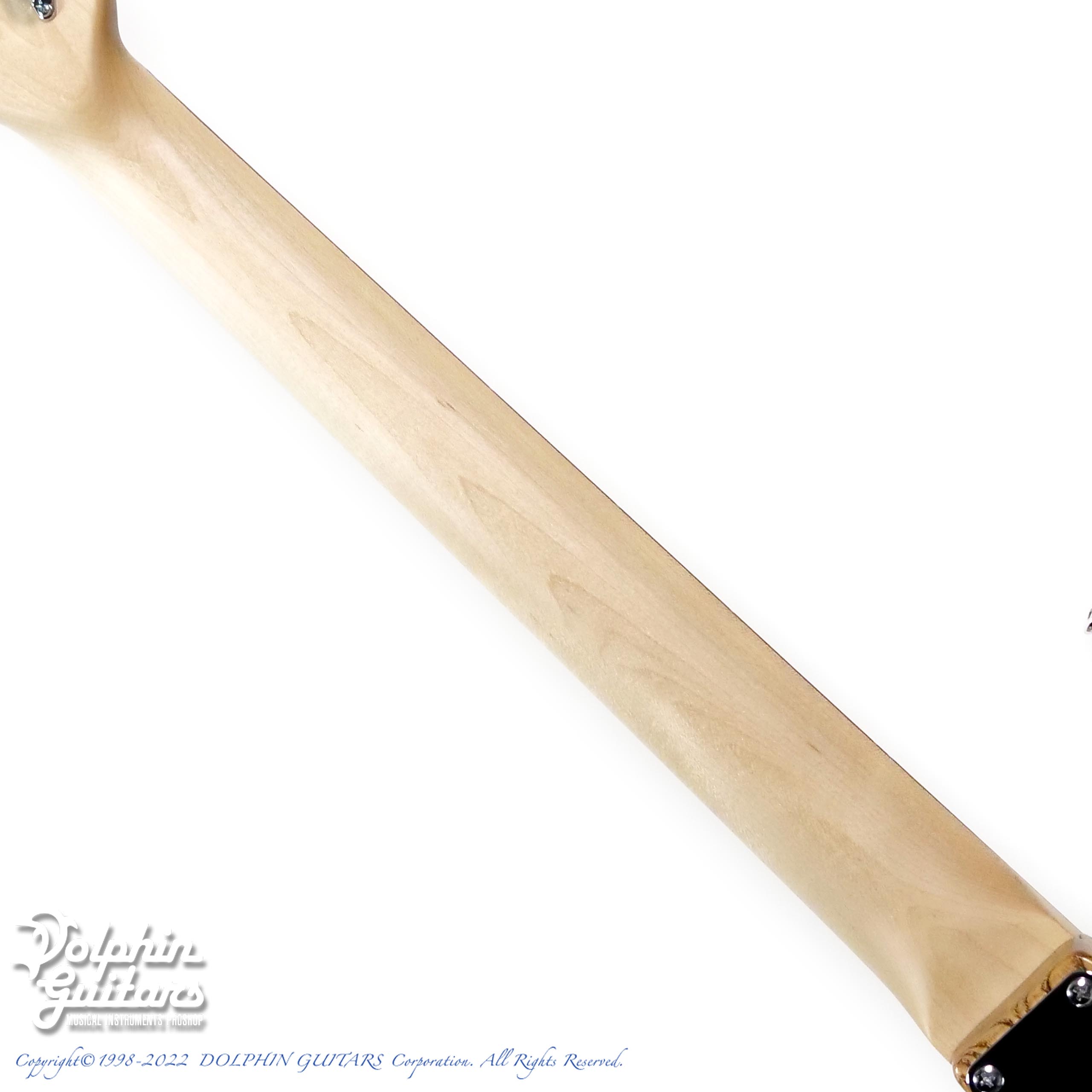 正面からトップを見ると、バインディング幅分のみナチュラルと塗り分けており、サイドから見るとノンバインディングで、言うなればハーフナチュラルバインディングという凝りよう。
