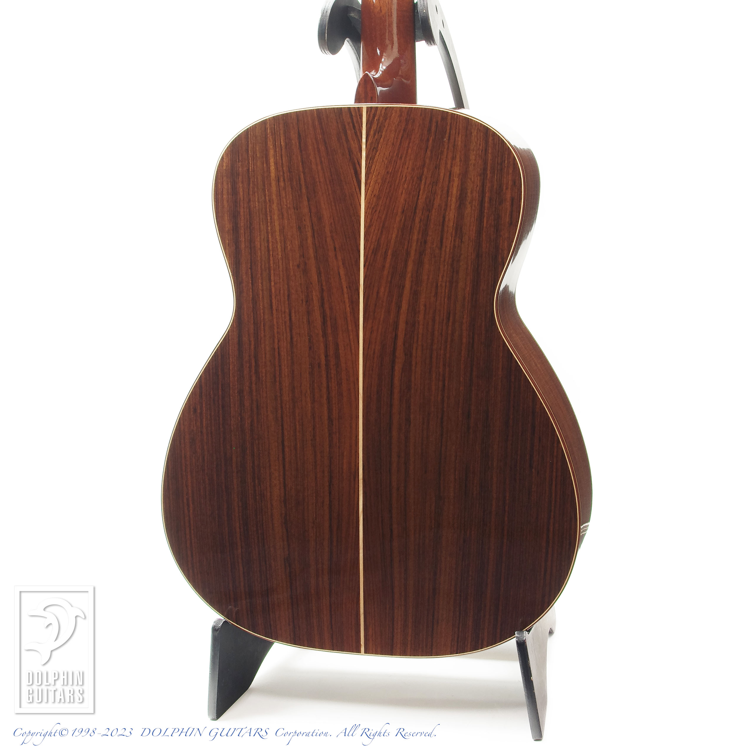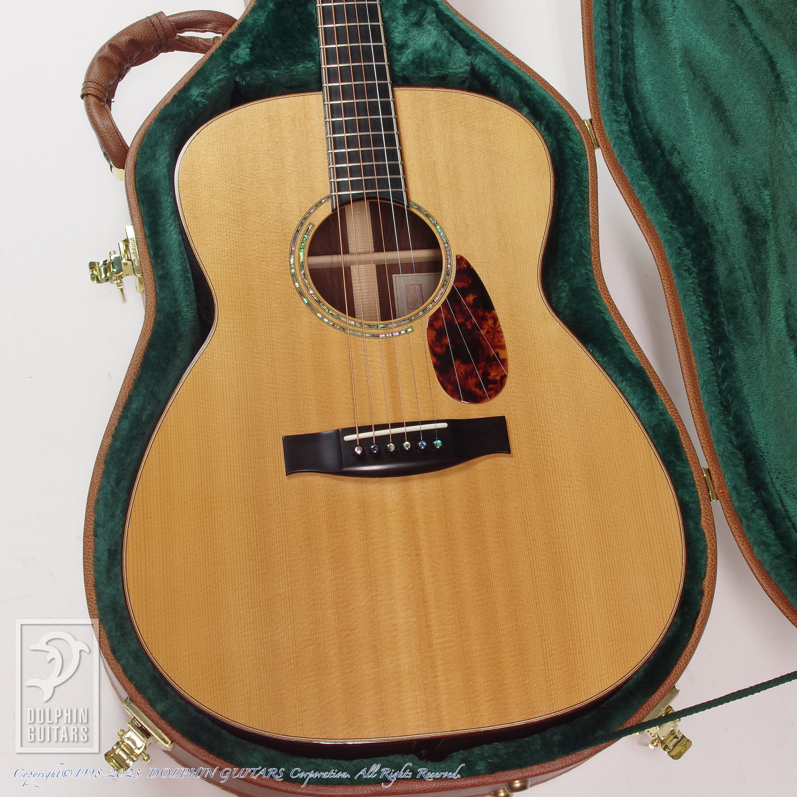 一般的なOMを最大厚で約15mmほど厚胴したボディサイズであり、低音の深みや音域の広さを感じさせるサウンドです。ピッキングの強弱もしっかりと反応し、豊かな表現力を持つ個体で、抜群な鳴りの良さからテンション感も適度な柔らかさを感じるほどです。日高氏はプリウォーマーティンスタイルのアメリカンサウンドの製作も得意とし、本器もベースとなる音作りはプリウォースタイルですが、日高氏のアレンジを加えたブレイスパターンとなります。