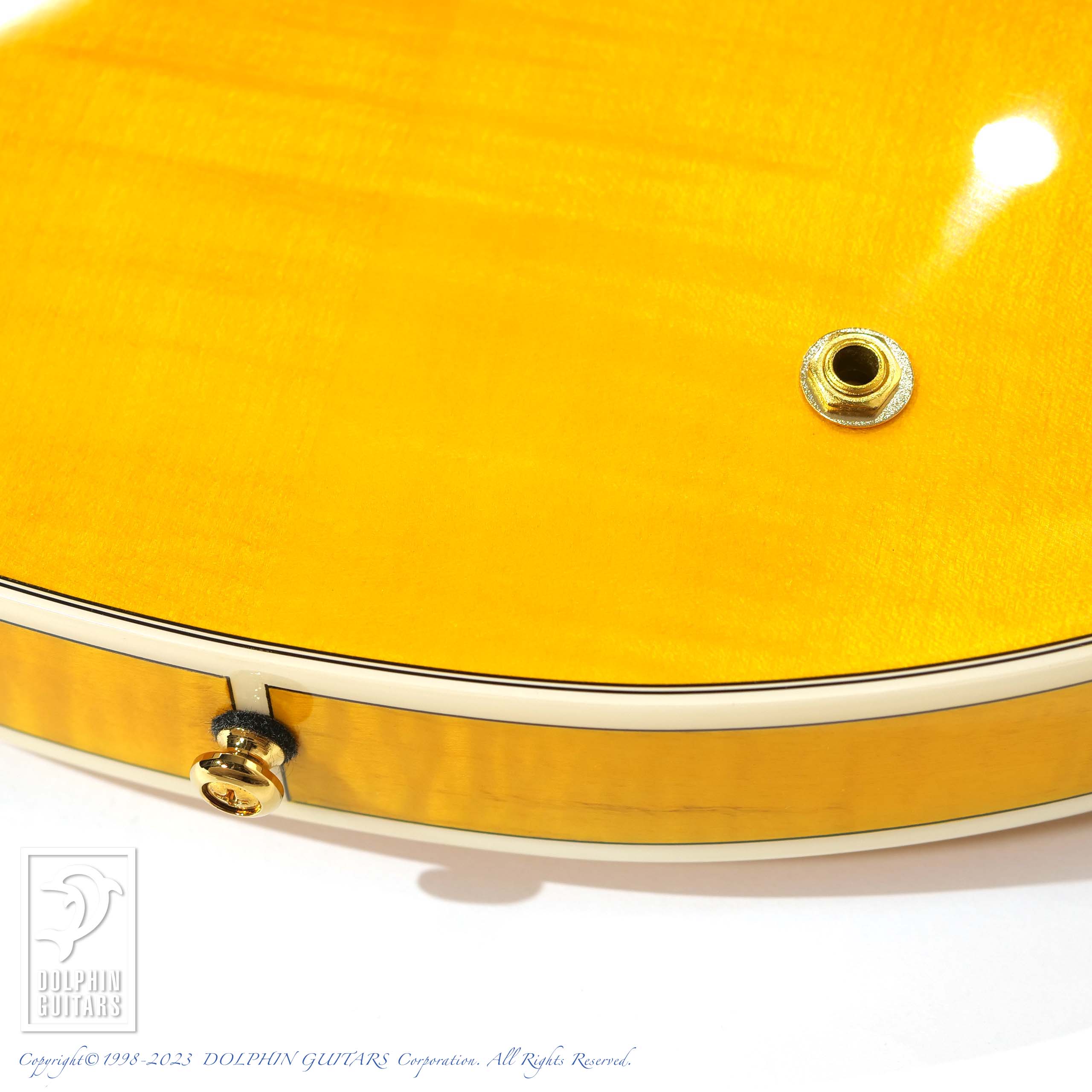スタンダードモデルとの違いはそのルックス。ボディには美しいフレイムメイプルを使用、ゴールドパーツやパールホワイトのインレイとの組み合わせは、高級感を感じさせる佇まいとなっております。また、“77”を図案化したオリジナルのヘッドインレイは、バインディングと組み合わせてスタンダードモデルには無い雰囲気が漂います。