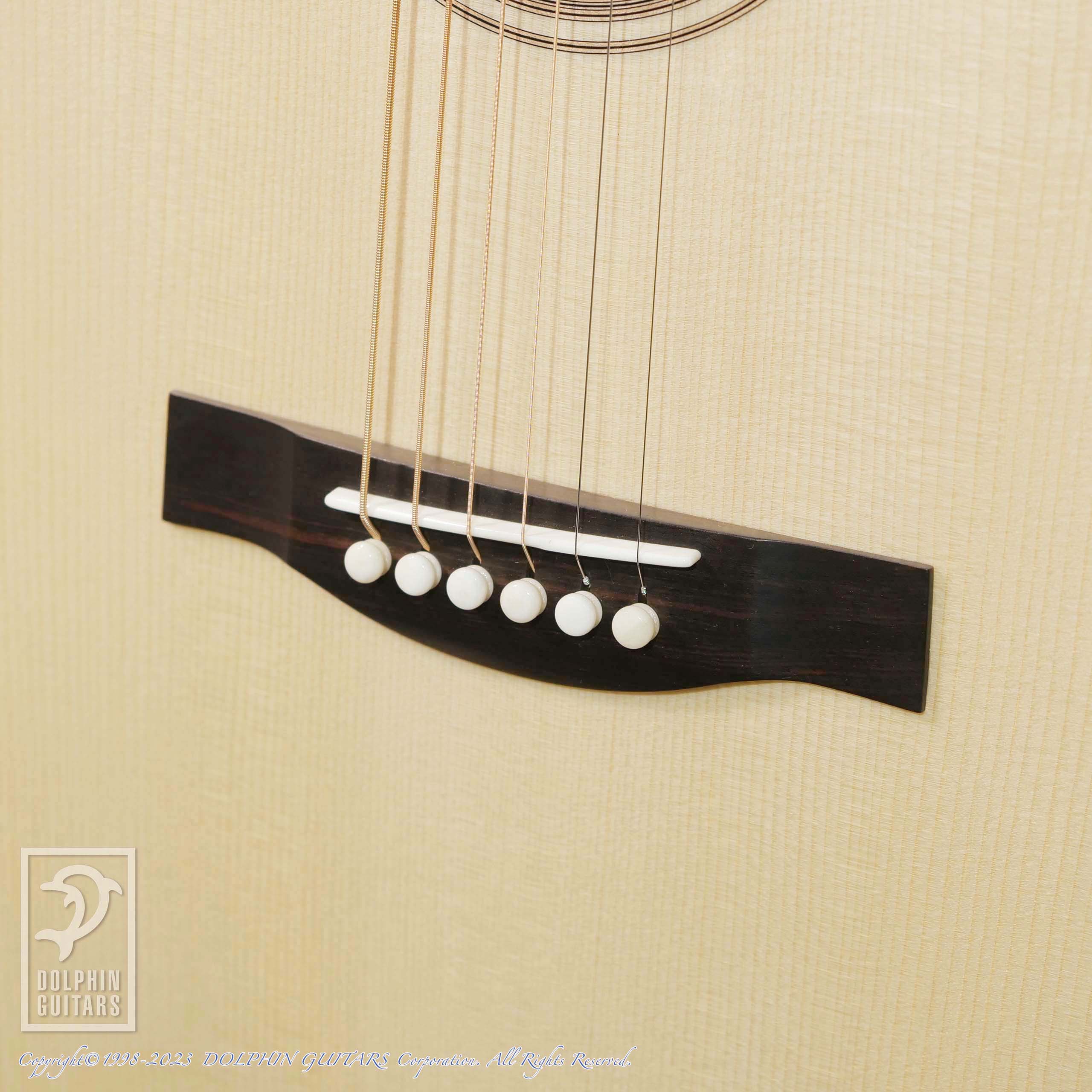 トップにはアディロンダックスプルースを採用し、そのブレイシングにもアディロンダックスプルースをニカワ接着でヴォイシングしています。レスポンスの良さと透明感のある中高域、OMサイズながらもディープボディによりさらに中低域の音の深みと広がり、音圧もサイズ以上のサウンドが味わえます。