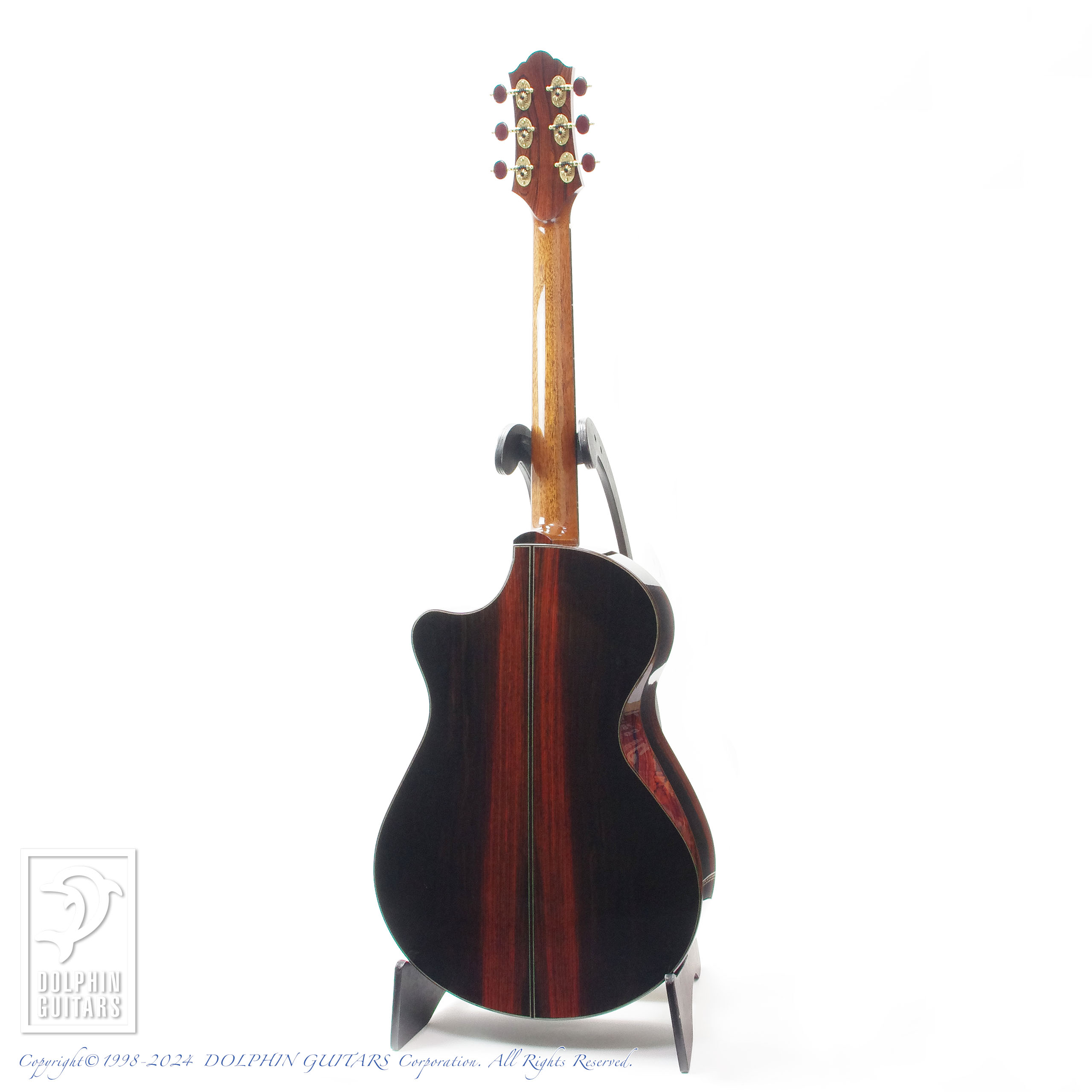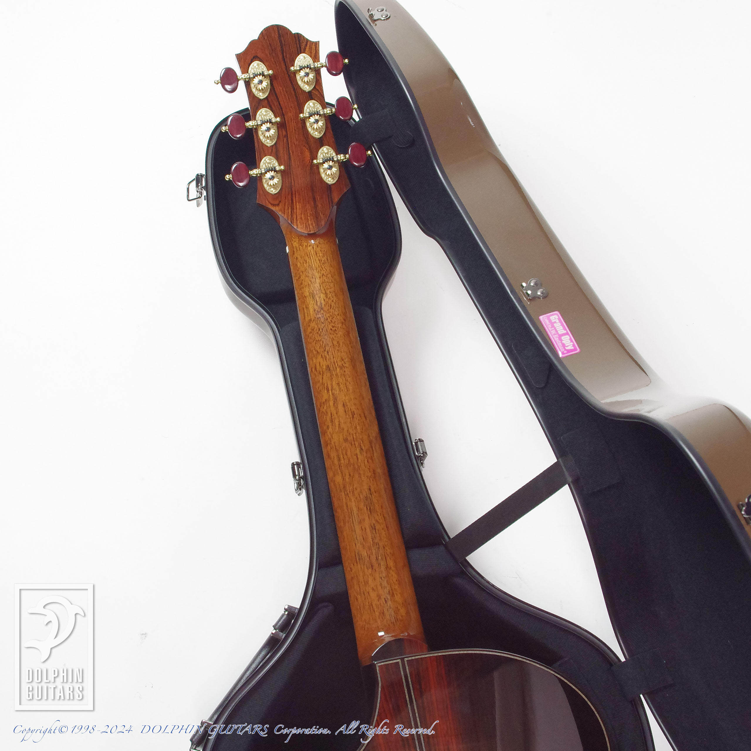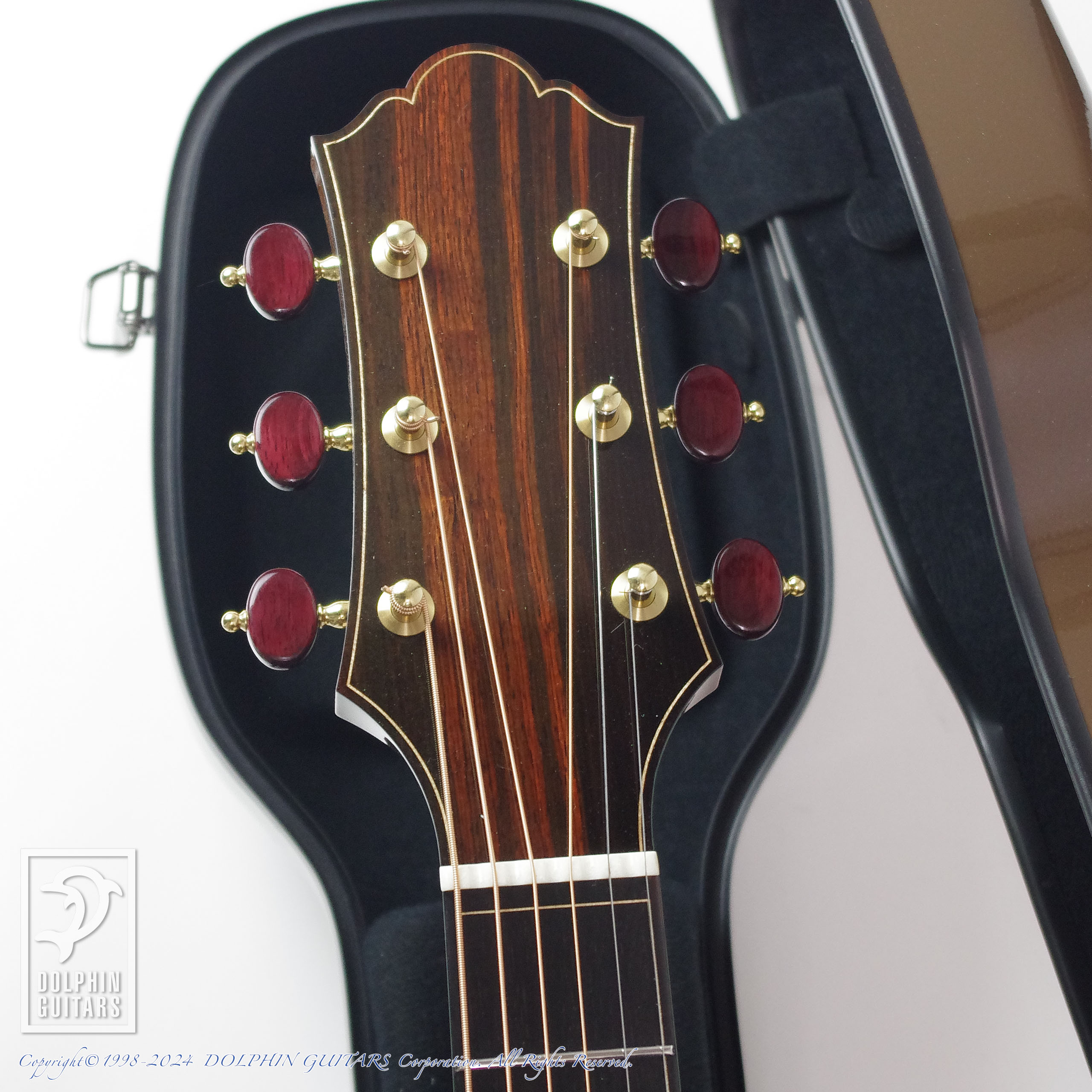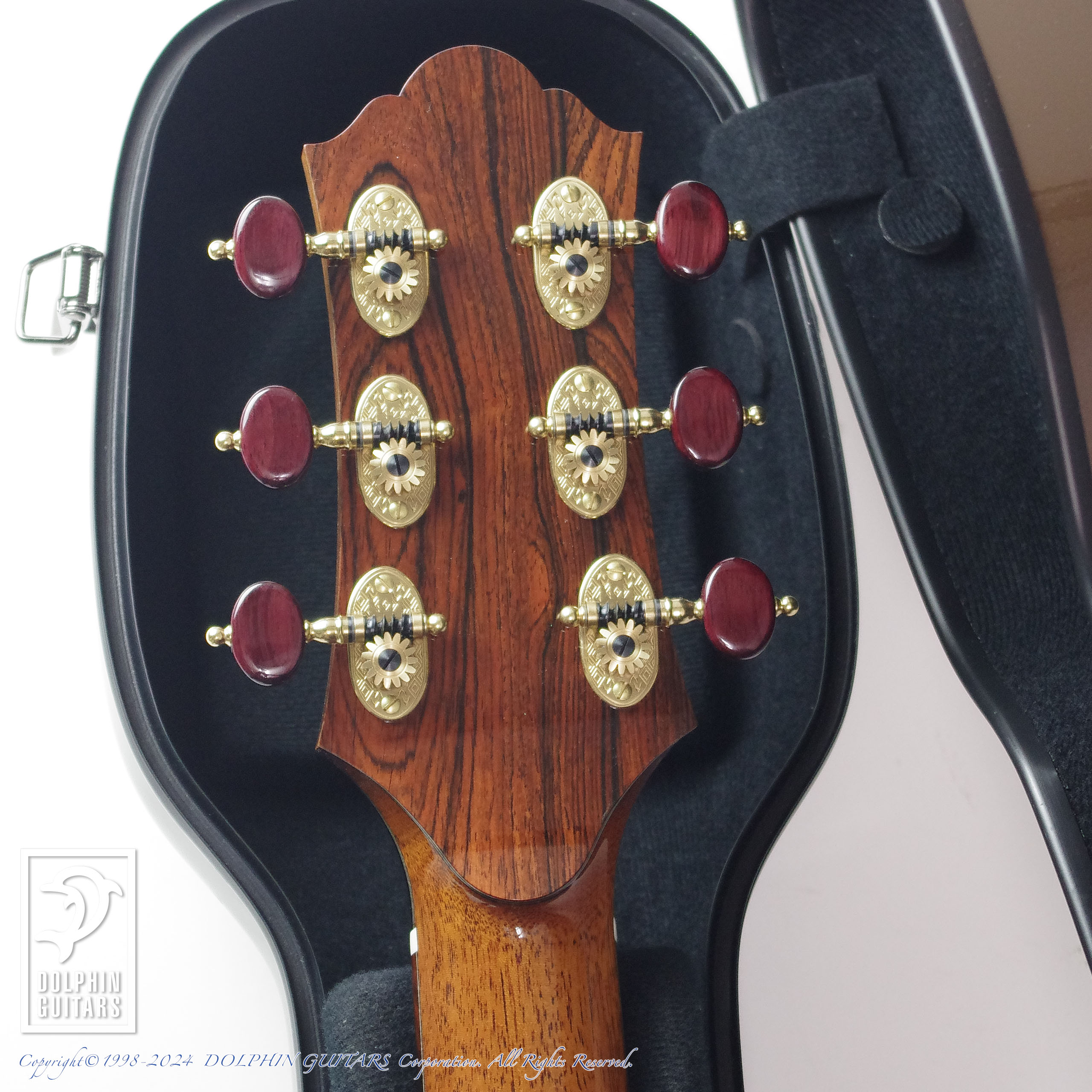ご覧の通りサイド&バック、ヘッドプレート(表・裏)、指板、ブリッジ、バインディング(リブレスト)にハカランダ材を使用し、高い木工精度で組み上げ、各部のデザイン・バランスの良さ、仕上げの美しさと圧倒的なオーラを放つモデルであります。