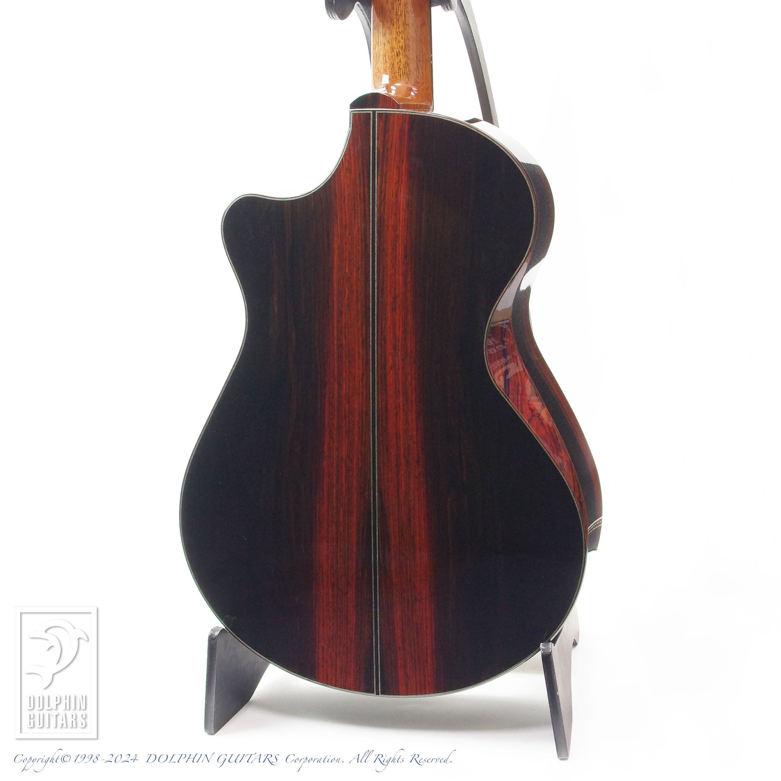 サイド&バック材はストレートグレインのマスターグレードハカランダ。バインディング材やリブレスト部分もハカランダを使用。リブレストが抱えた際のフィット感抜群であり、効果も絶大です。