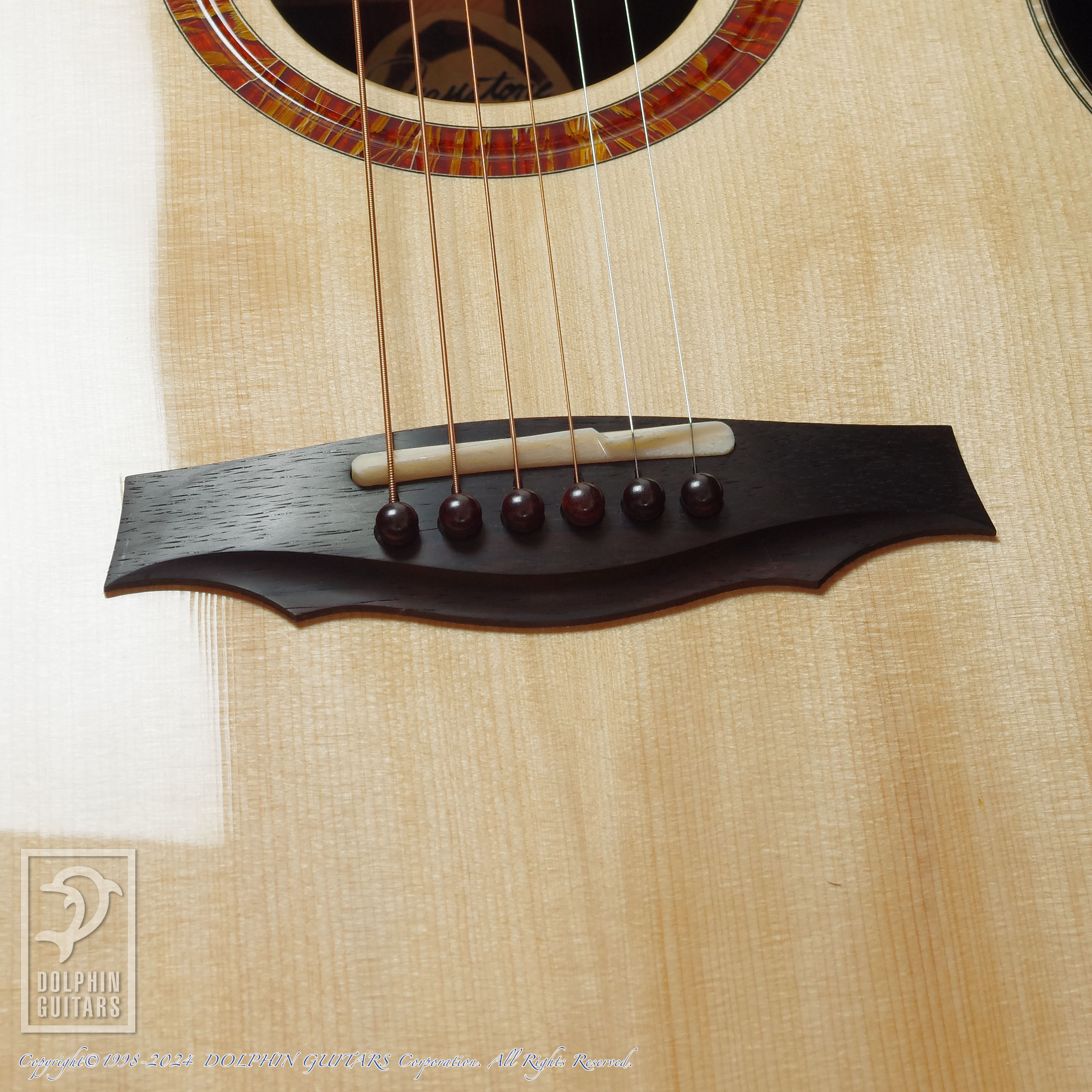 ブリッジ材も黒々とした上質なハカランダ材で製作されており、シェイプや仕上げの美しさなど、こういった部分でも木工精度の高さが伺えます。