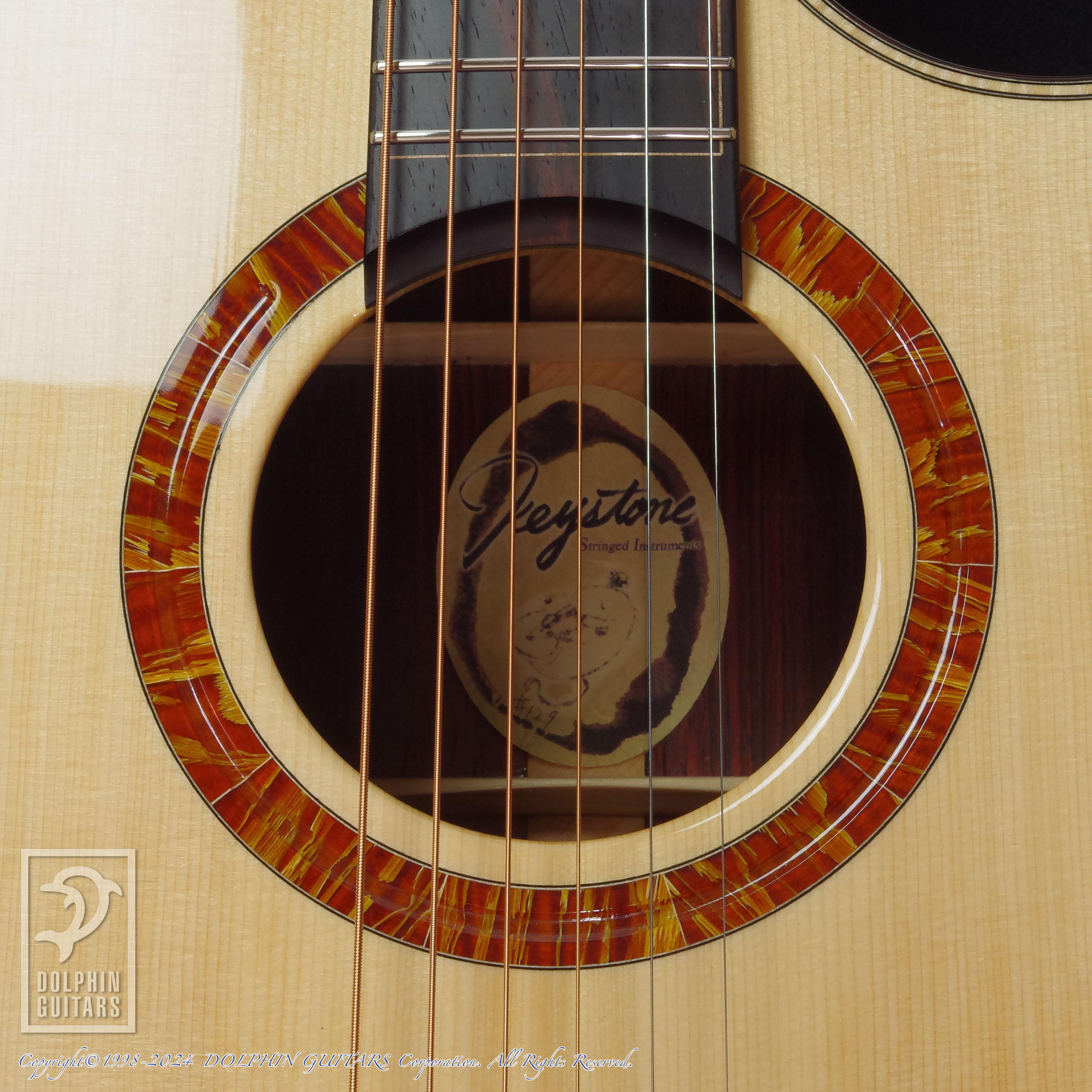 サウンドホールロゼッタは合成樹脂のレジンと木材を張り合わせたお手製で、センターの堀りを入れたキーストーンオリジナルのロゼッタデザインです。