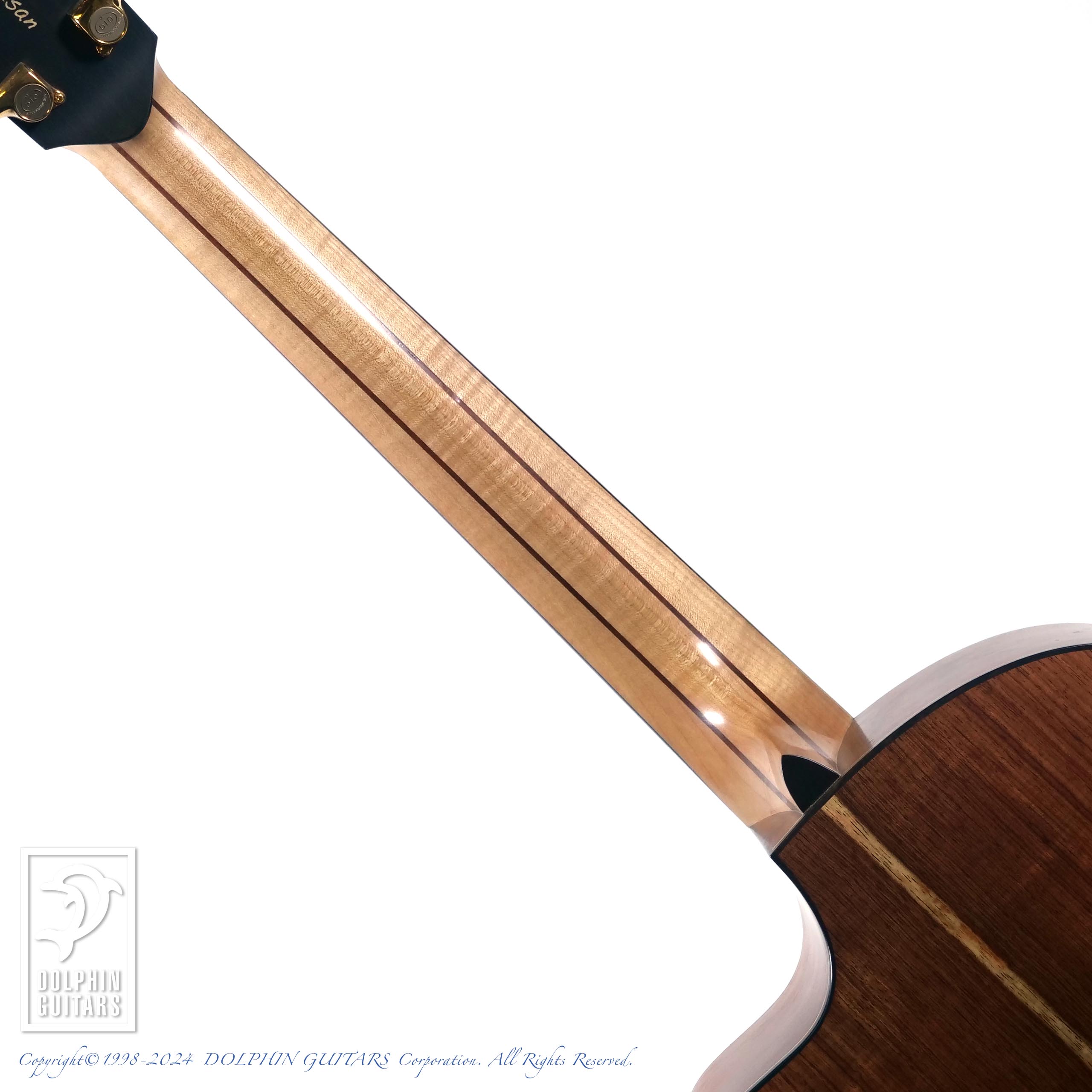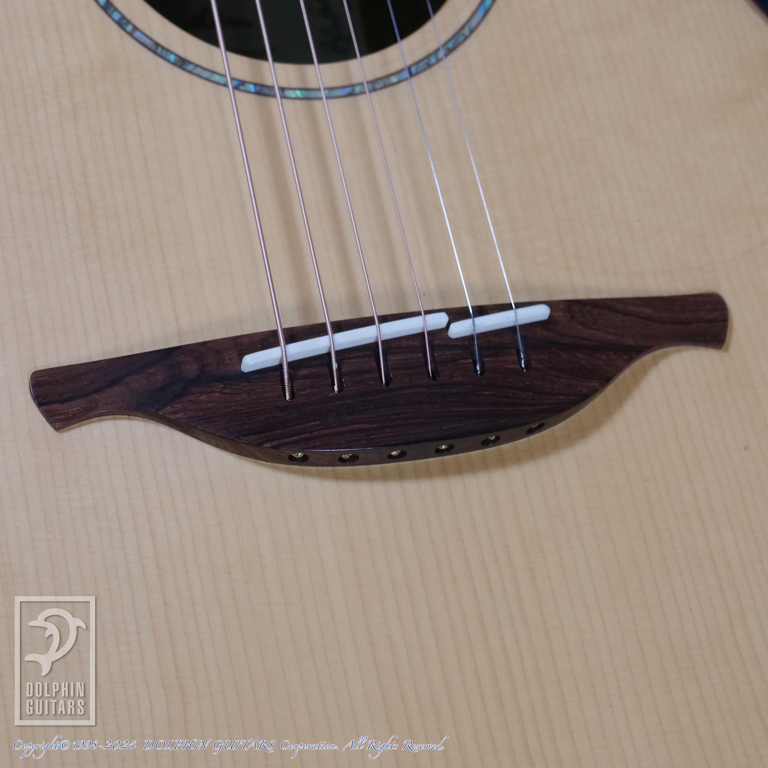 最高グレードのアディロンダックとホンジュラスローズを使用しており、ボディを囲うエボニーバインディングによるアームレストコンター加工が工芸品を思わせる流麗な佇まい。