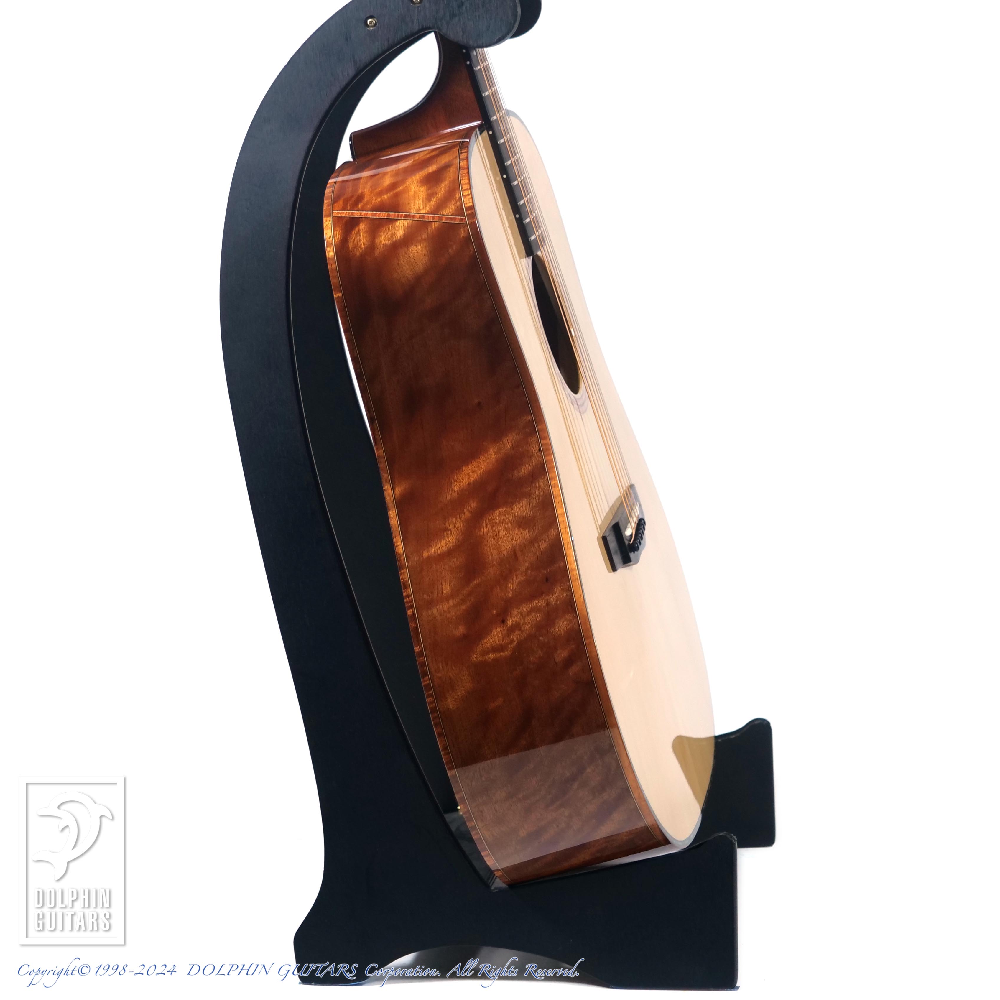 そんな神護木(カゴノキ)と貴重なアディロンダックスプルースの組み合わせによる特別仕様がこちらの一本。アディロンダック・スプルースのダイナミックなサウンドと、神護木の澄んだ柔らかい音色との組み合わせにより、ストロークにもフィンガーピッキングにも適した一本。神護木の優雅で神秘的な杢目は、感動を誘います。