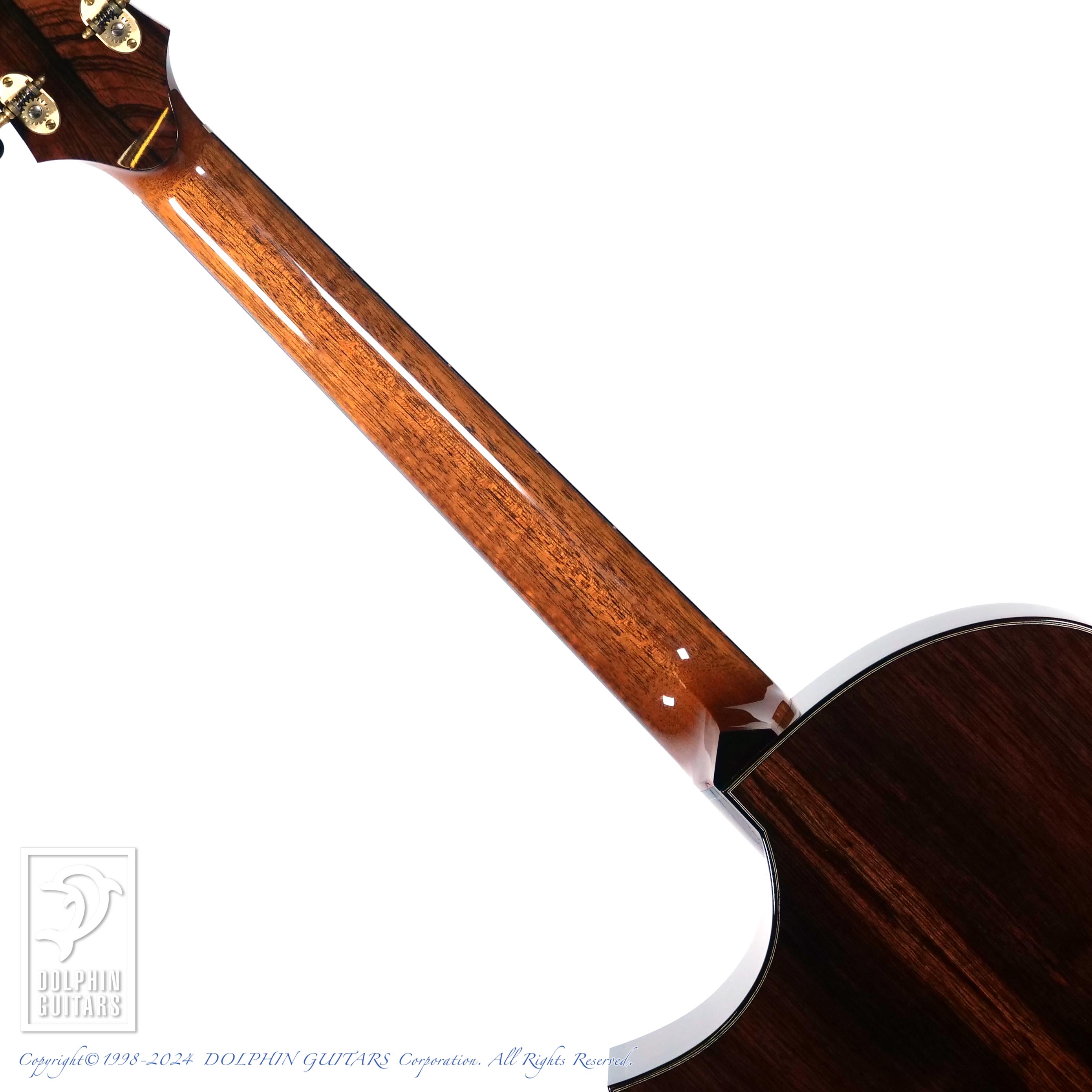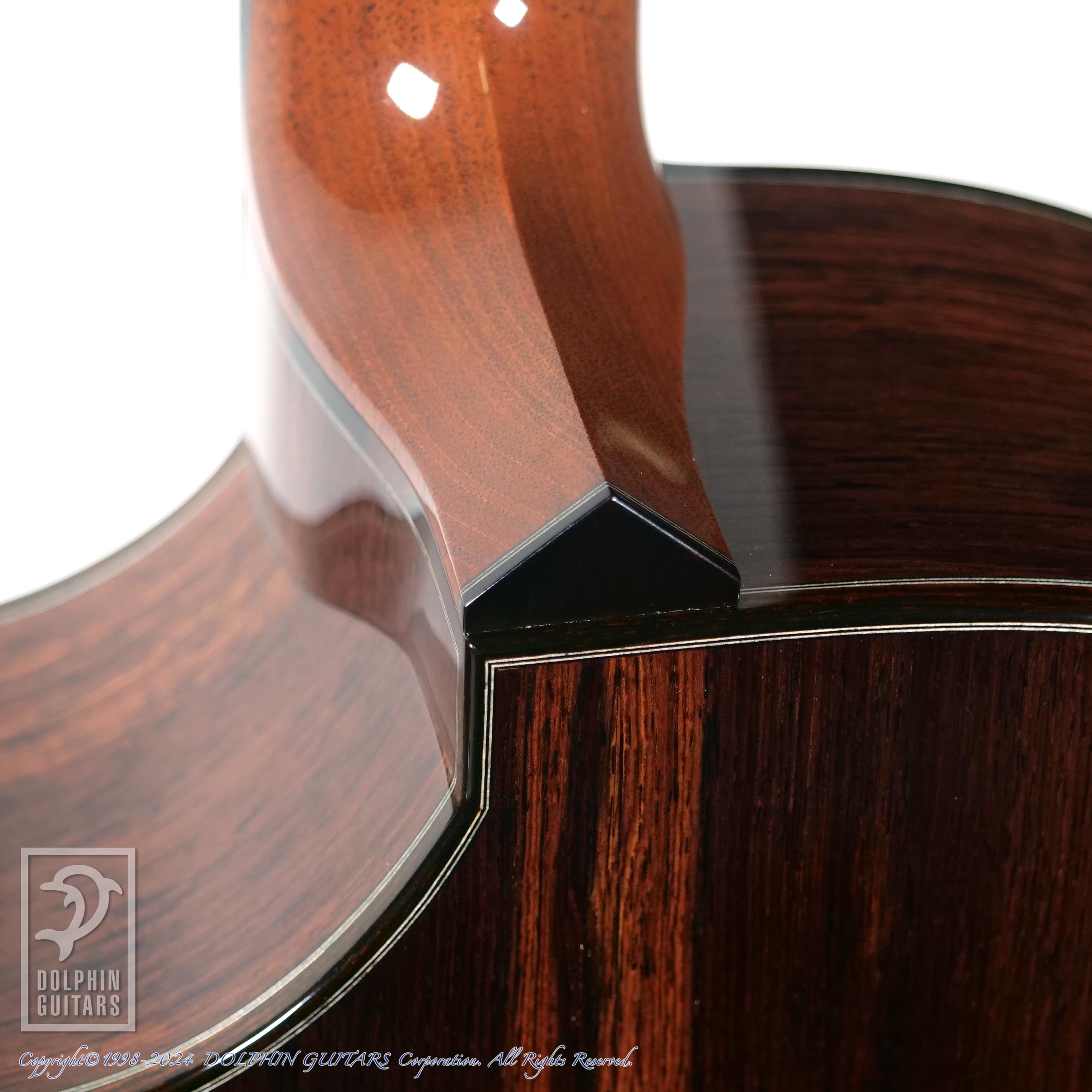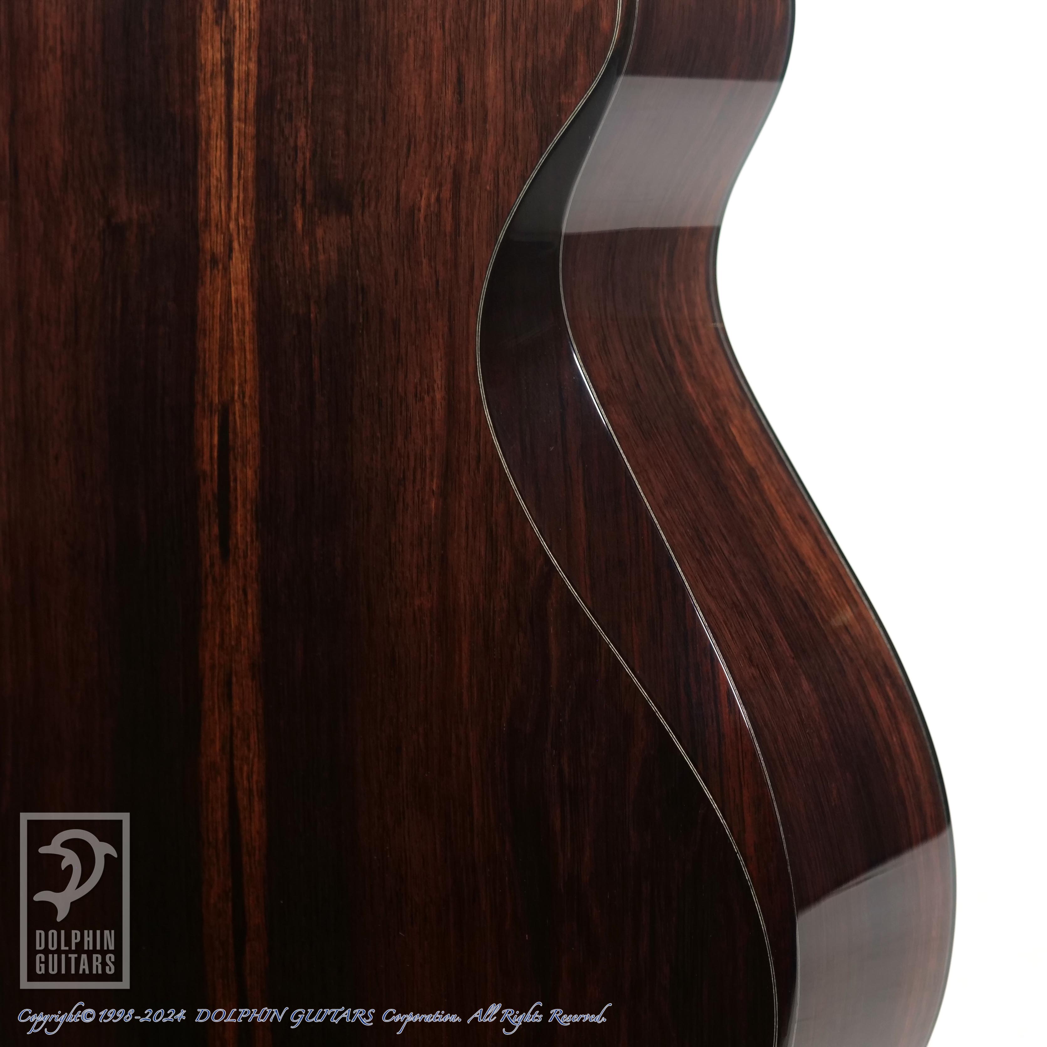 サイドバックのホンジュラスローズウッドは弾力がありながら堅牢な性質を持ち、スティールストリングスの金属質の美味しいところをしっかりと音色に反映させてくれます。しかしここまで濃厚な色味で、細かく目の詰まったハイグレードなホンジュラスローズは、年々市場から姿を消し、今では大変貴重です。低音の迫力、良く通る高音のサスティーン、どのポジションを弾いても心が研ぎ澄まされる様な凛としたサウンドです。ギター一本で聴かせるソロスタイルはもちろん、ギターサウンドを主とする音楽での存在感は抜群でしょう。