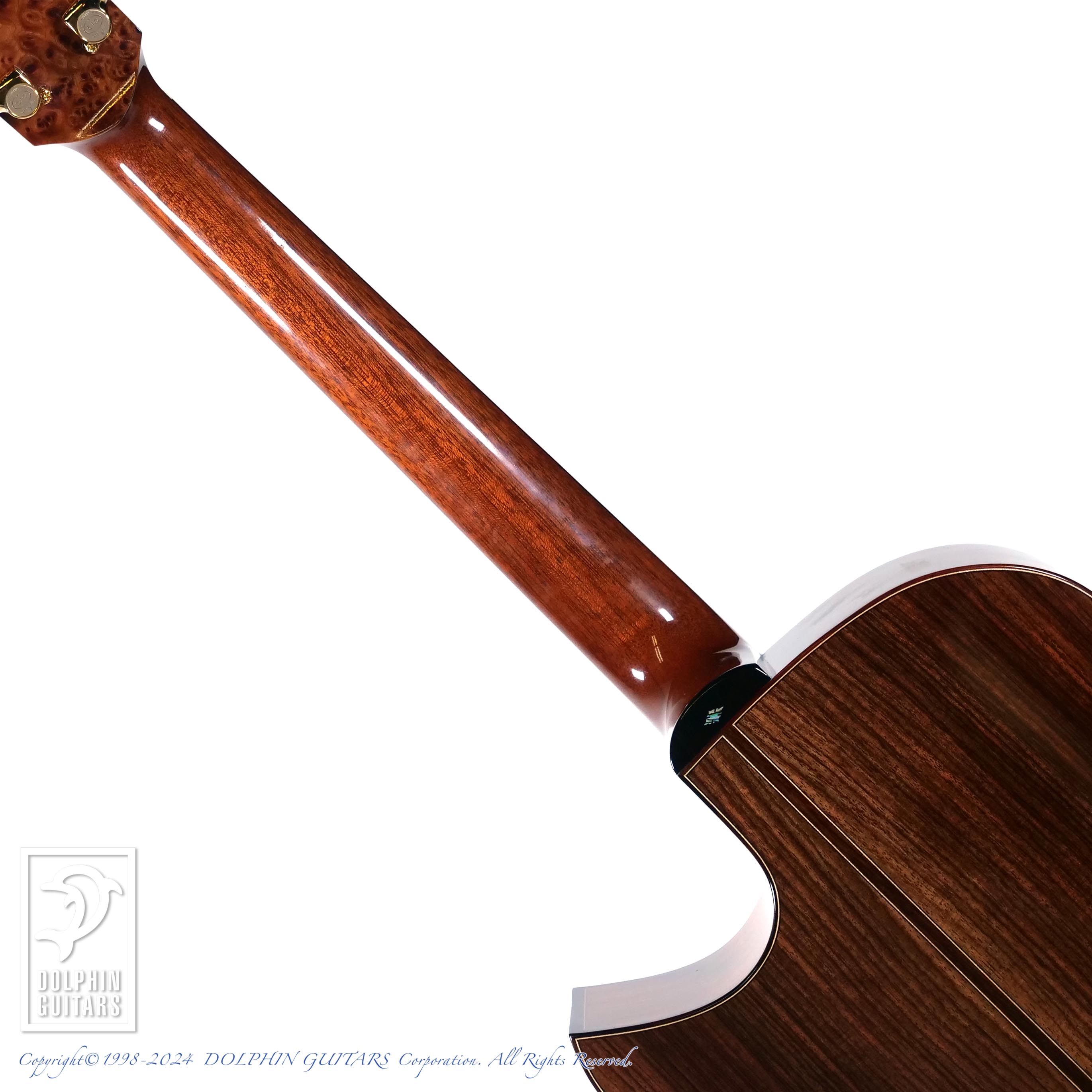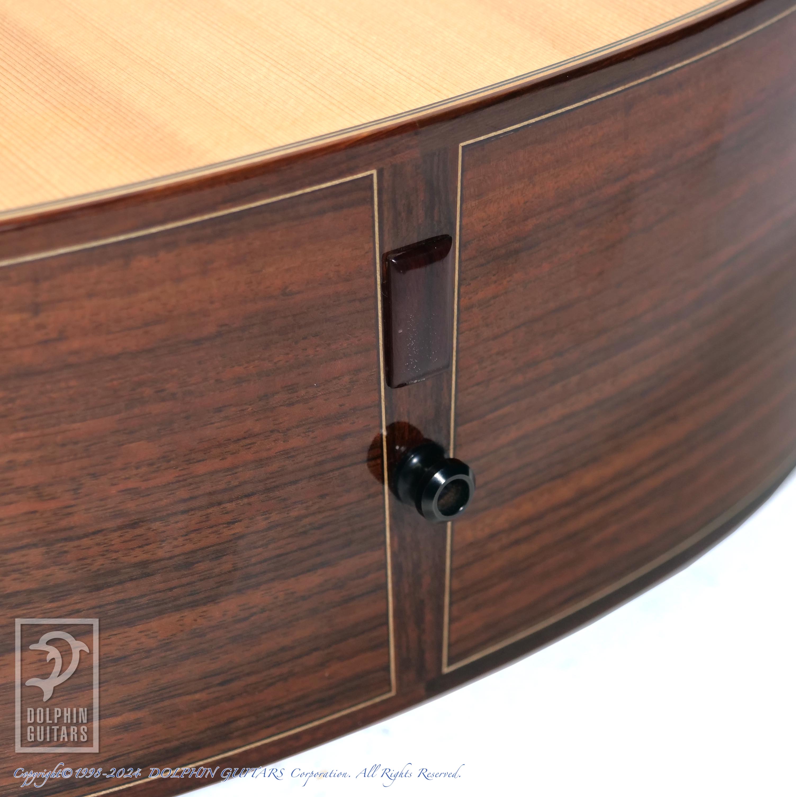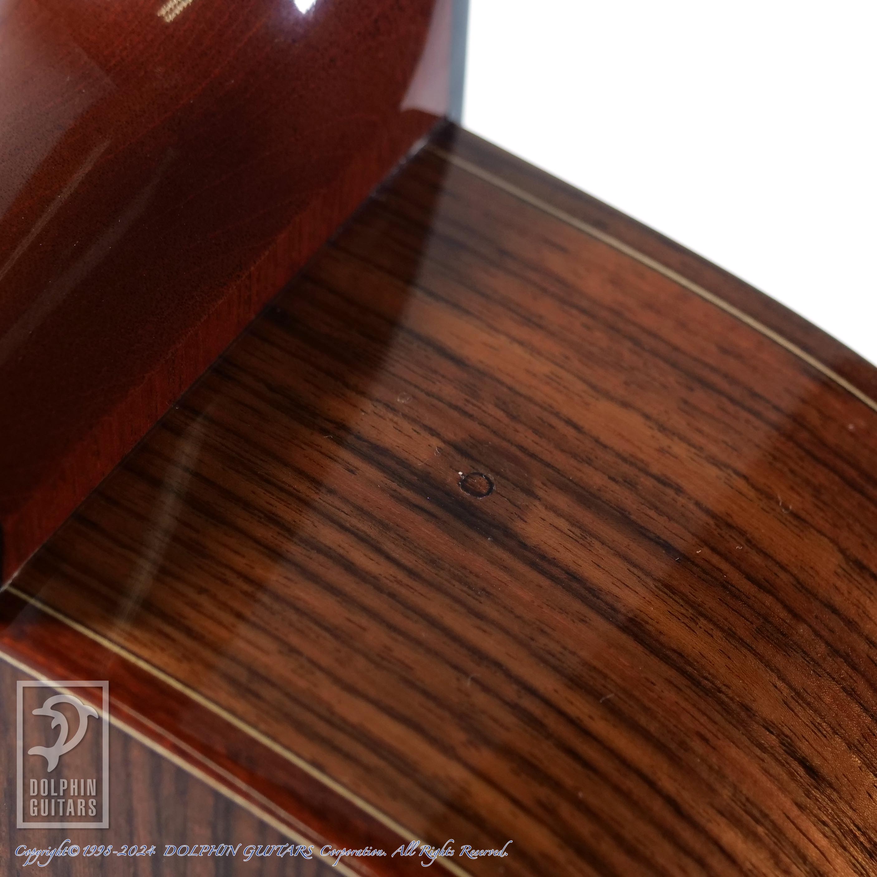 細かいキズはございますが、全体にはまだまだ綺麗な状態での入荷です。演奏面のコンディションも良好です。押尾コータローのストラップピンポジションに穴埋め跡、ペグ交換時の木ネジ埋め跡、ボディエンドにはPU用に開けられた穴をローズウッドで蓋をしております。