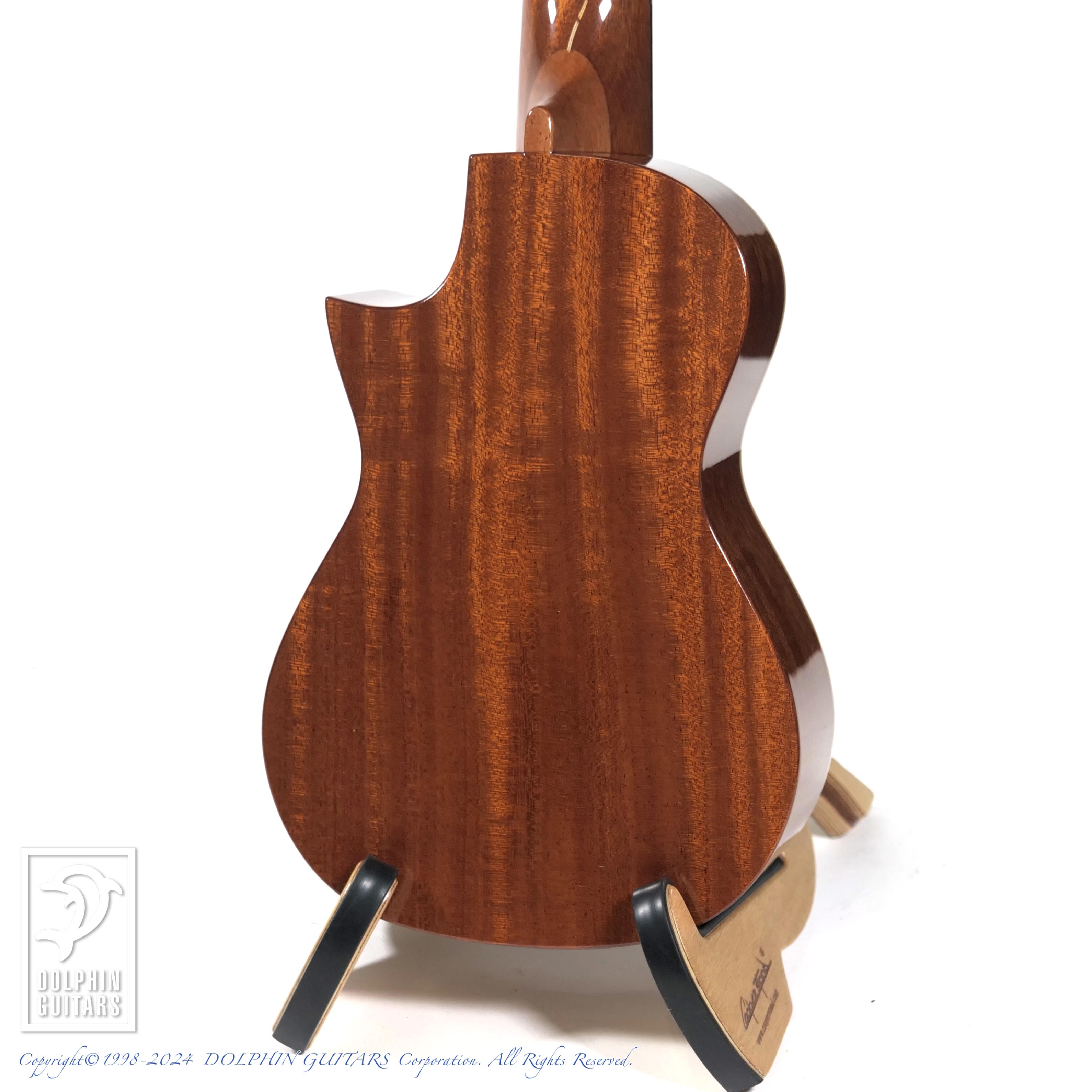ボディは既存の「ソプラノ」「コンサート」といったサイズではなく、またハイポジションでのプレイアビリティを考え、フローレンタインのカッタウェイを施しています。ボディ内部のブレイシングはギター製作で培った知恵を絞って高さ、幅、形状、配置する位置などを熟慮して決定。ネックのスケールもソロ・プレイ時に苦にならない長さに設定されています。