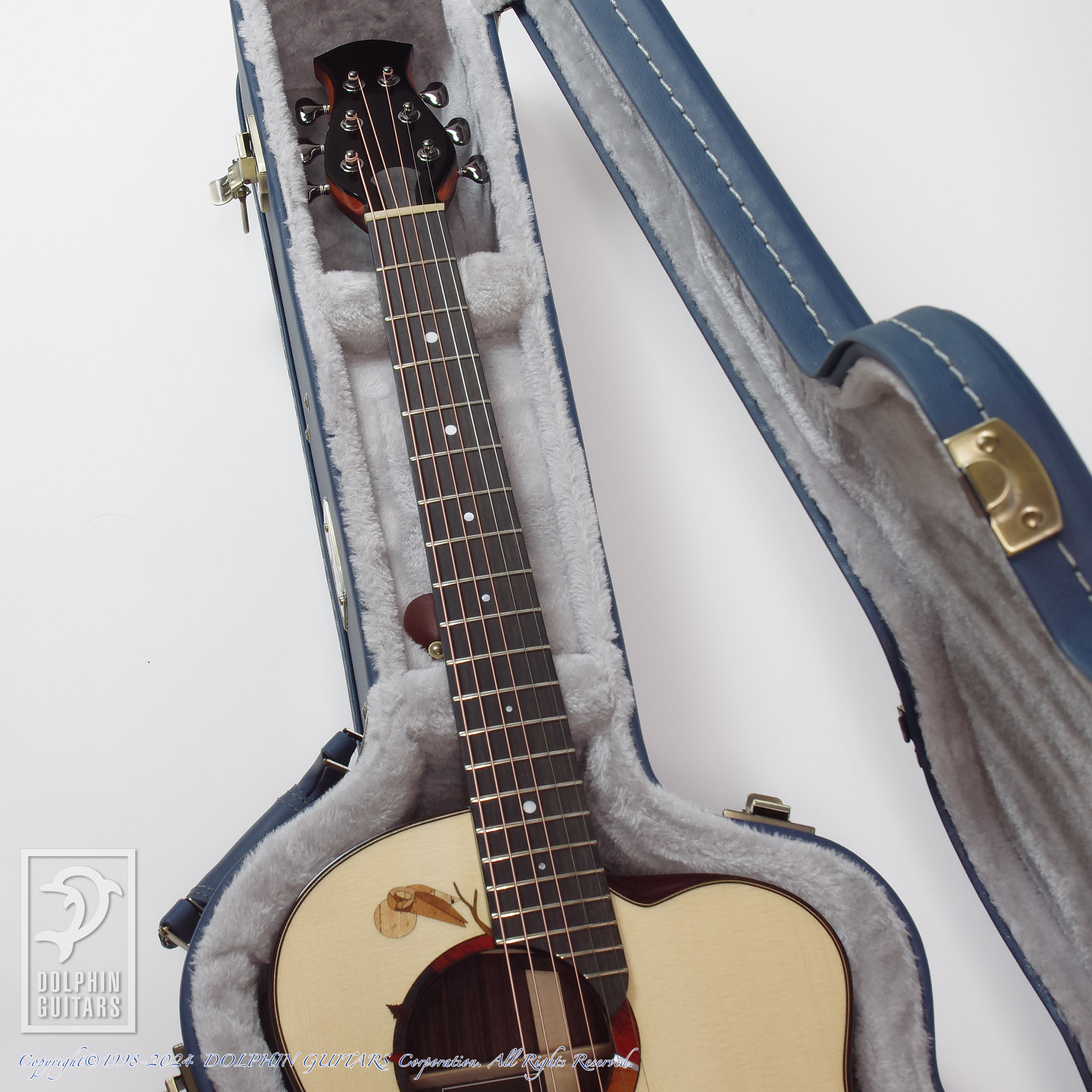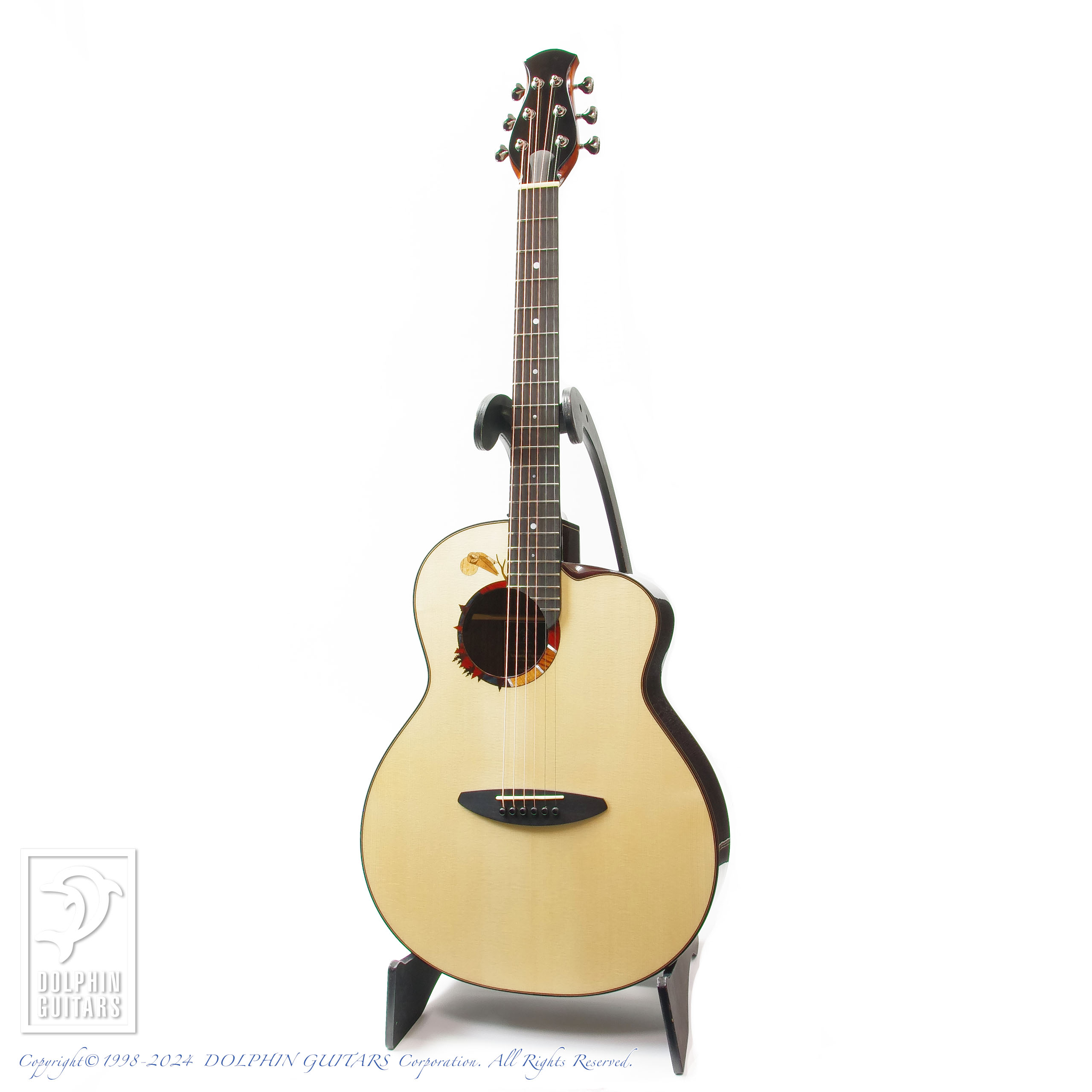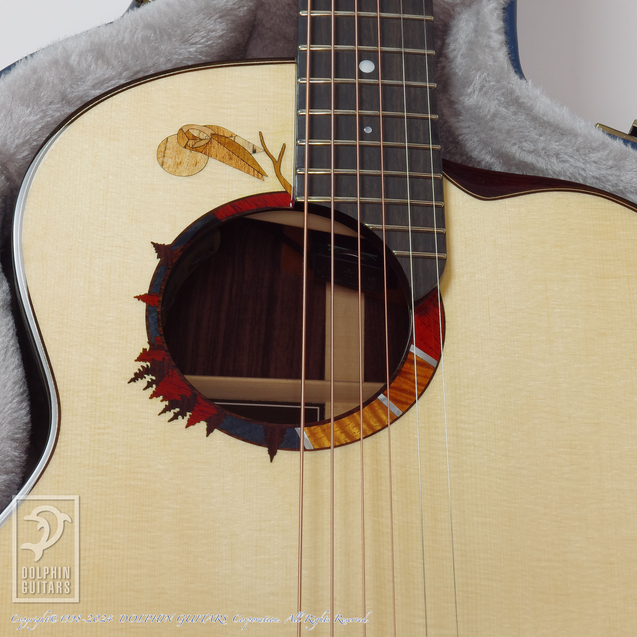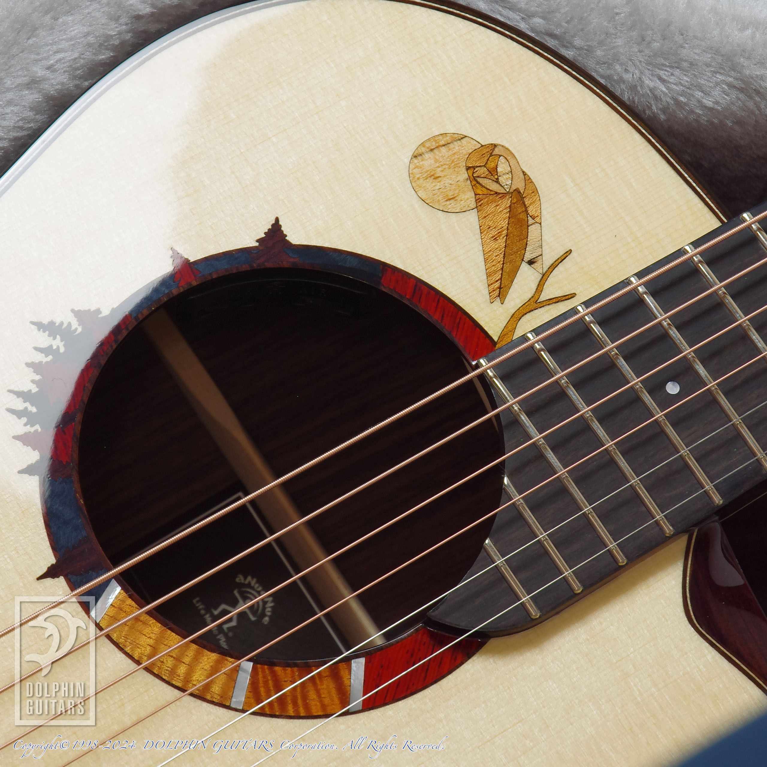 サウンドホールロゼッタはフクロウを象ったアラン・ゴーゴル シグネチャーモデルのオリジナルデザイン。