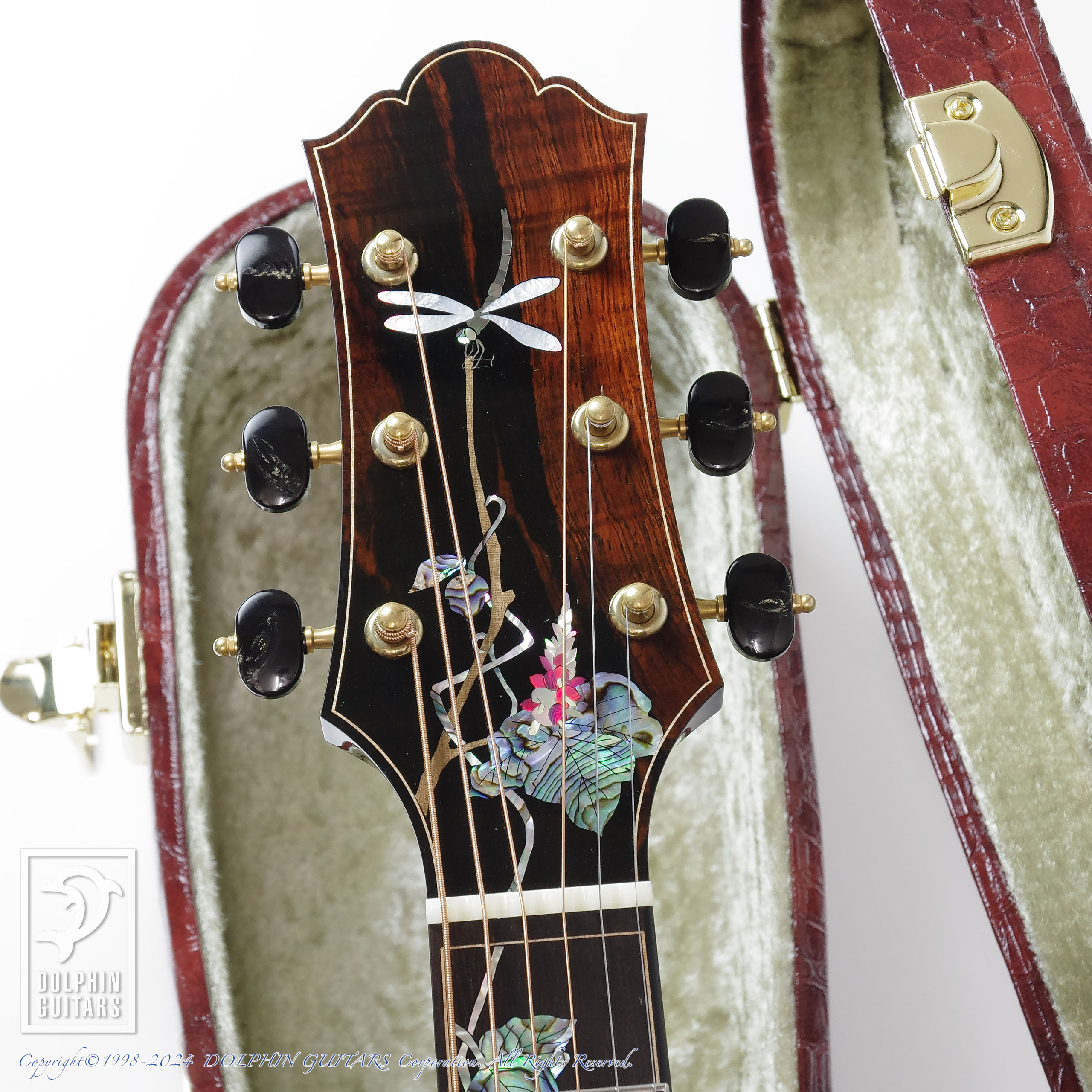 本器は15周年記念モデル、15年の歩みを共にしたOGAWA INLAY CRAFTによる蜻蛉インレイの施されたSJ Cutaway