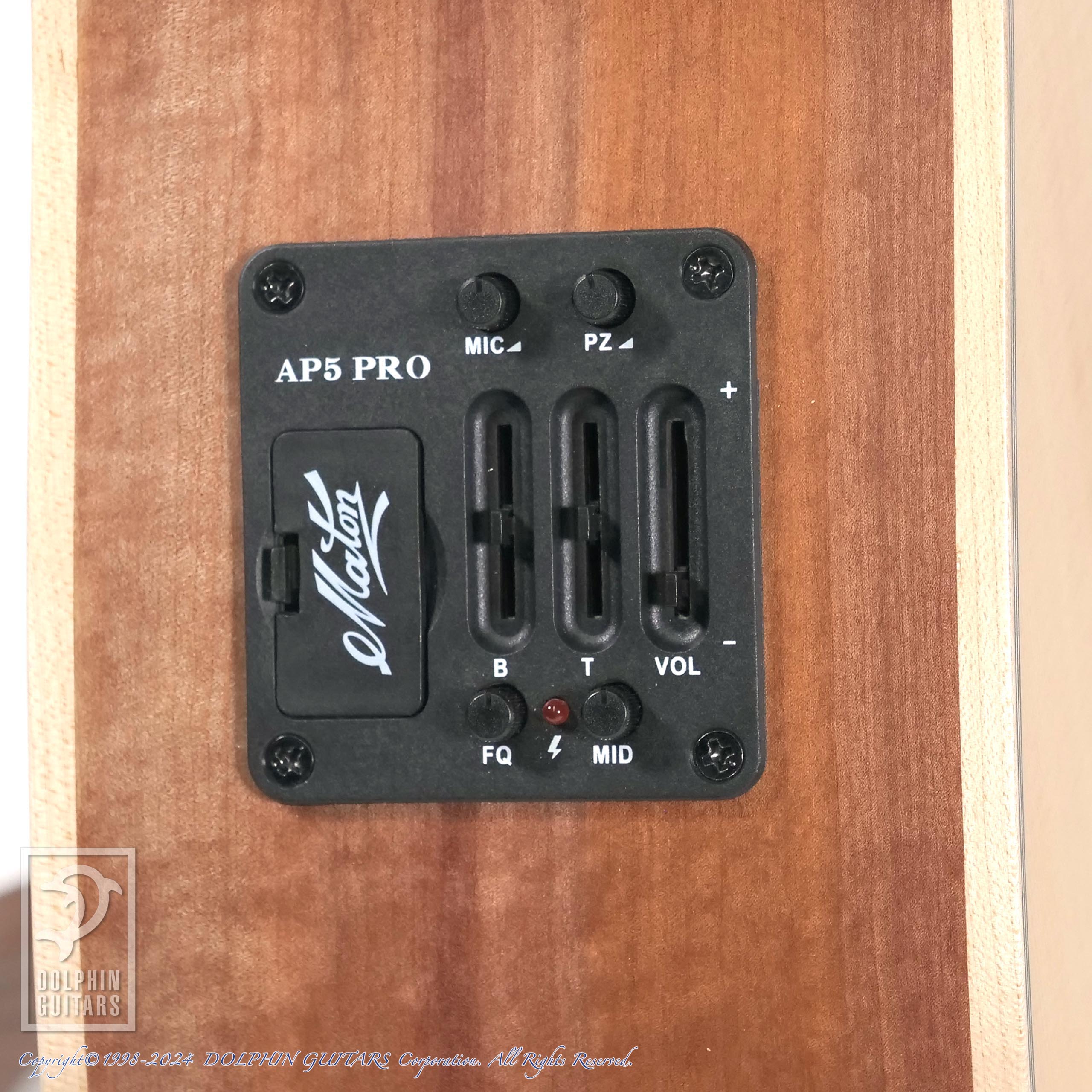 PUシステムはメイトン社オリジナルのAP5 Pro。アンダーサドルPUとコンデンサーマイクを併用する事により、エアー感に加えボディヒット音もアウトプットし、リアルなアコースティックサウンドを出力します。