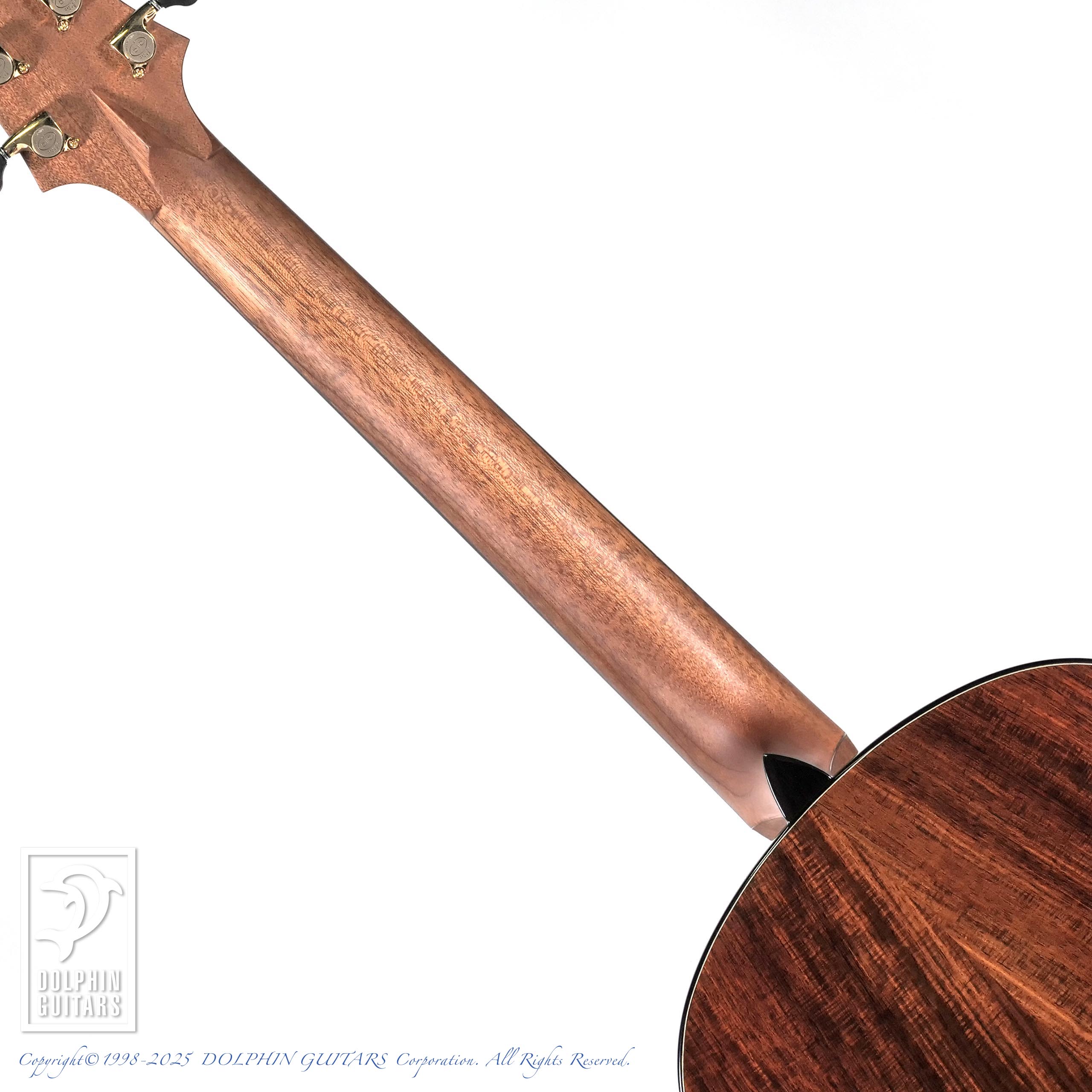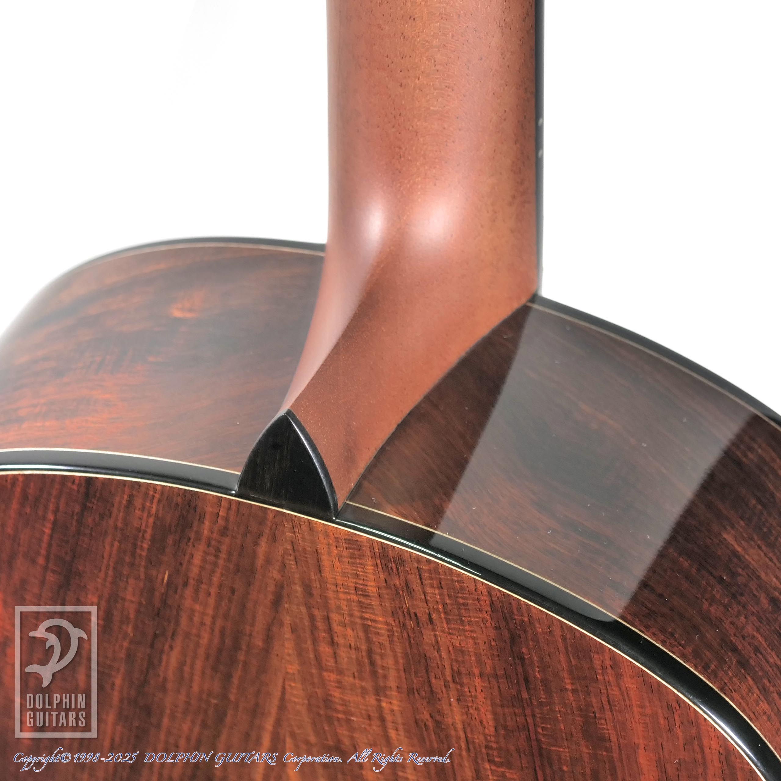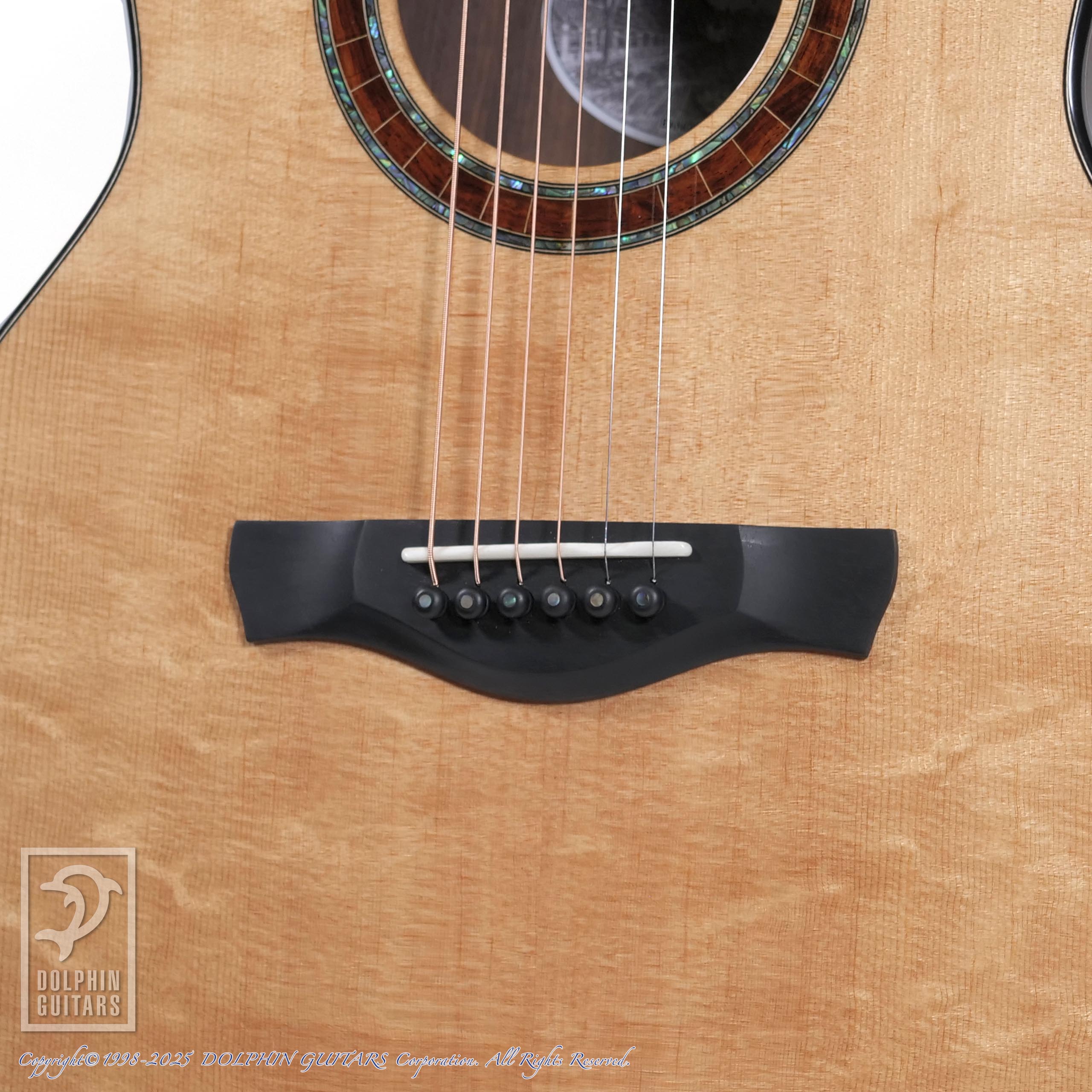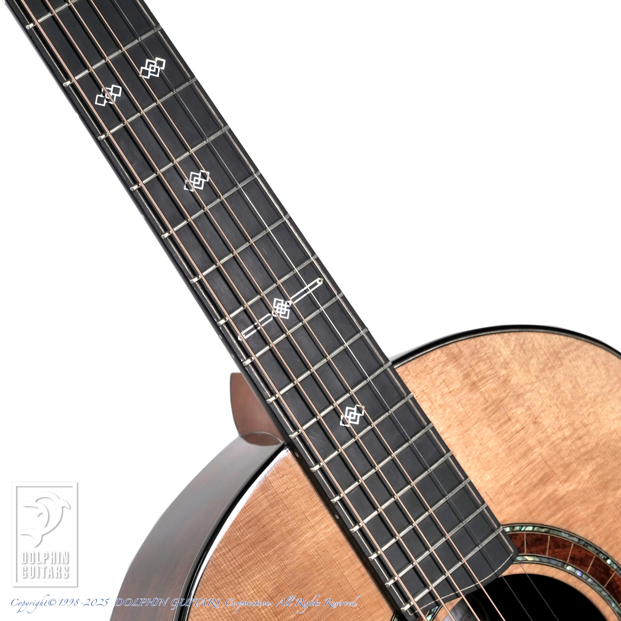 細かくびっしりとフィギャード杢が現れた貴重なSiamese Rosewood(本紫檀)は、赤みのある輝きが美しくうっとりするような素晴らしい木材です。ロゼッタにも使用しており、アバロンとの組み合わせが芸術的です。指板のポジションも繊細で存在感のあるデザインです。