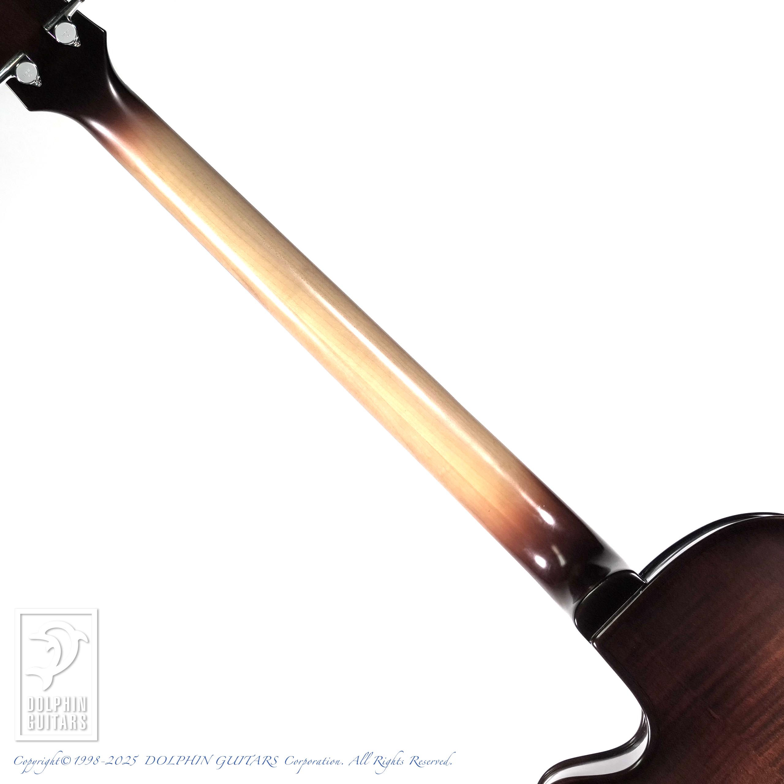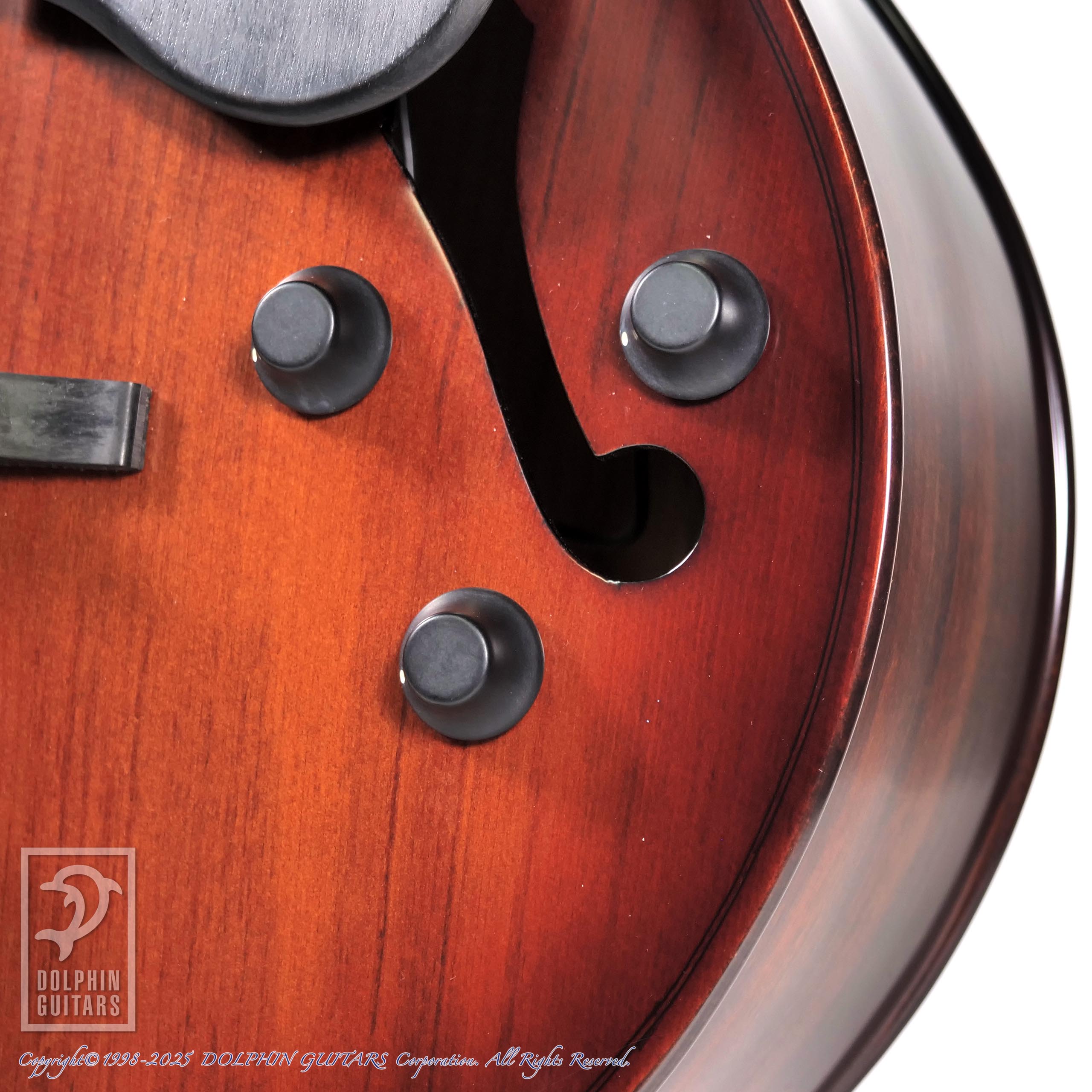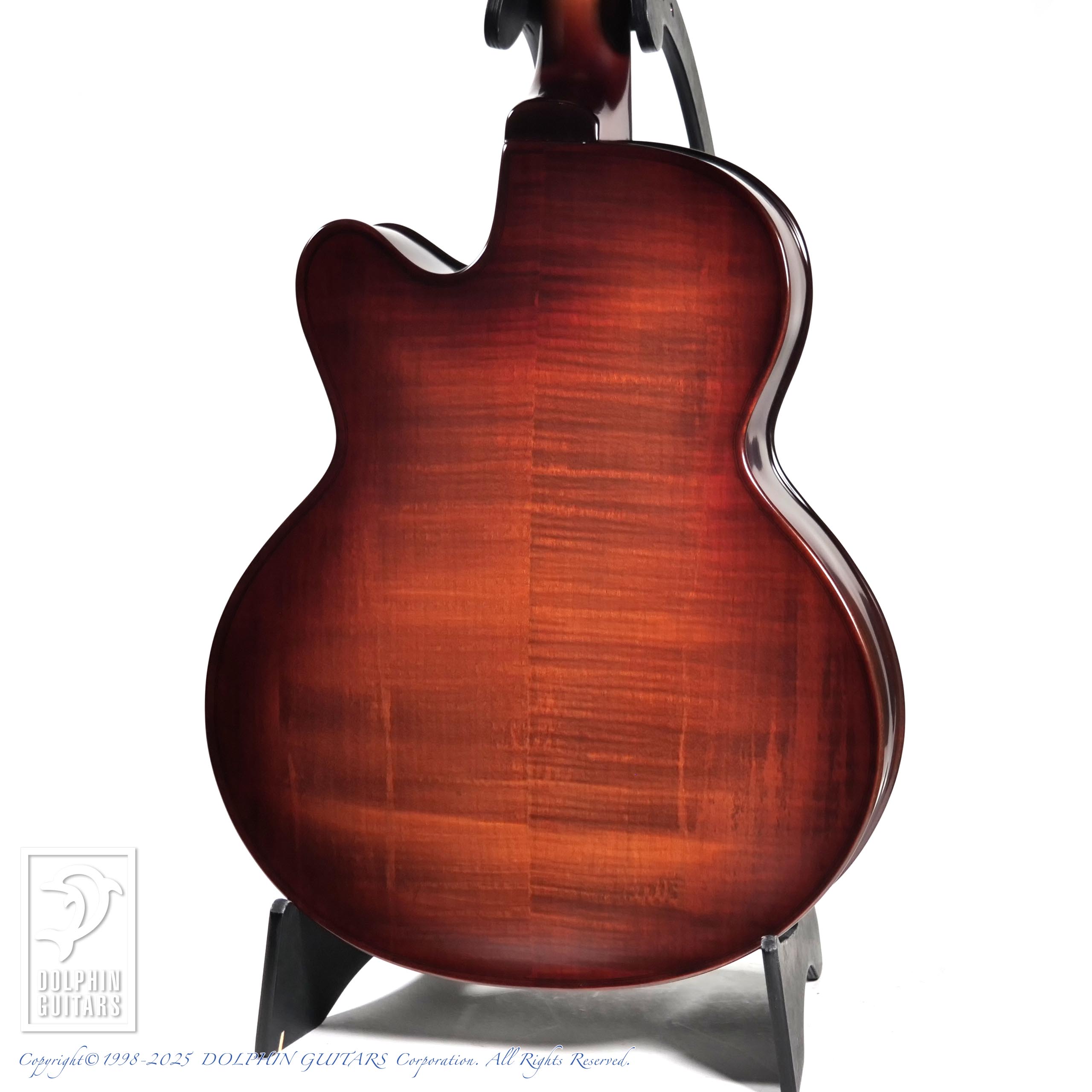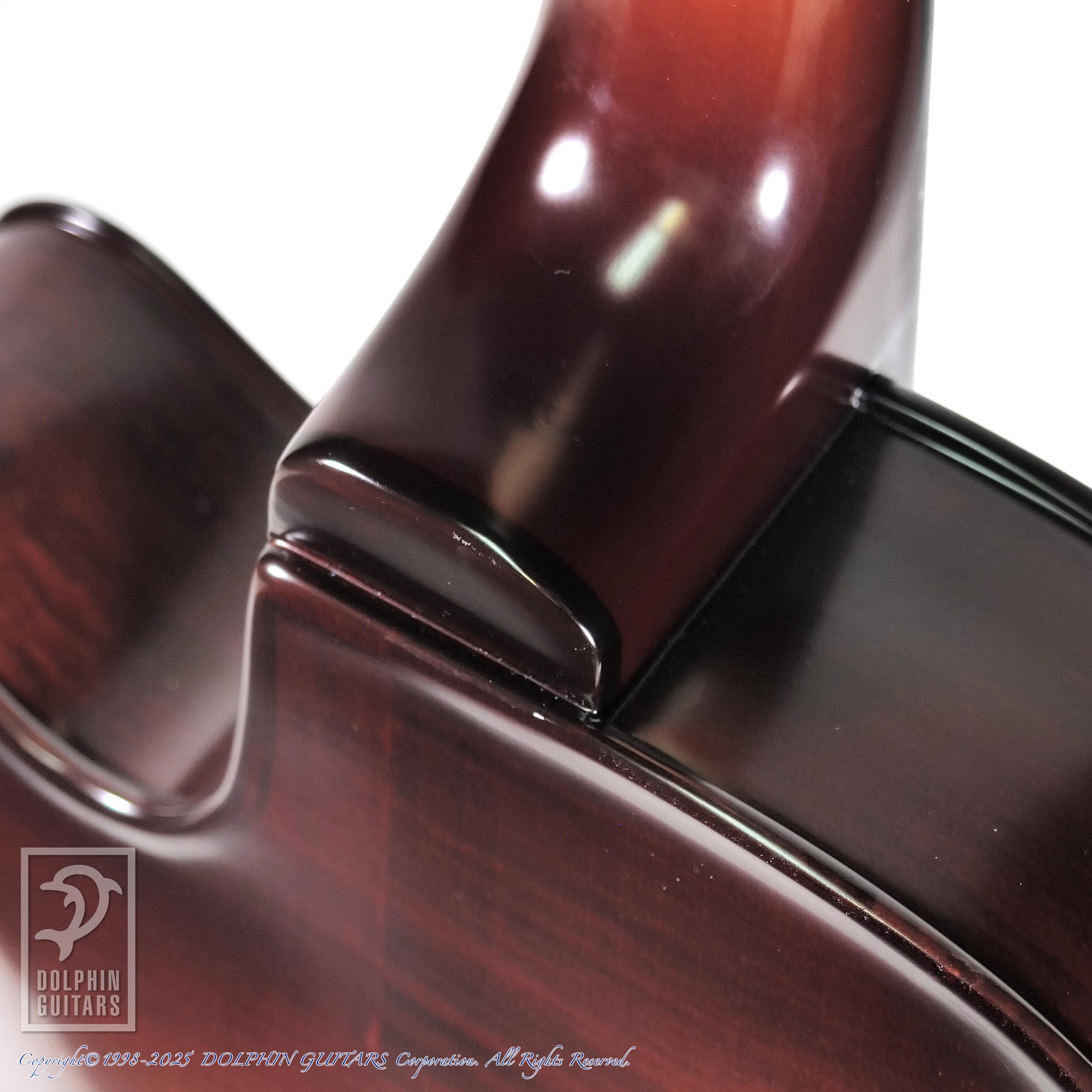 素材からくる木の箱なりを重要ポイントとしているが、通常のアコースティックとは違いジャズギターと同じコンセプトでつくられているので、大きい箱なりから誘発されるハウリングを軽減。ピックアップはネック側にマグネティックのフローティングタイプとブリッジに組み込んだピエゾピックアップをブレンドさせて音作りが可能です。弾き手のタッチの変化にきちっと反応してくれるので、アップライトな響きからソリッドなテイストまで、幅広いニュアンスを表現でき、弾きこむごとにボディの鳴りが良くなっていく経年変化も楽しめます。