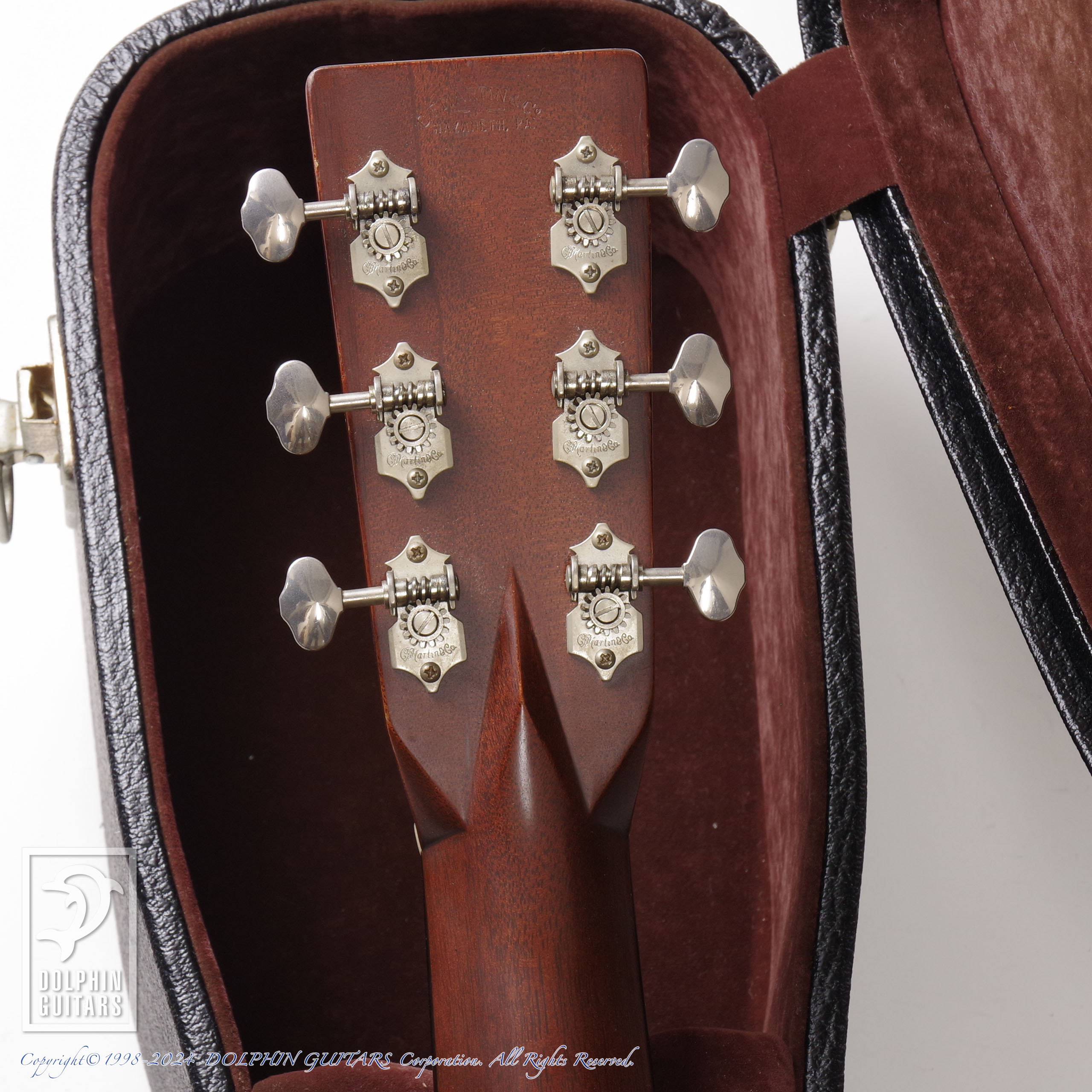 過去に当店にてネック元起きを修正するためのネックリセット・ジョイント部の修正を施し、ナット・サドル作成交換を行っております。現在もネックは反りや元起もなく、ネック周りは素晴らしいコンディションです。ブリッジピンはオリジナルではなく、水牛骨・アバロンドットに交換されております。