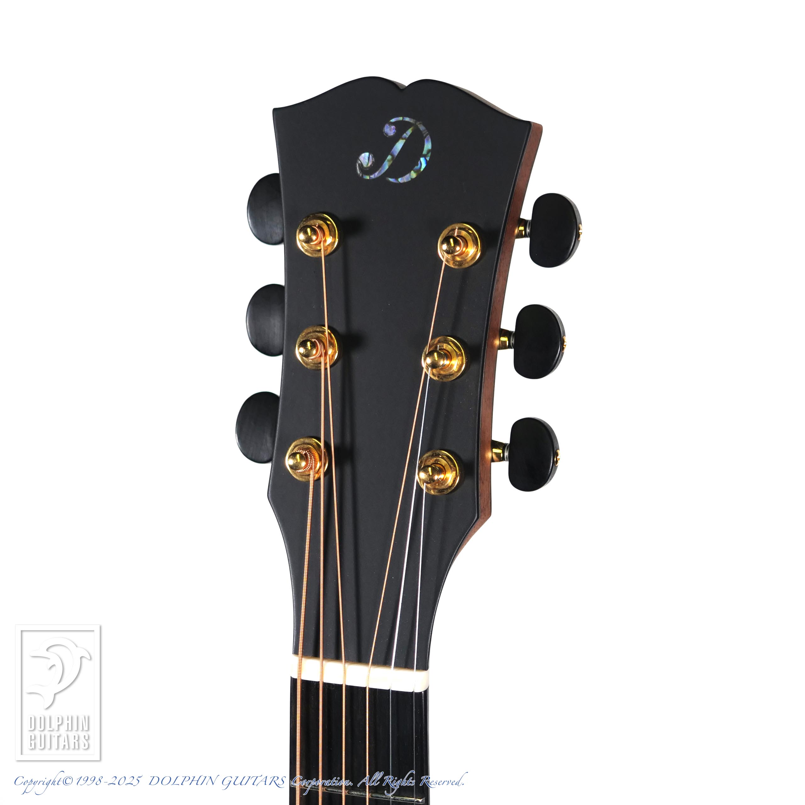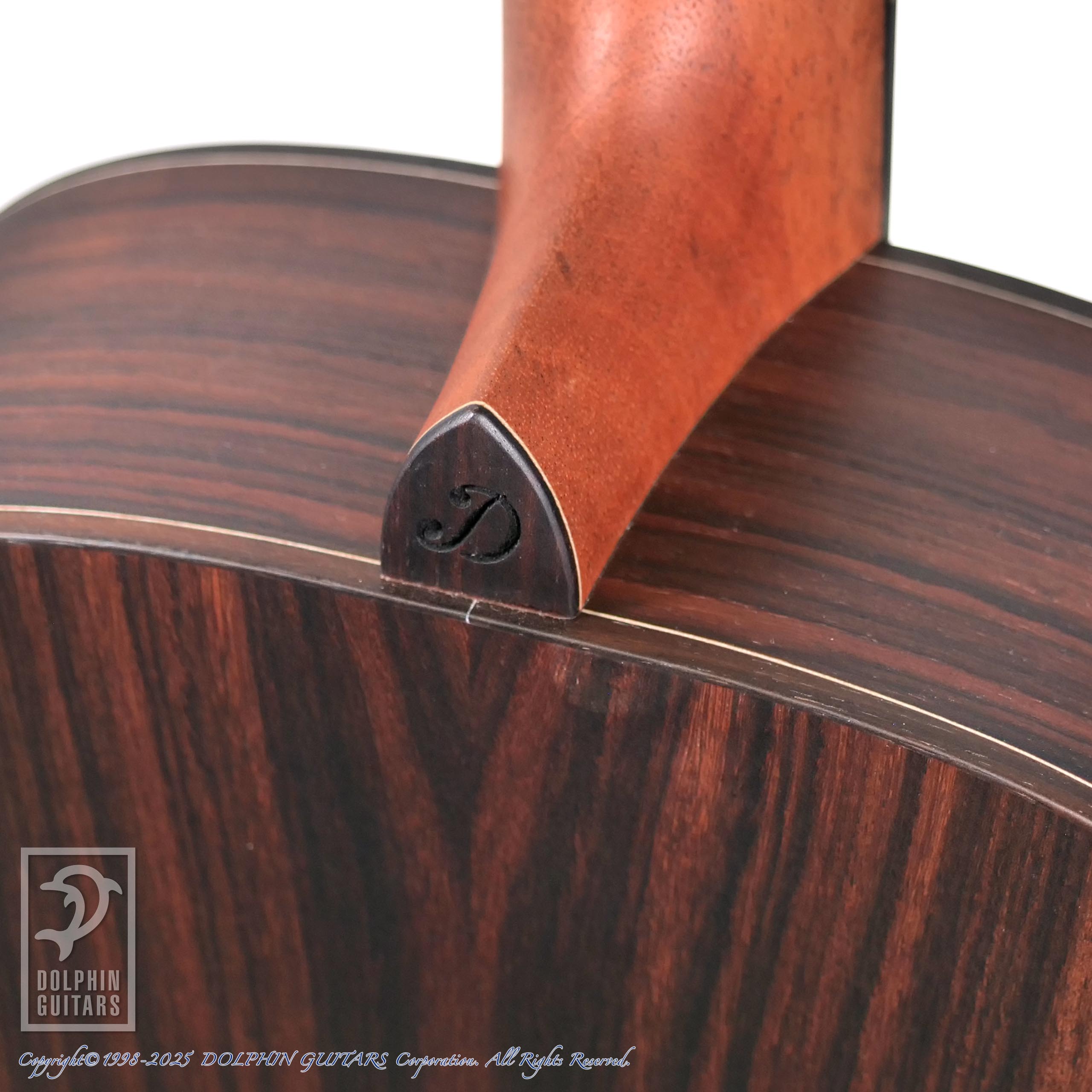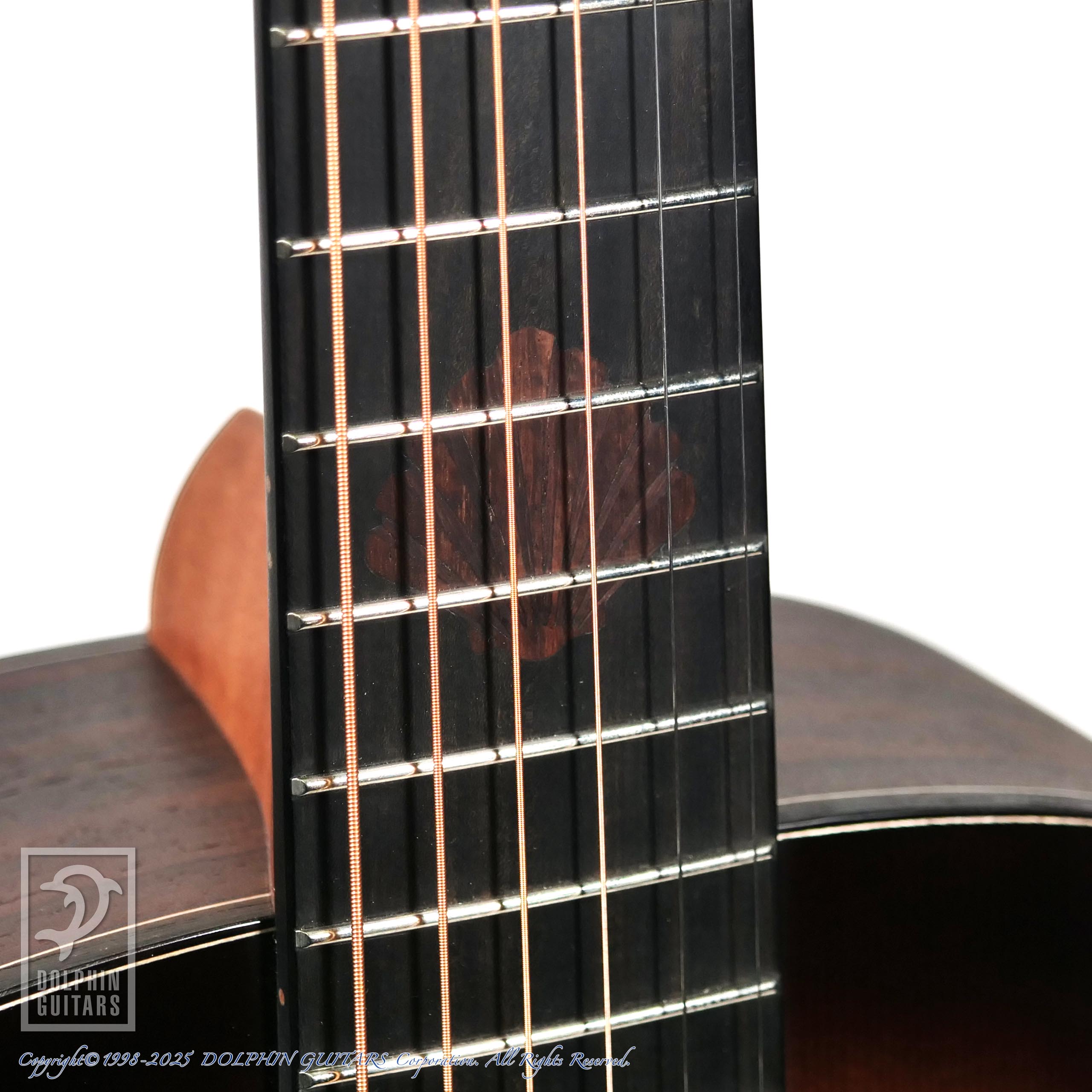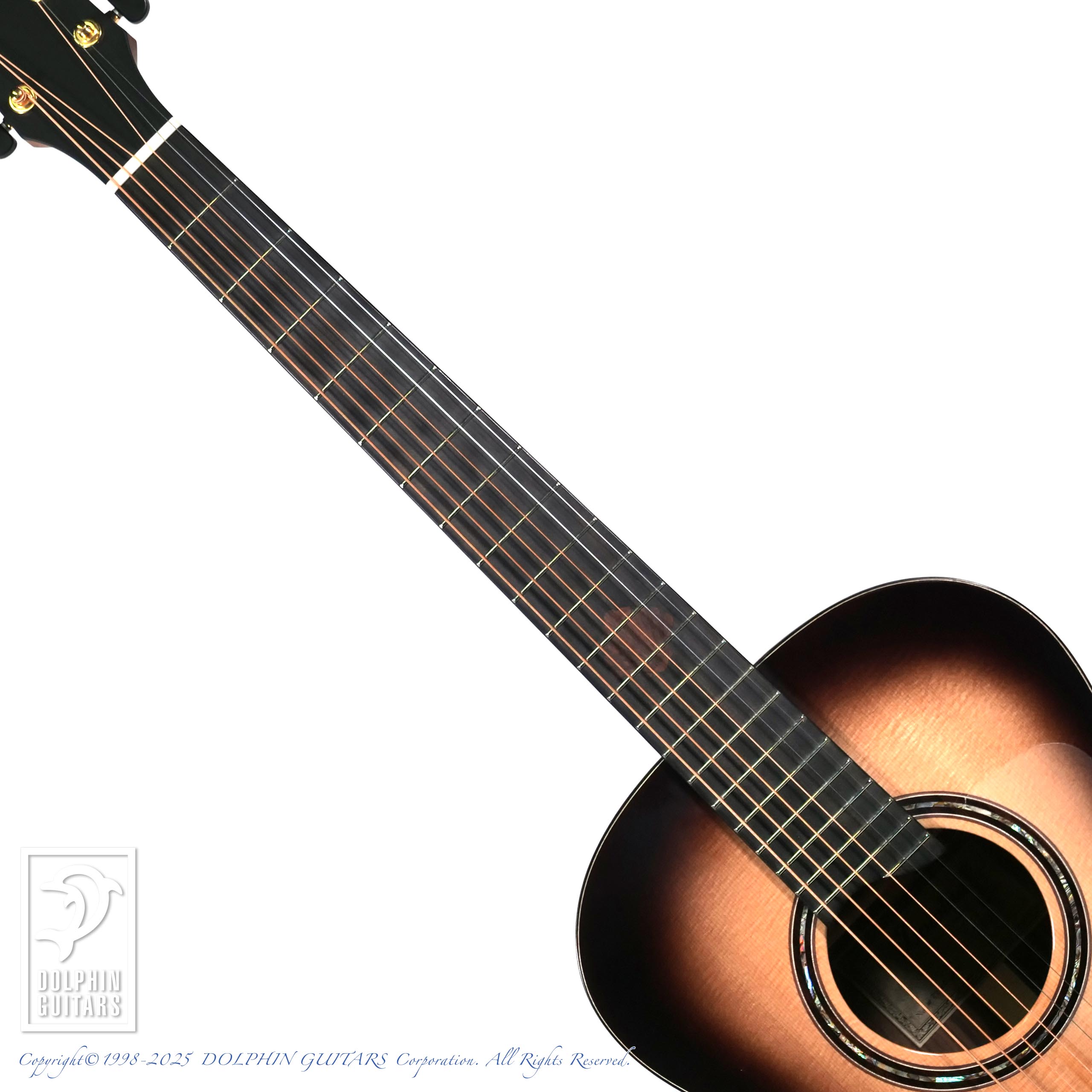 オールド・ストックのシトカ・スプルース材をトップに、インディアン・ローズウッドを組合せたボディ、さらに指板やブリッジ、ヘッド表のみならずヘッド裏までエボニー材を採用した木材へのこだわりも随所に見られる1本で、独特のサンバーストも手作りならではの味のあるフィニッシュです。