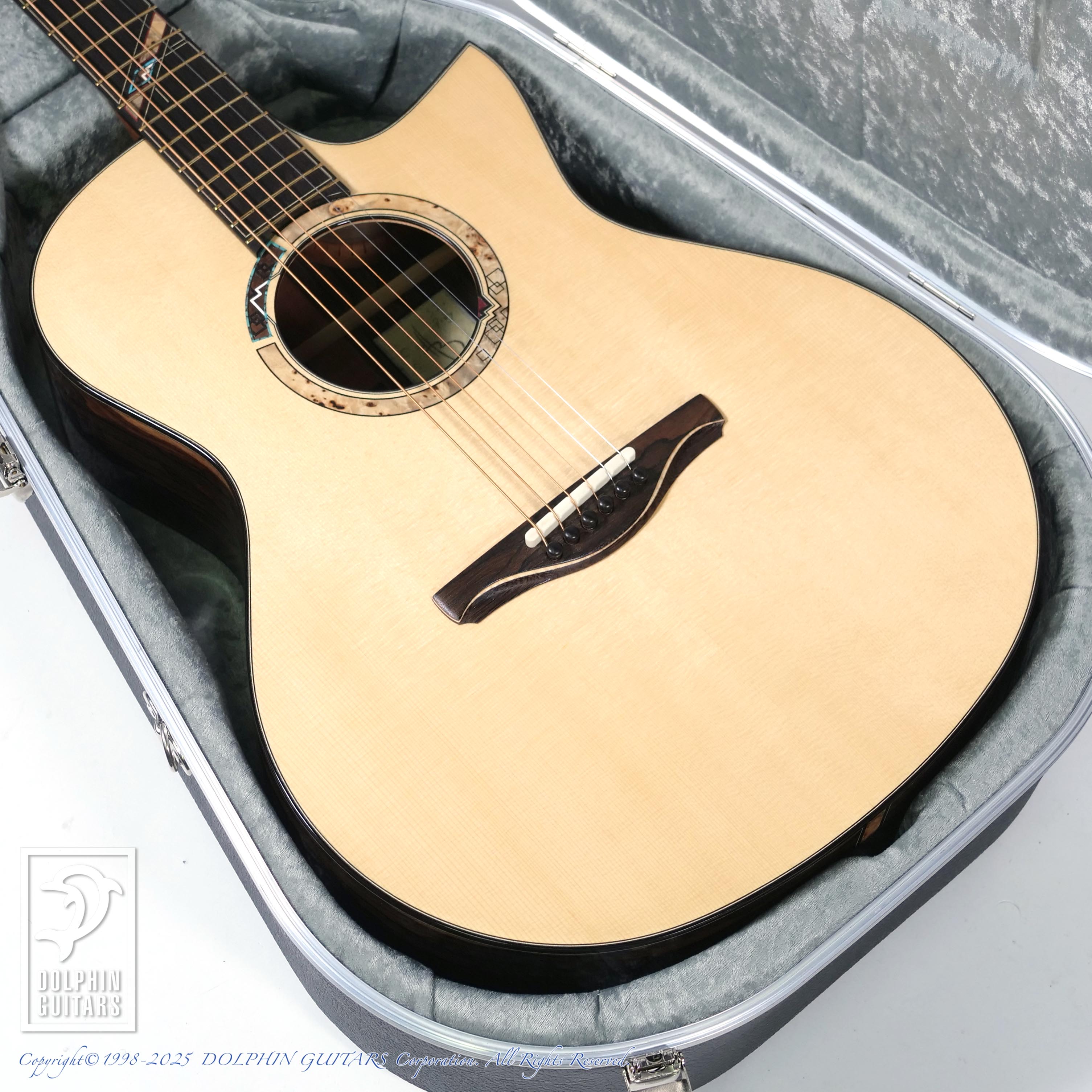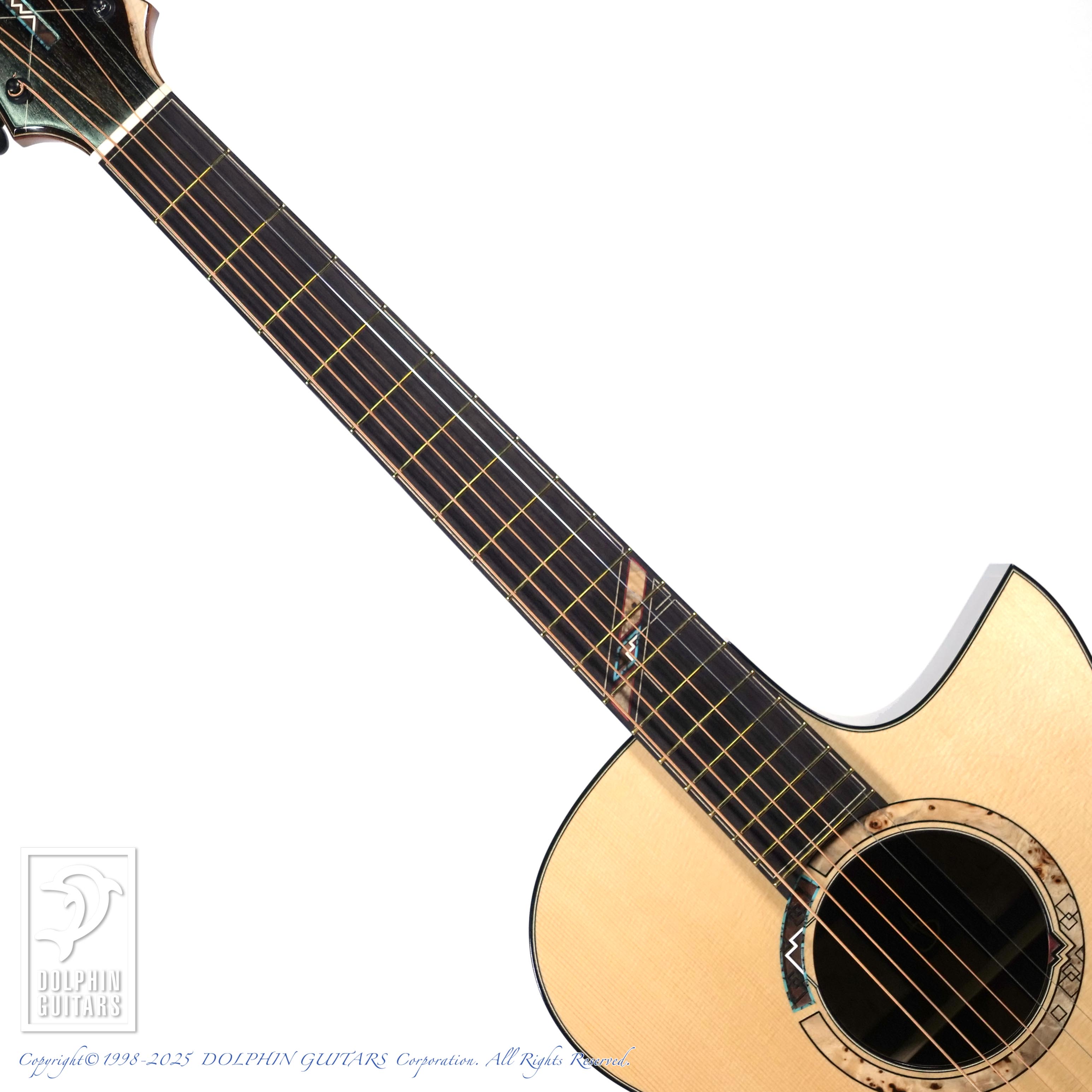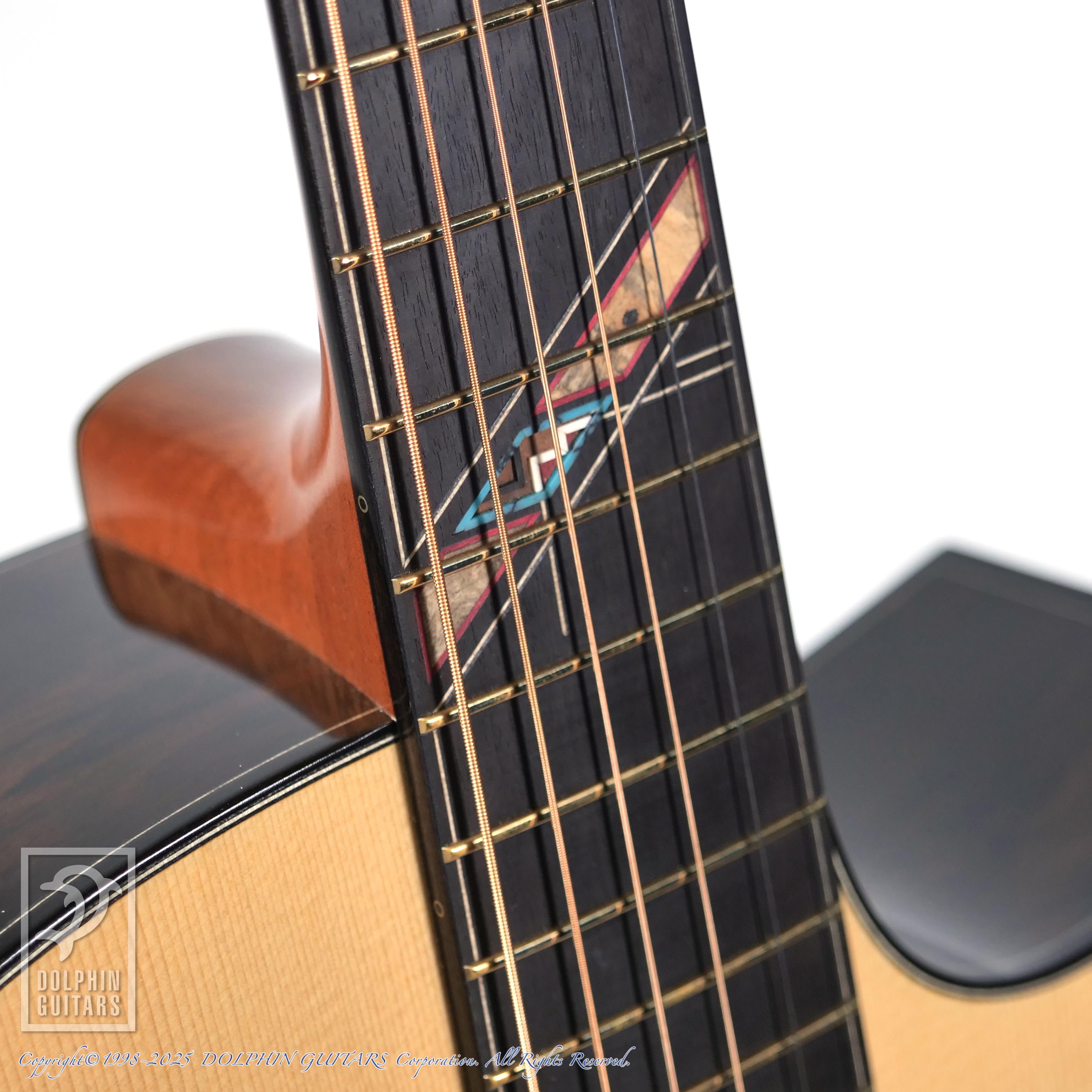 何よりも驚きなのがそのサウンド。サイドはダブルレイヤーで、ラティスブレイスのトップを大きく揺らしていることが分かるラウドな鳴りですが、それは完全にコントロールされており、輪郭がしっかりと認識できるタイト低音は素晴らしいの一言。質量や伝達を考慮し、トップブレイスにはトリファイドシトカスプルース、バックブレイスにはジャーマンスプルースが用いられております。また、音の芯も逞しく、高音域も痩せる事なく太さがあり、優しいタッチでも十分な迫力を得られます。