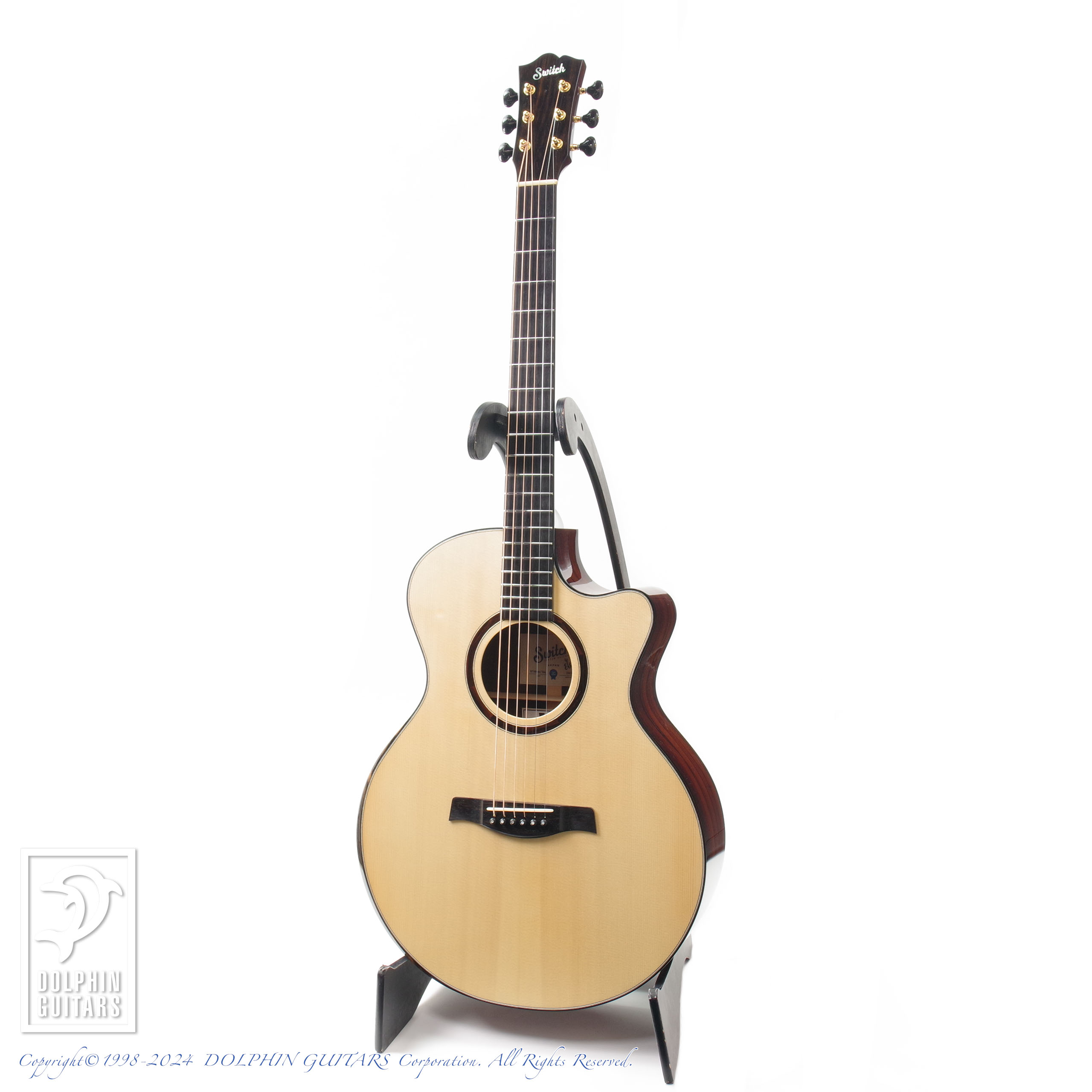 オリジナルカッタウェイ、エボニーバインディング+エルボーコンター仕様、フレットには耐久性、操作性に於いて抜群のアドバンテージを誇るSWITCHオリジナルステンレスフレットを採用。