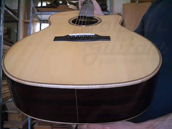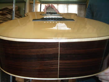 お分かりになりますかね・・・微妙にトップがアーチを描いています。弦の張力でアーチを描くのでは無く、こういう設計です。よく言われるドーミングとも異なります。説明を書くのは困難なので、店頭で説明します(笑)
